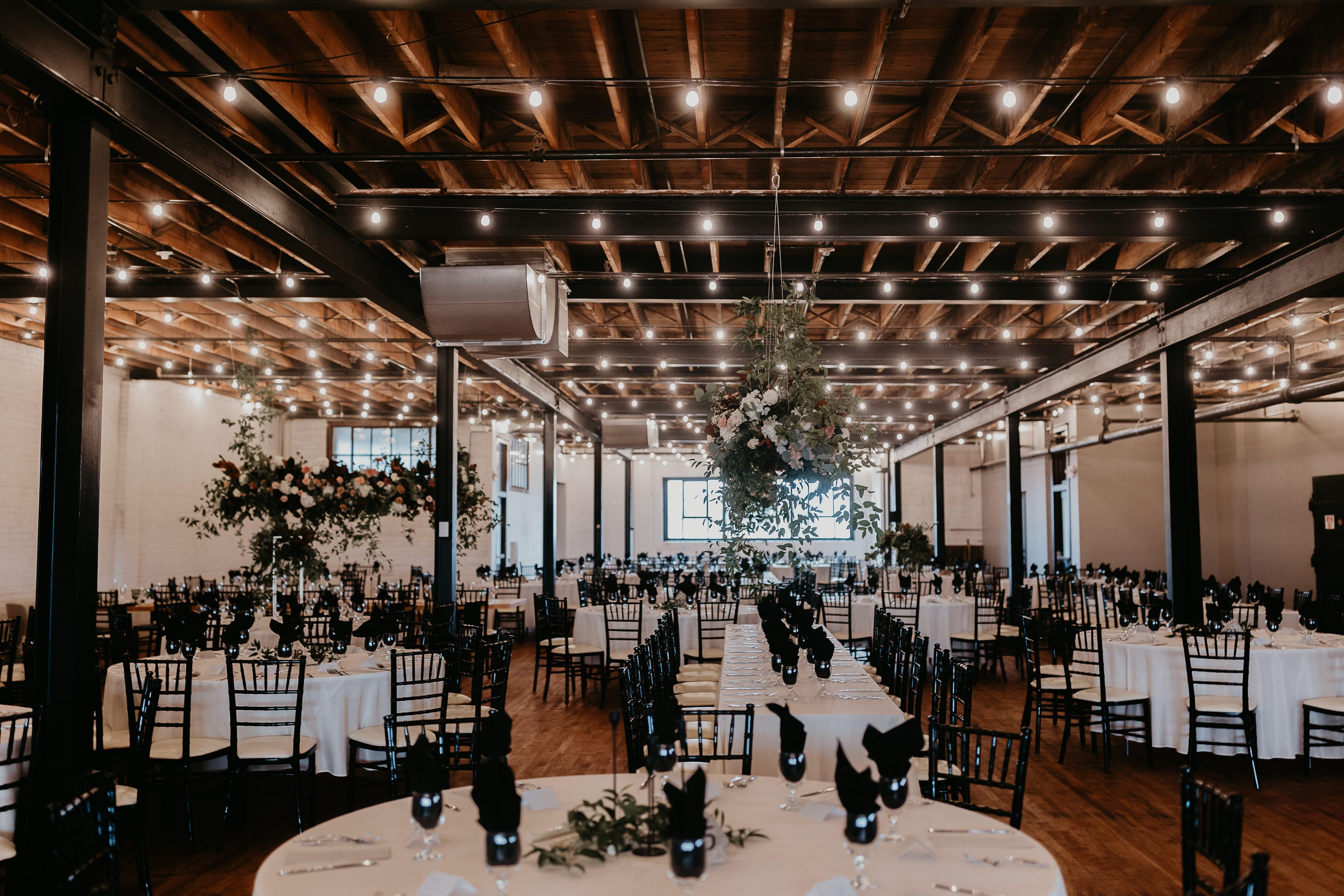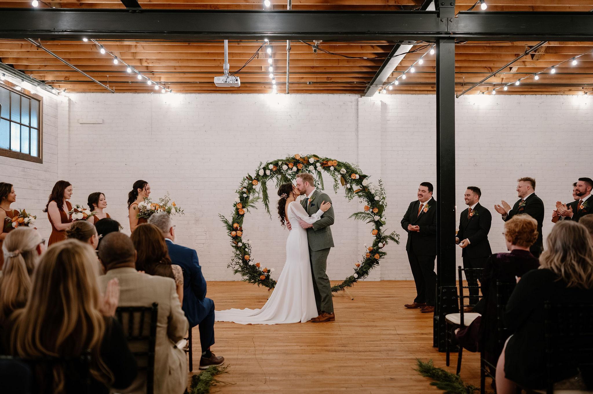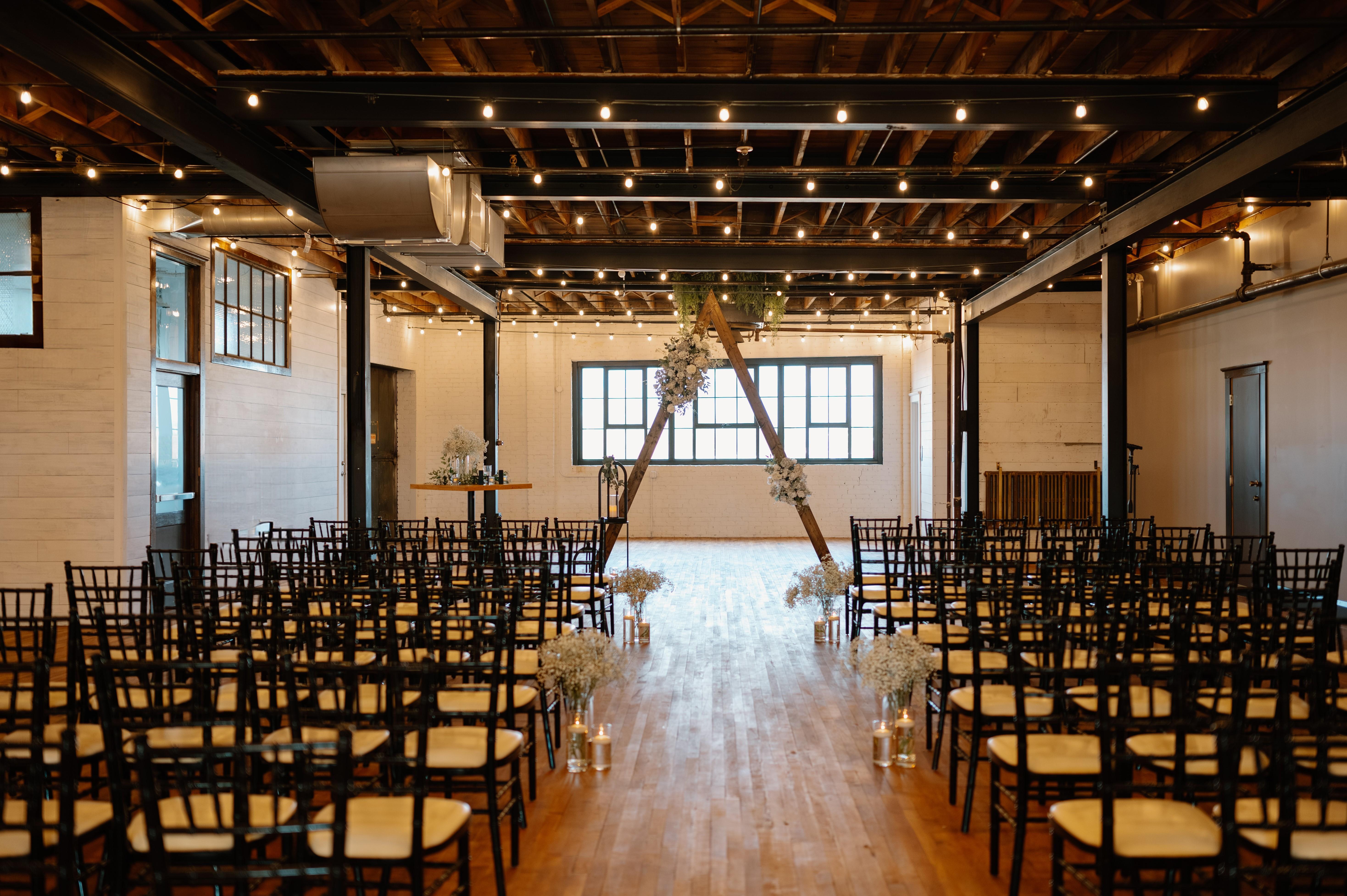 Both our East and North ceremony options are held in the reception space. This option is more "horizontal" while the East option is more "vertical." This space allows you to use the white brick wall as a blank canvas backdrop. After the ceremony we direct guests to the cocktail space and flip the entire space for the reception.