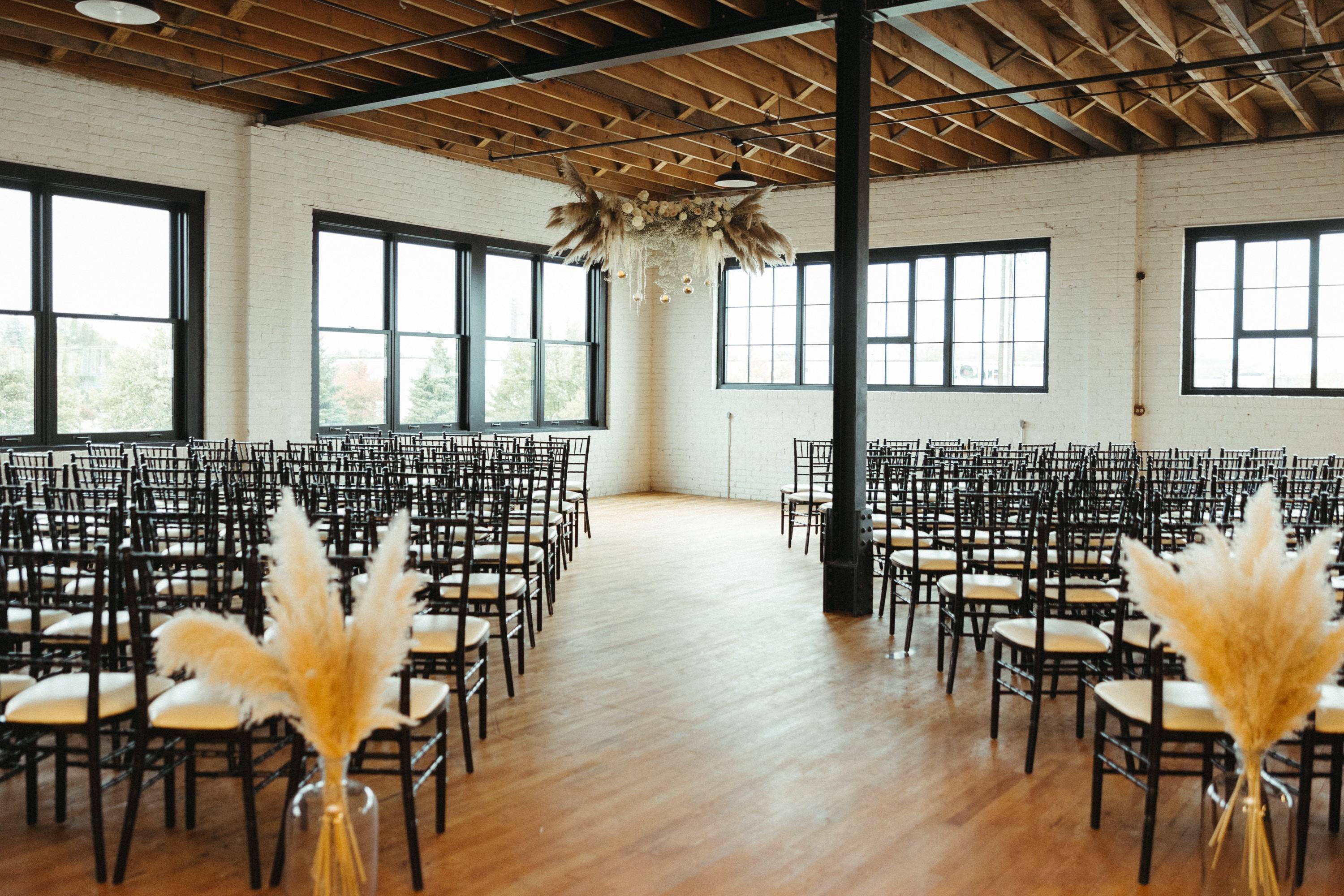 This space is our most popular ceremony option with beautiful East facing windows as a backdrop. After the ceremony we direct guests to the cocktail space and flip the entire space for the reception.