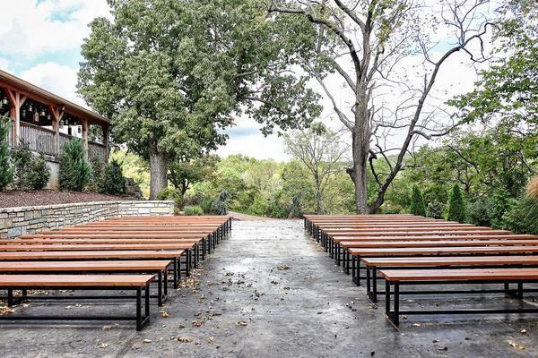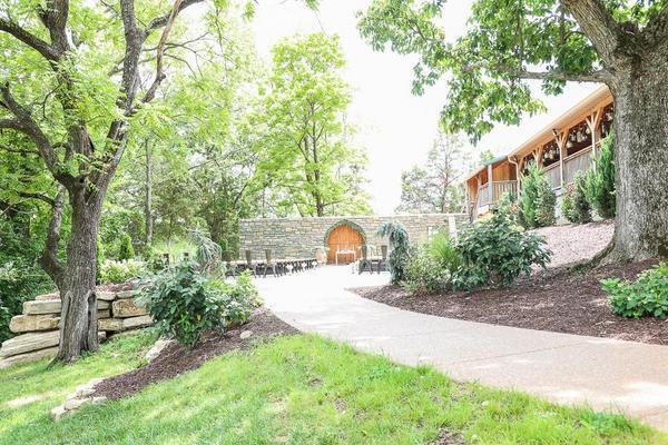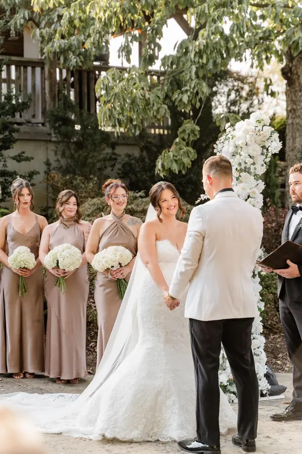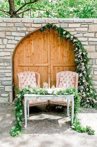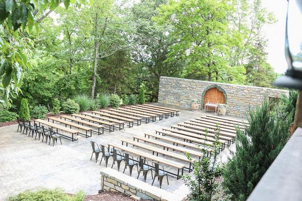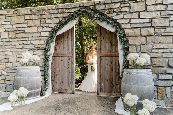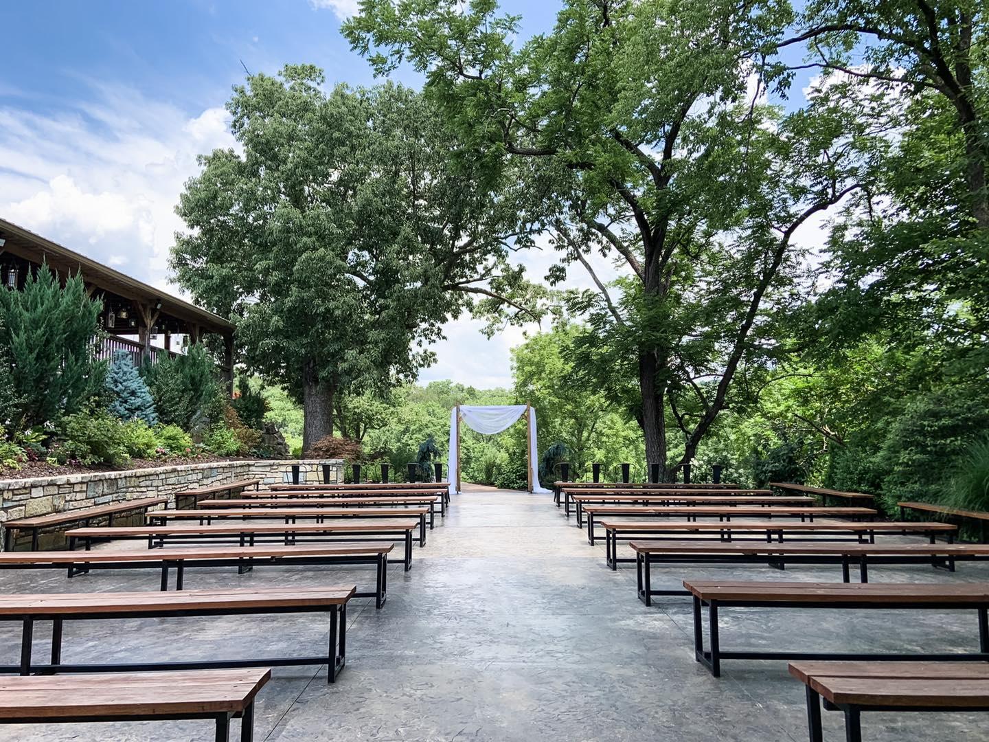 Our outdoor ceremony space was designed with our brides in mind. With two entryways, brides can decide whether they want to get married with their ceremony in front of our wooden doors and gorgeous stone wall OR they can choose to have their ceremony under the tree canopy and walk through the wooden doors. We also have various arbors and large ceremony decor pieces on-site for couples to use (yes included in the rental fee).