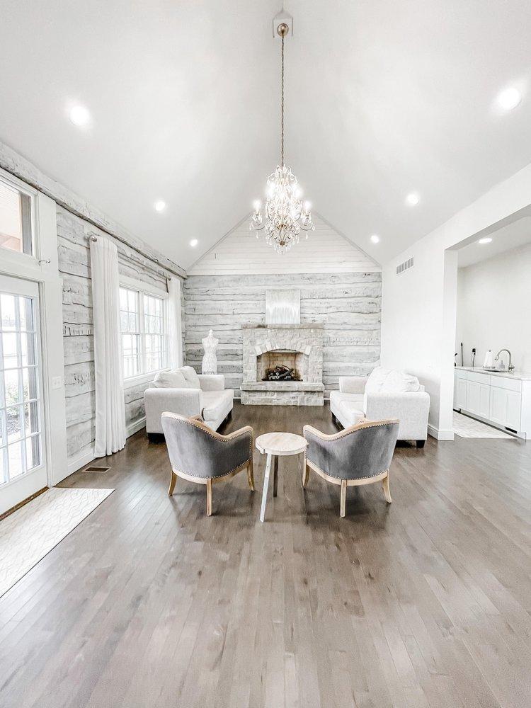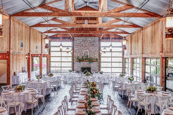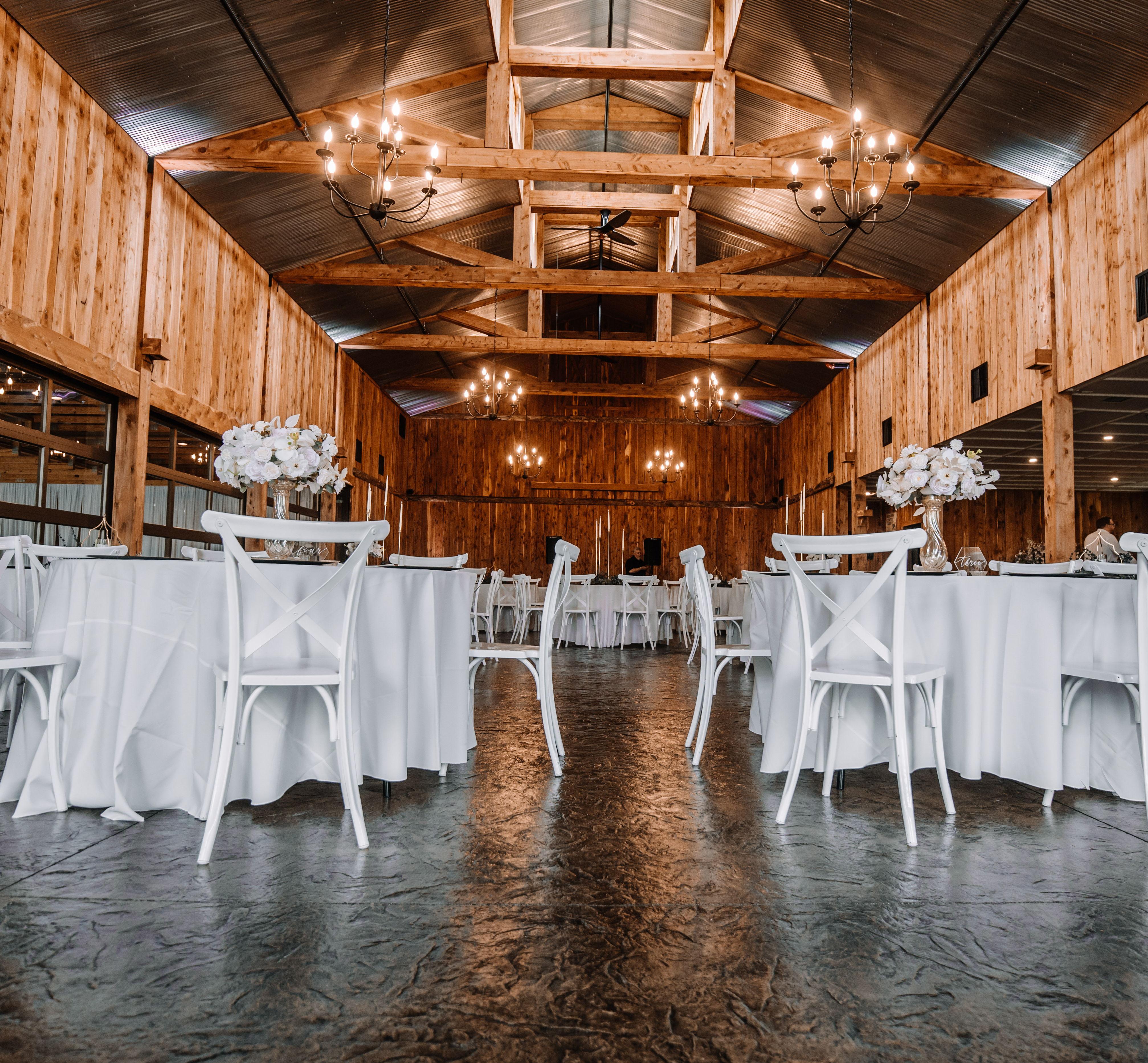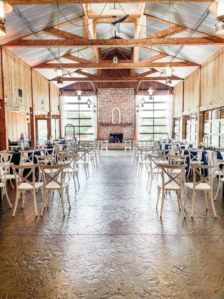 Our indoor reception area features stamped concrete, natural wood, dimmable lighting, reflective ceiling for uplights, indoor bathrooms, & glass garage doors for an indoor/outdoor feel. It is also climate controlled for both the summer and winter months. Couples can also choose to have their ceremony in front of our large stone fireplace. This is also our "plan B" for rain, where we can make the final decision as close to 60 mins. prior to ceremony.