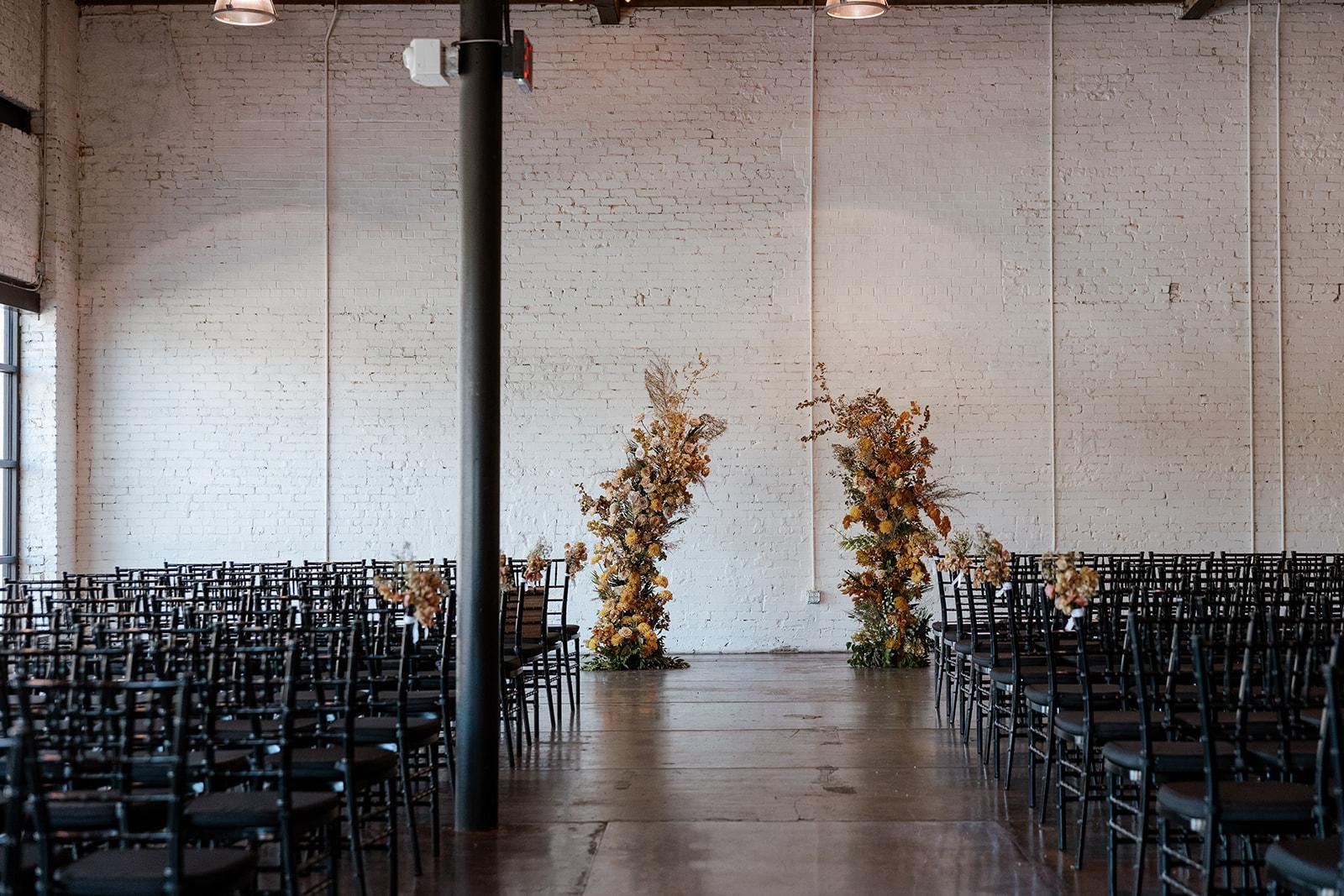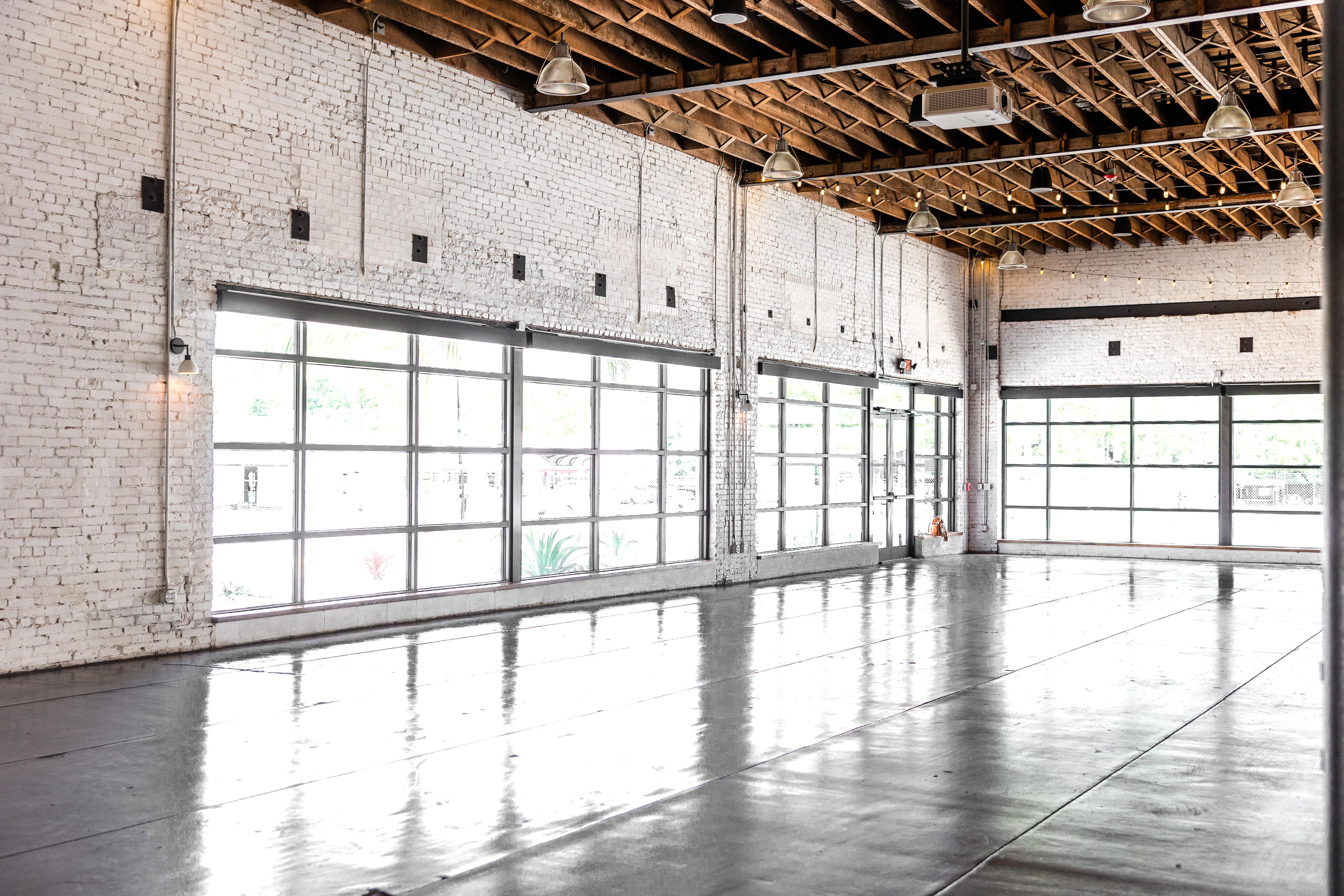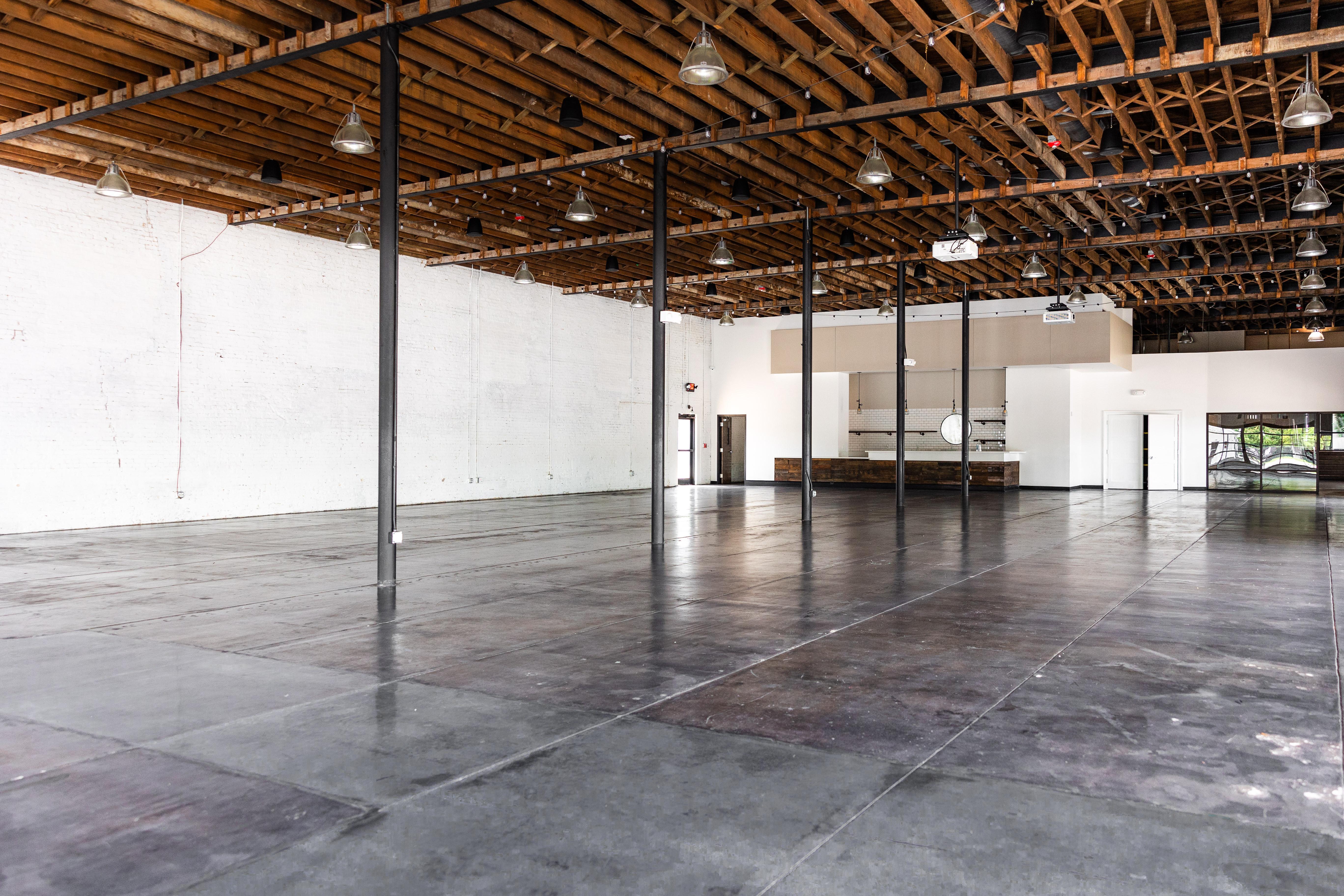 •2 onsite getting ready rooms •150 black chiavari chairs/chair pads •15 72” round tables •Retractable, blackout shades in white •Restored, large warehouse windows •Exposed, original white-washed brick walls & 17ft exposed rafter ceiling •Charcoal-stained and sealed concrete •Industrial style pendant lighting and dimmable market lighting •Built in audio / visual connectivity and speakers •16ft-long custom-built bar •Multi-stall, ADA, restrooms •A catering finishing kitchen •Ice machine (800 lbs)