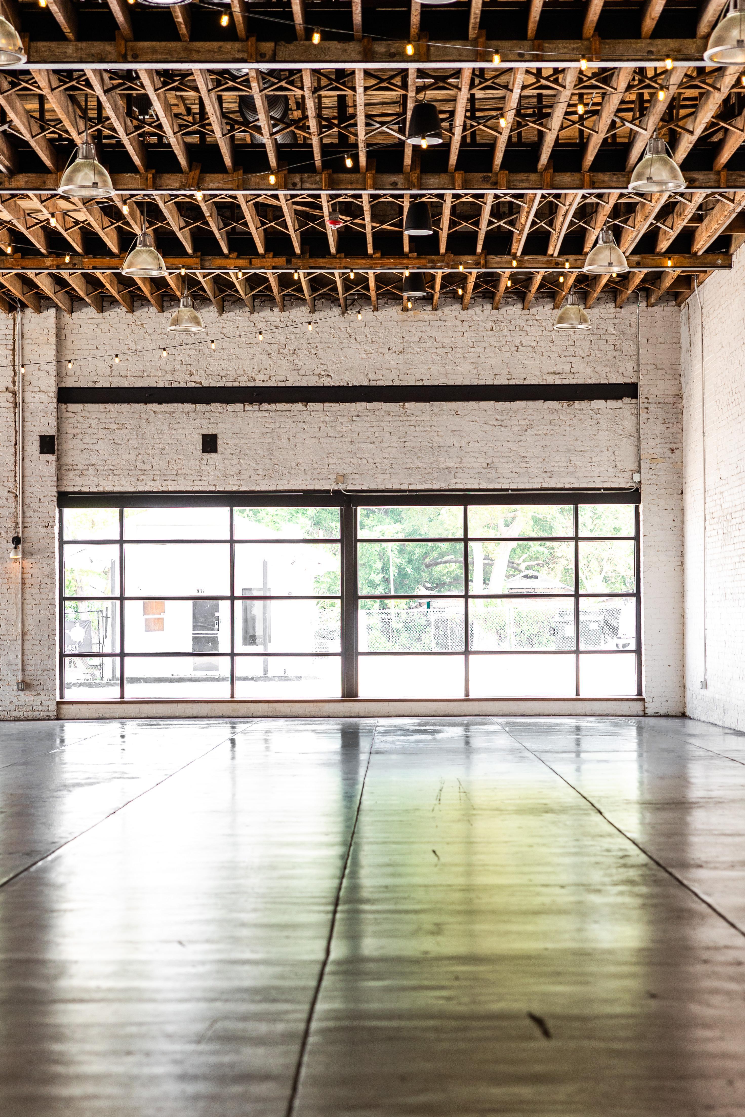 Haus 820 is a historic architectural building, featuring wall-to-wall whitewashed brick walls, large warehouse windows and black industrial finishes; a perfect balance of vintage and modern. Originally built in 1924, the refurbished 7,500 square foot space has a white interior full of natural light. With 22-foot open rafter ceilings, charcoal-stained and sealed cement floors, and an expansive footprint that will seat up to 400 seated guests.