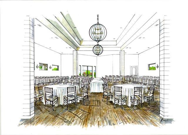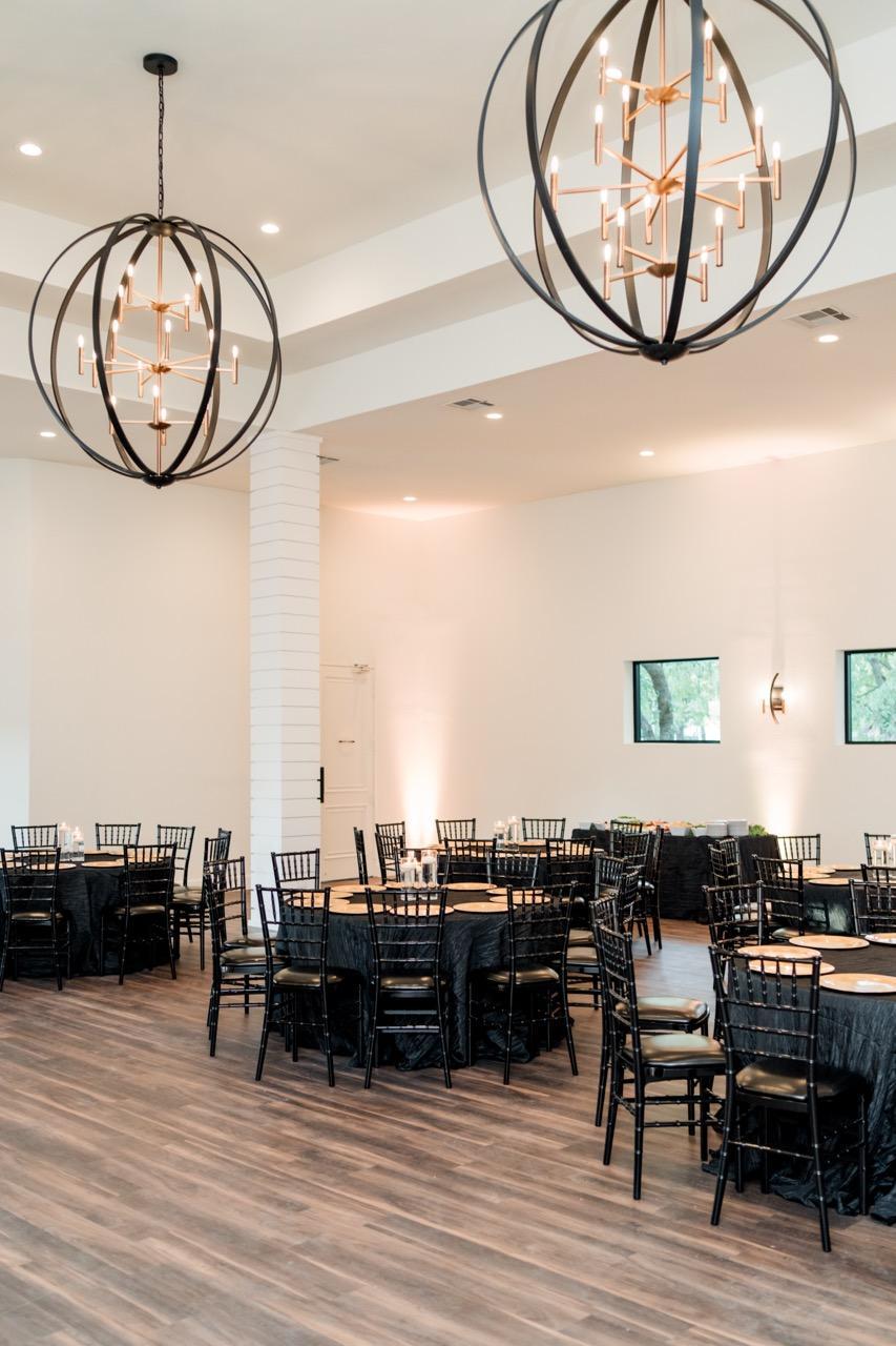 Enjoy cocktail hour with the indoor/outdoor bar. The open reception floor plan features chandeliers that shine down from the soaring whitewashed ceiling which is reminiscent of the endless Texas sky. Your guests will enjoy an inspired meal created just for you by our in-house catering team before dancing the night away.