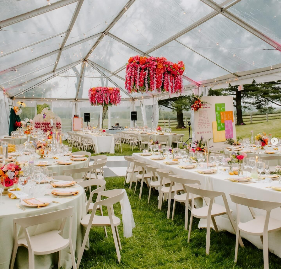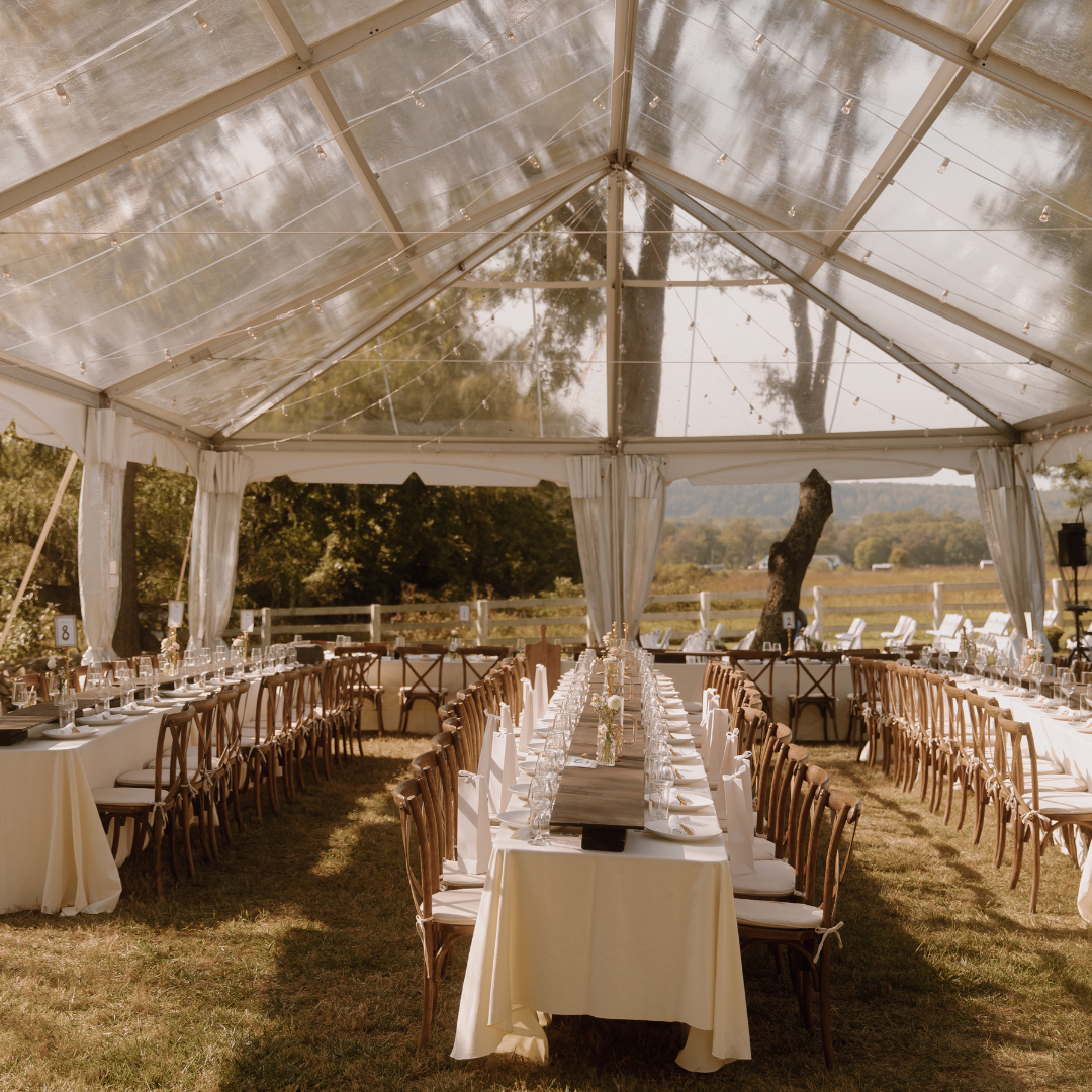 Nestled in a picturesque setting and located on the Springhouse Lawn, the tented pavilion (30' x 90') accommodates 180 guests for a seated reception. The Springhouse Lawn's two-tier design offers views of an Olympic lap pool, hot tubs, and lush green spaces—an ideal backdrop for photo ops. Perfect for wedding receptions and pre-reception cocktails, it's also a fantastic plan B for unexpected rain, ensuring a seamless celebration in any weather.