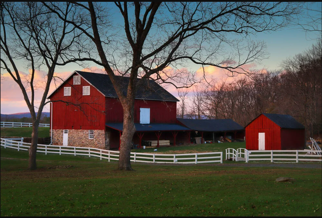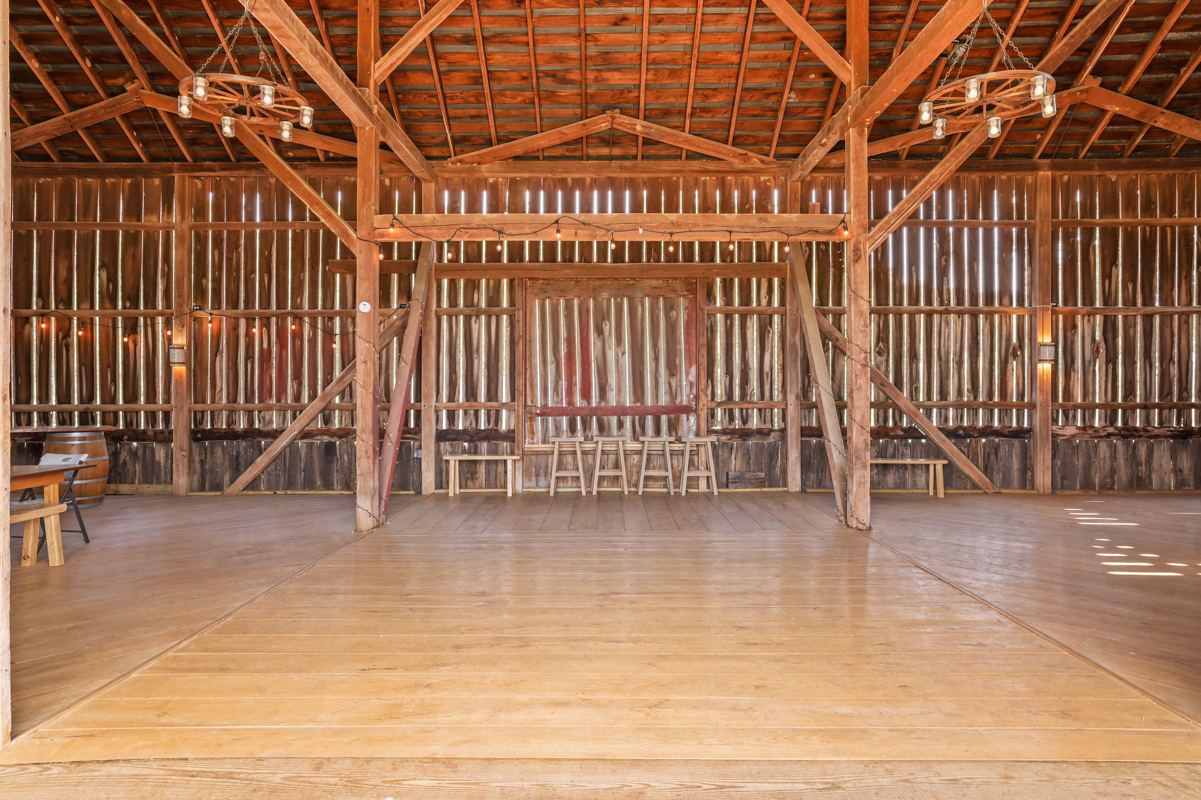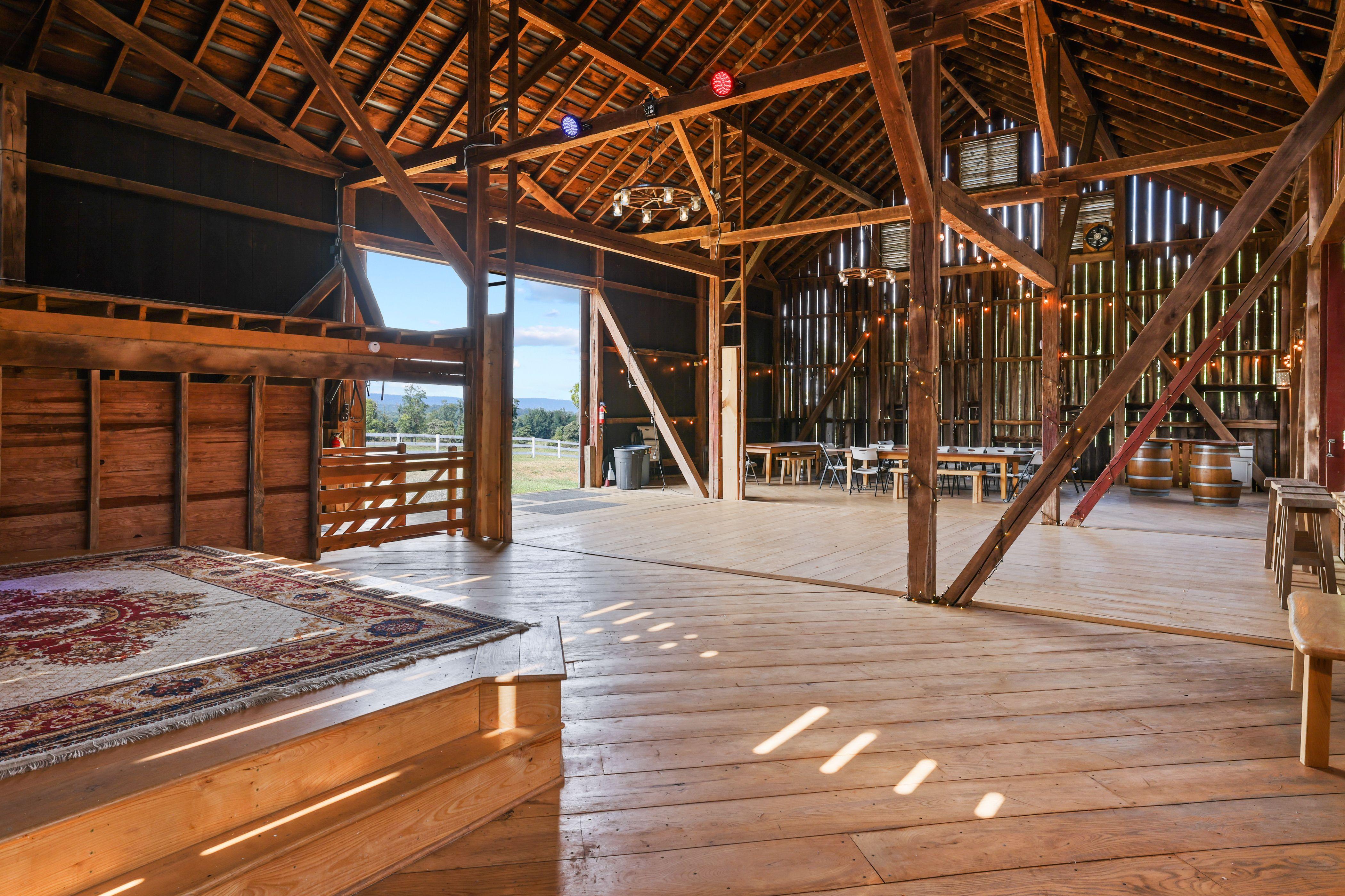 This historic rustic barn, featuring a stage, two bathrooms, a sound system, hand-crafted farm tables, hardwood floors, and romantic twinkle lights, is an ideal venue for a rustic, yet refined event. With seating for 180 for ceremonies and 140 for receptions, it offers a charming plan B for inclement weather and serves as a versatile option for receptions and rehearsal dinners. The barn doors, sliding open, invite a refreshing breeze, creating the perfect ambiance for an unforgettable evening.