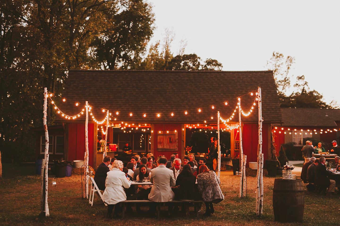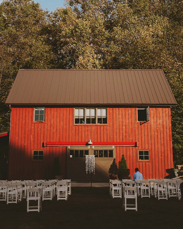 Imagine a beautiful backyard wedding at Hemlock Farm, featuring a red barn, lush greenery, and the warmth of a perfect autumn day. Picture singing in the sunlight, dinners under string lights, laughter around a fireside, and cake enjoyed in the moonlight. Hemlock Farm offers a charming setting with a red barn, a delightful lemonade-stand style dessert table, and delicious BBQ. These elements create the perfect backdrop for your special day, where the story of your wedding begins.