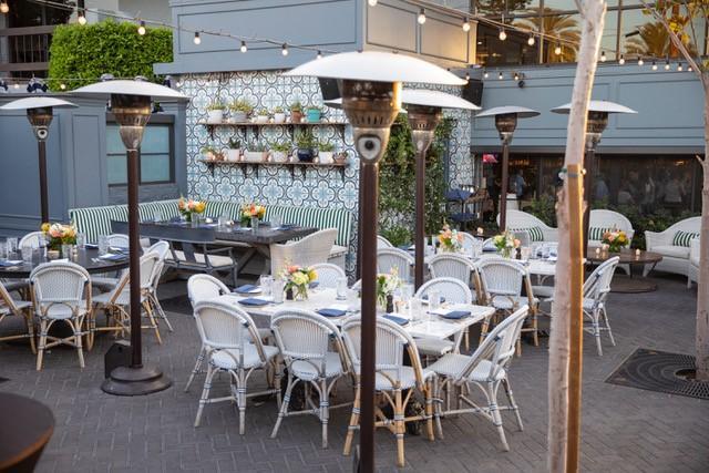 The Patio features classic wicker chairs and marble topped tables, all screened with lush greenery for an exclusive feel. A fireplace surrounded by lounge chairs keeps the space casual and inviting. Climate controlled for comfort with heaters or misters.