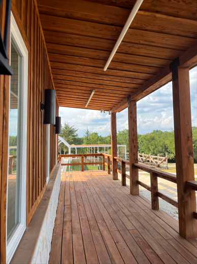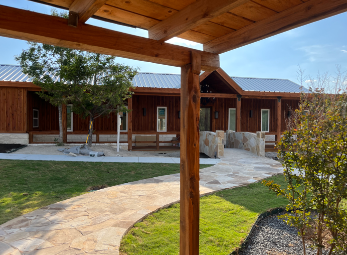 The Hall is the perfect solution if you desire an outdoor wedding but an indoor reception – or if you want a beautiful ranch setting for your wedding with the climate-controlled comfort of an indoor ceremony. Three large crystal chandeliers, pristine white walls, and a wall of glass affording a spectacular view of the property bring the glitz to this 4,000-square-foot venue space, while the hand-hewn cedar beams and Austin stone and cedar exterior bring the ranch feeling. The Hall will accommodate up to 160 people and has space for a dance floor. Refreshments are easily managed throughout the venue, warming station, and built-in food and drink bars, including an outside walk-up bar. A stream running along both sides of The Hall is traversed by stone bridges, which also provide abundant photo ops.