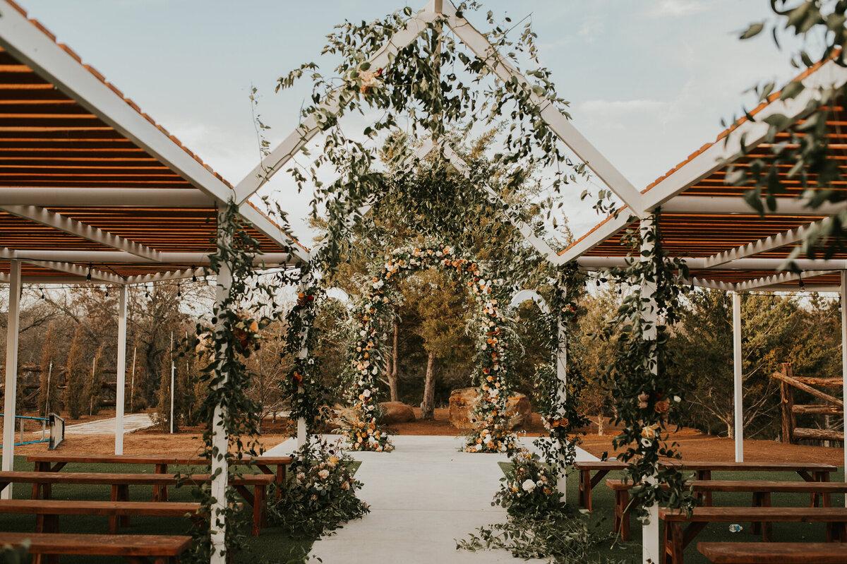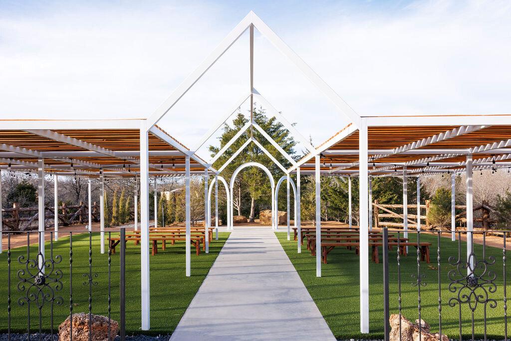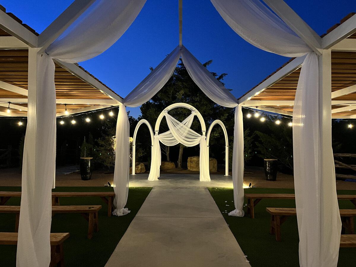 For an exquisite outdoor ceremony option, take a look at The Arches. A beautiful pergola leads up to the dramatic 10- and 12-foot-tall arches, which can be covered in lights, flowers, or fabric to create a gorgeous and unique backdrop for your ceremony. The arches of the pergola itself also can be decorated to create the bridal walkway of your dreams. Up to 160 guests can be seated on handmade benches or other seating of your choice, all under magical lights and surrounded by wooded areas and magnificent ranch views.