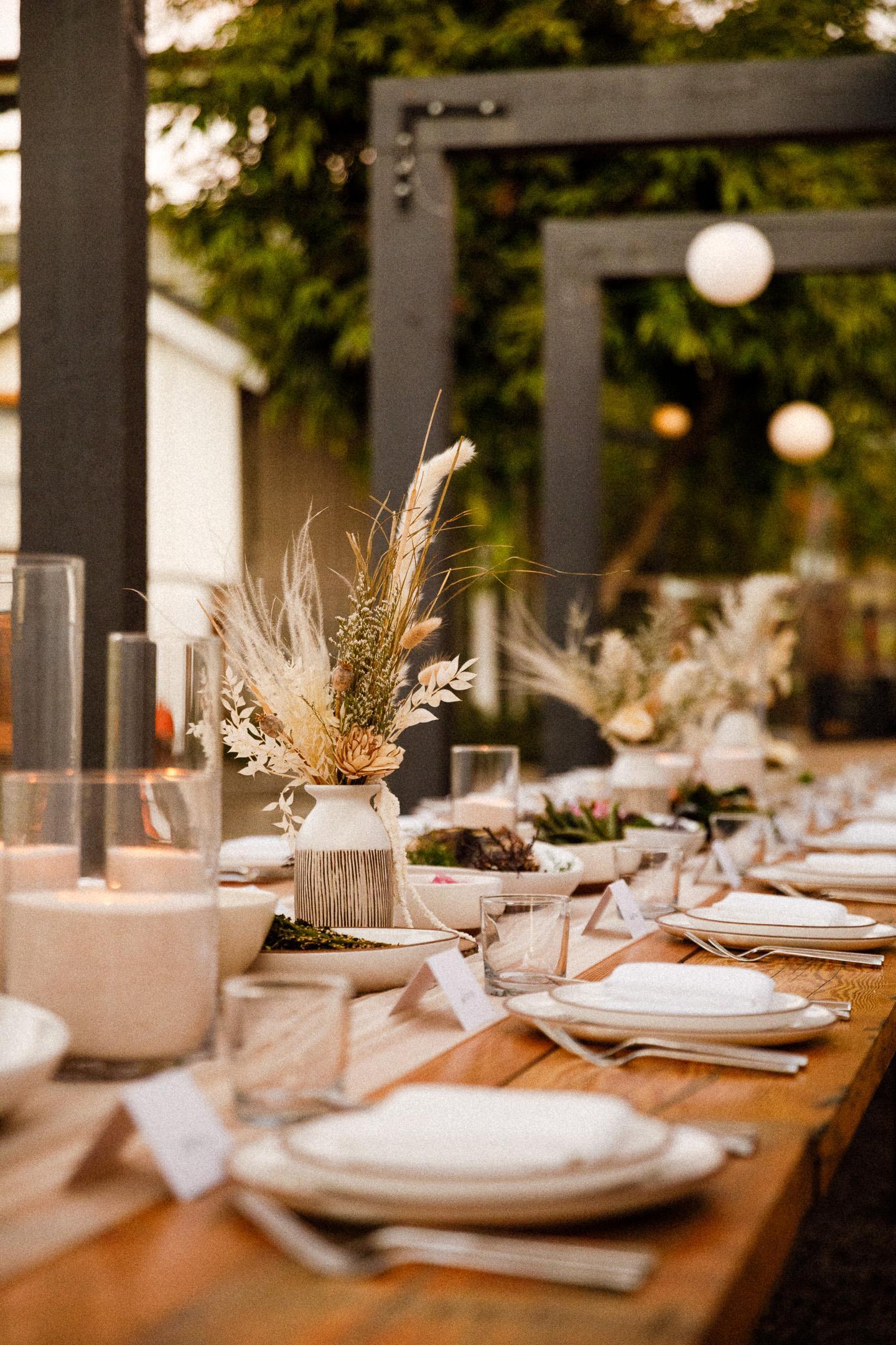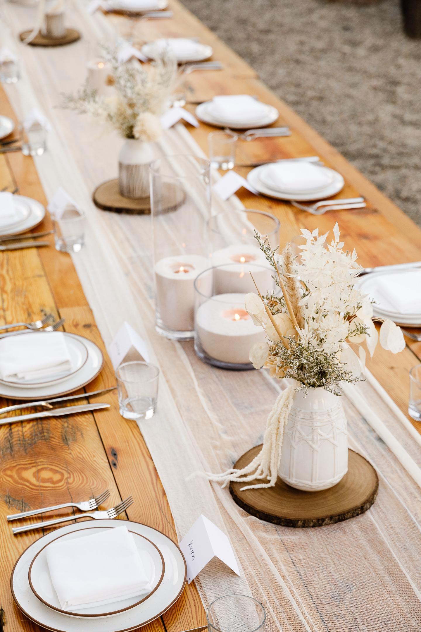 twinkle lights, long table, table settings, simple florals, candles, menus, place cards, plates, forks, knives, glassware.