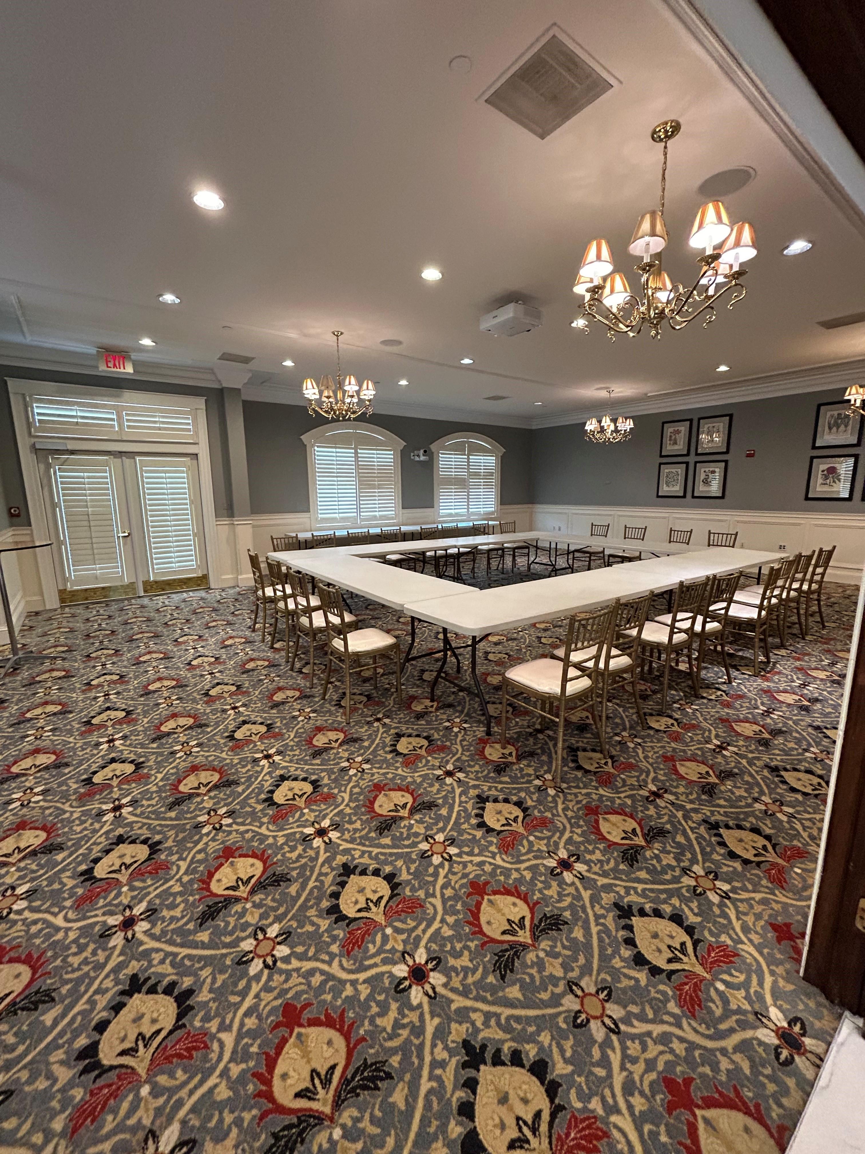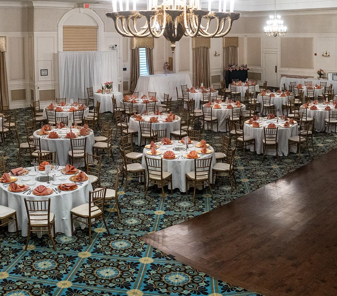 Recently renovated in 2019 and is beautifully appointed with a deep-coffered ceiling and custom moldings throughout. It easily accommodates your wedding of 100 guests as well as larger banquets of up to 330 participants. Designed for almost any use, the Ballroom features a large built-in wood dance floor and a raised stage with lighting and integrated sound system.