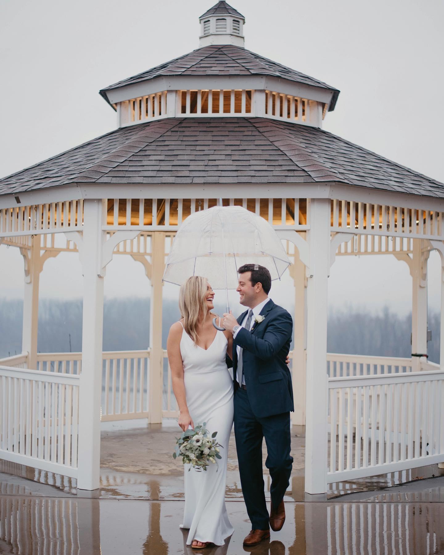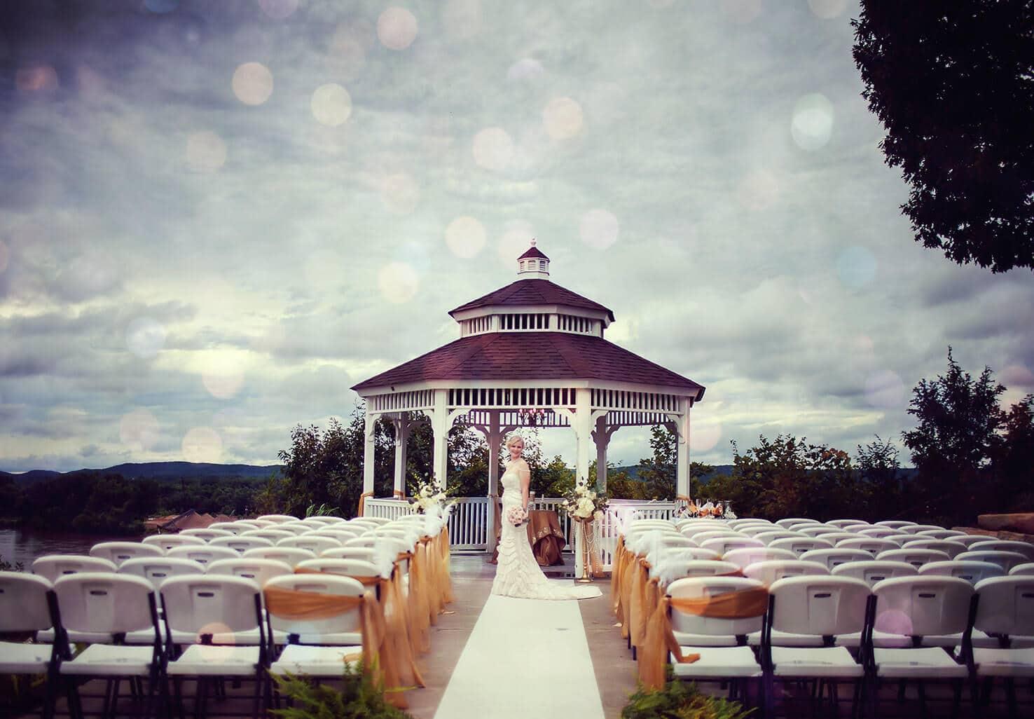 Our outdoor Gazebo holds up to 100 people and is perfect for smaller, more intimate weddings. The classic white structure overlooks the river, with matching outdoor chairs and is high up on our property. It provides a beautiful overlook of the scenery below to make your wedding photos breathtaking.
