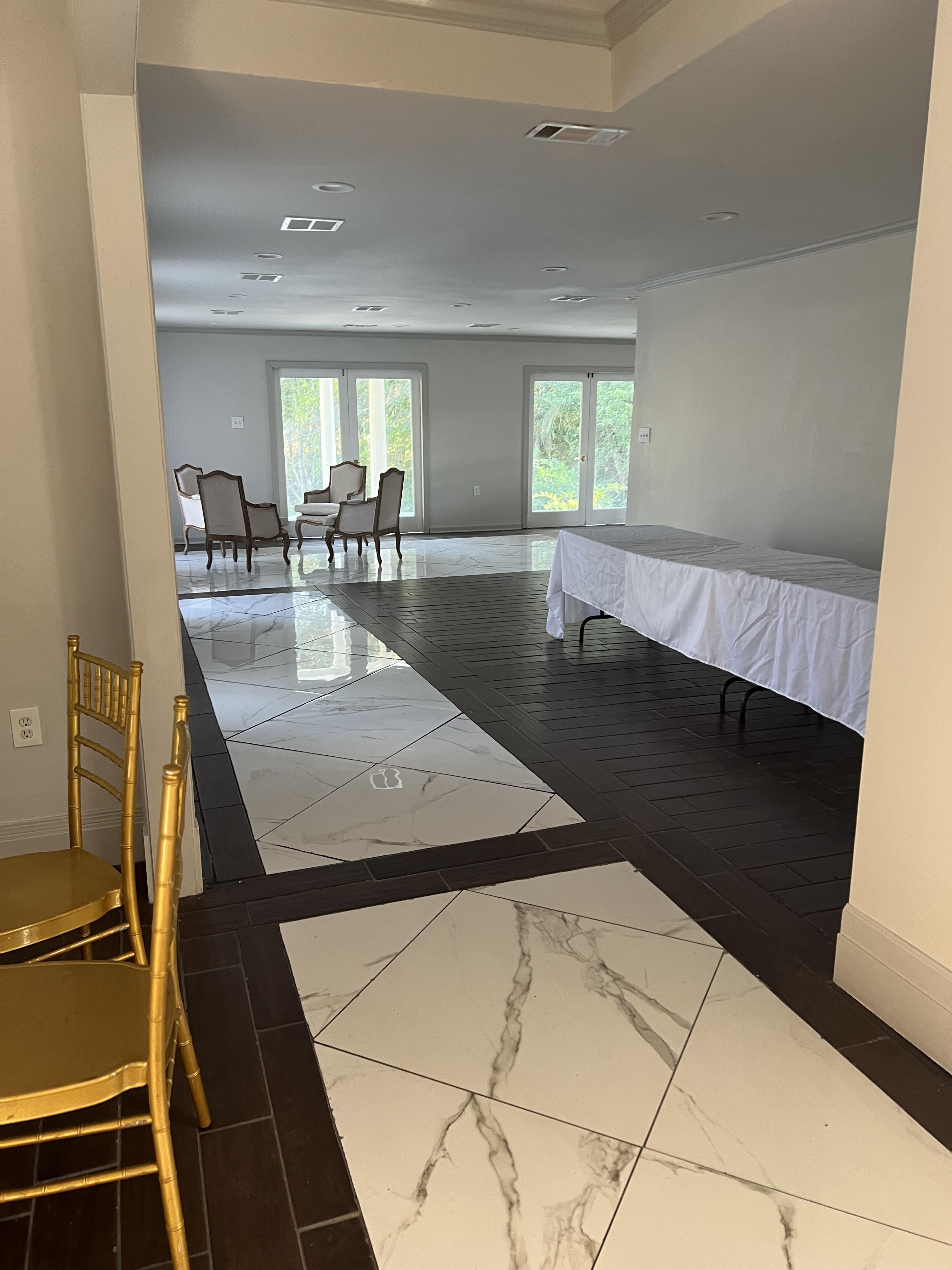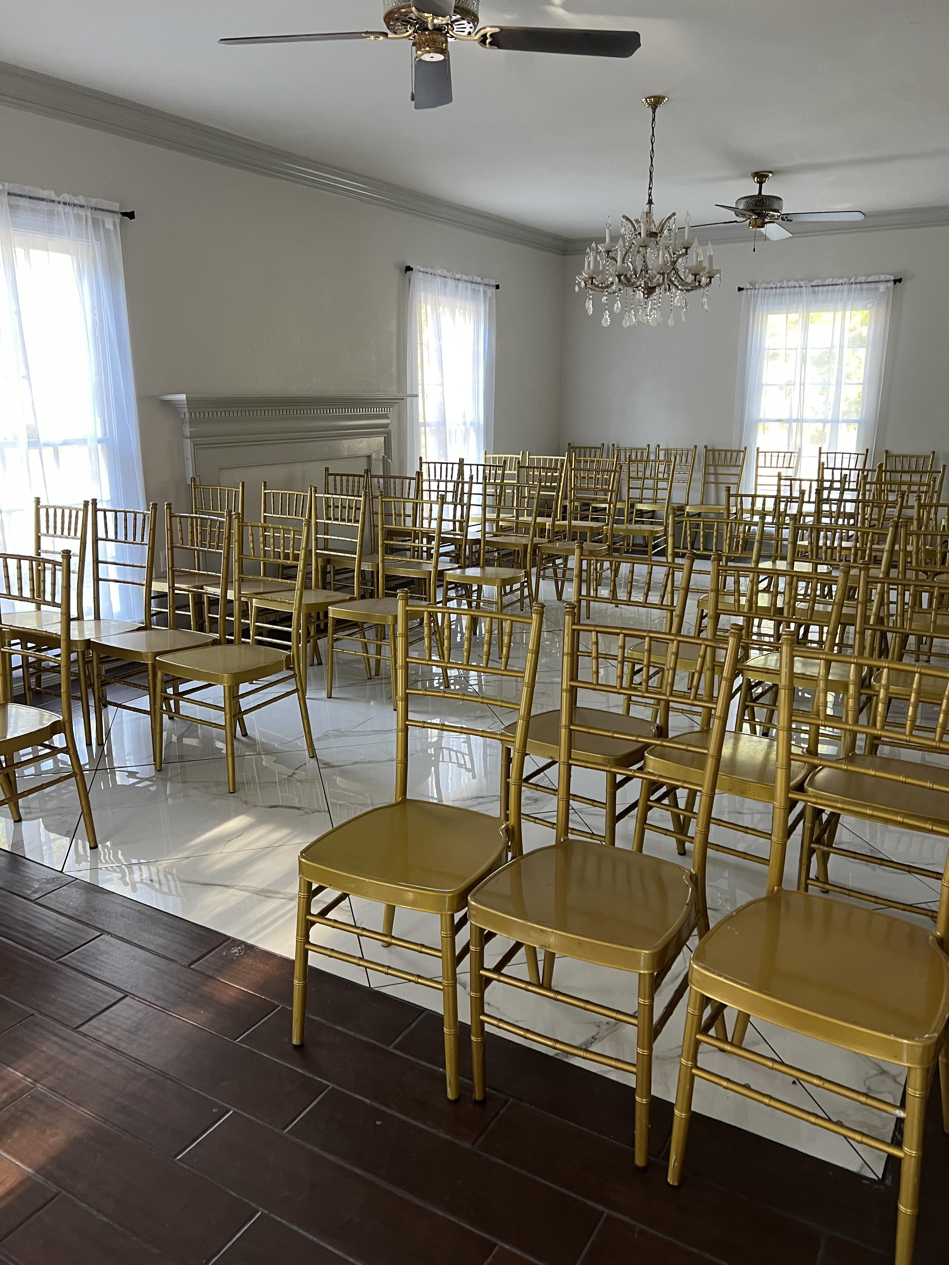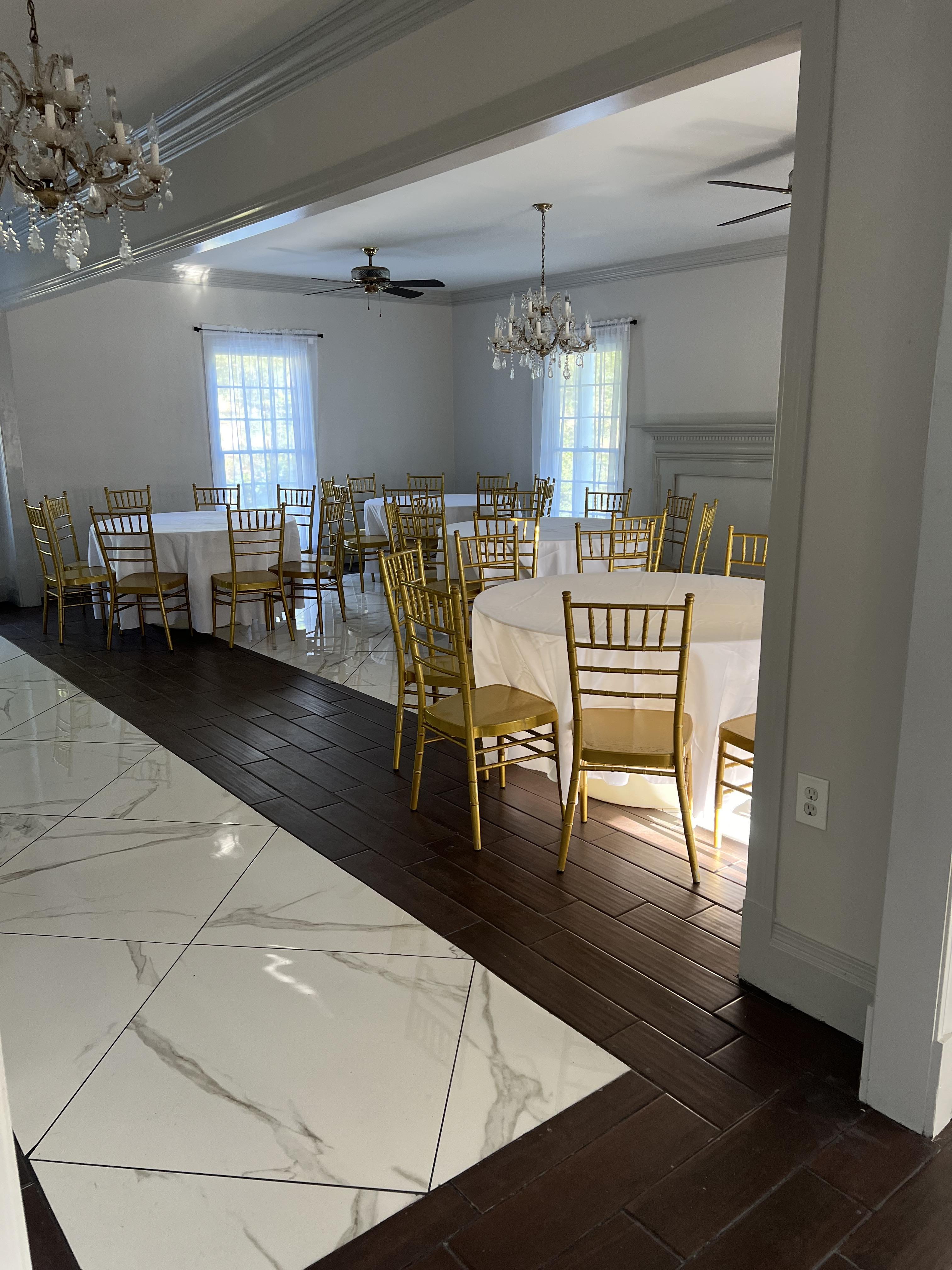 Venue rental includes chairs, tables and linens. Includes grooms lounge and bridal suite.