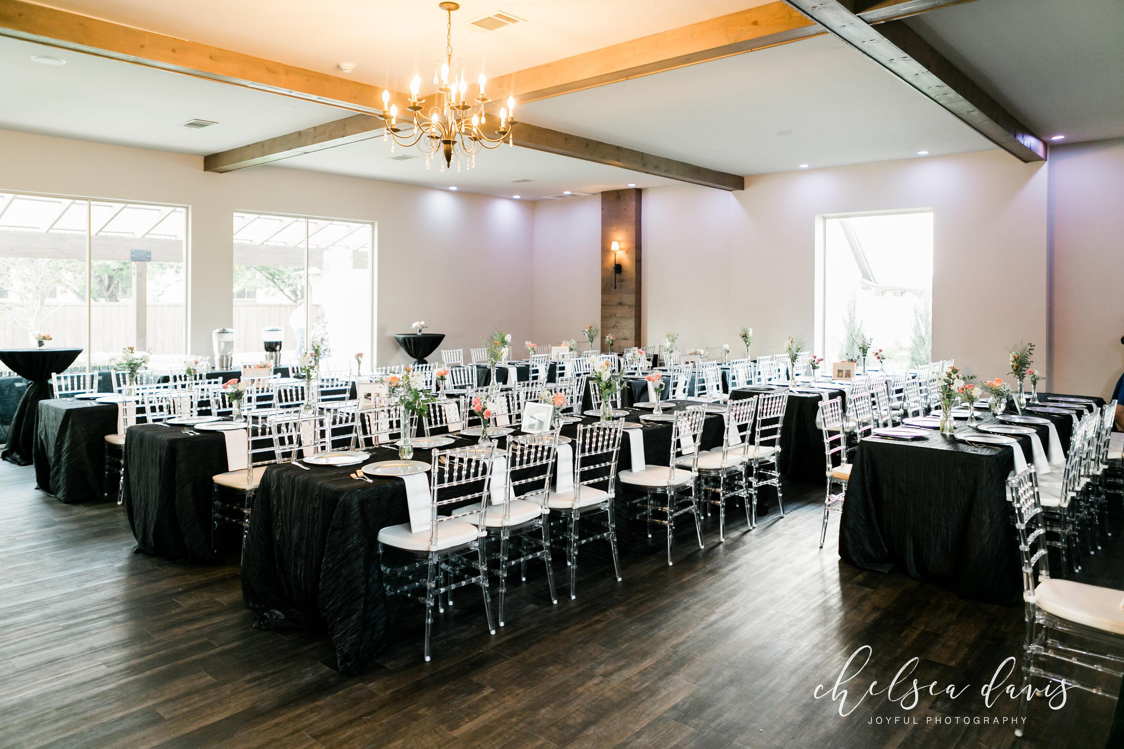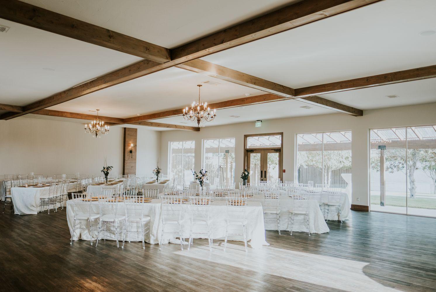 Accommodating up to 165 guests, our venue blends rustic elegance and farmhouse charm for a perfect wedding day. Enter our stunning chapel, featuring gleaming chandeliers & crystal Chiavari chairs. Then take a stroll in our courtyard, where you’ll find multiple photo spots – perfect for your first photos as newlyweds or mingling during cocktail hour. Finish your evening off in the reception hall that features walls of windows, King’s tables, an Austin stone accent wall, & a spacious dance floor to make the night one to remember! Contact us to schedule a tour today & see why so many couples are saying "We Do" to our venue!