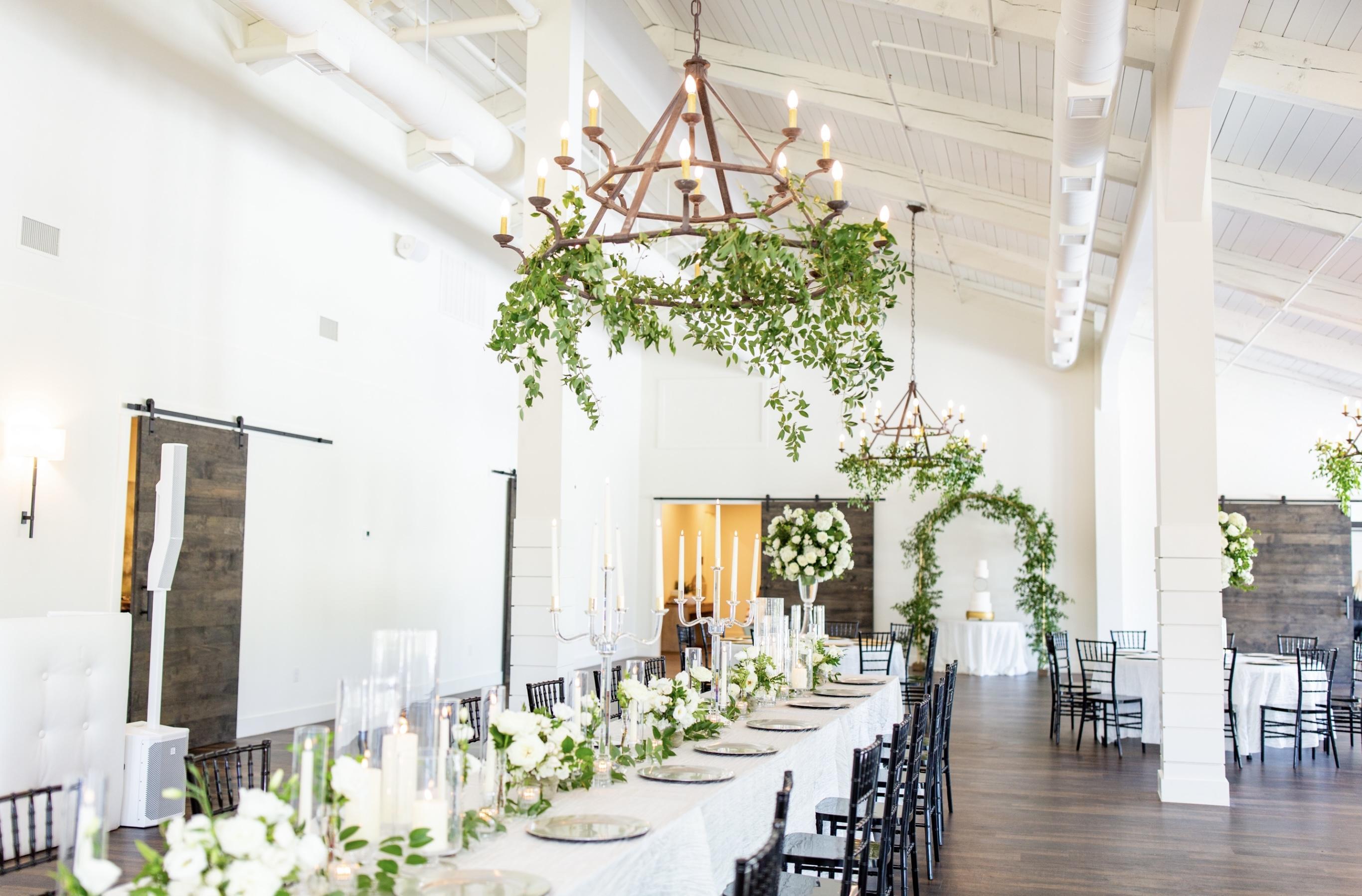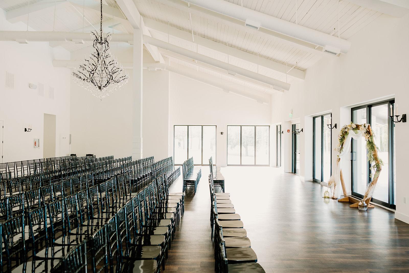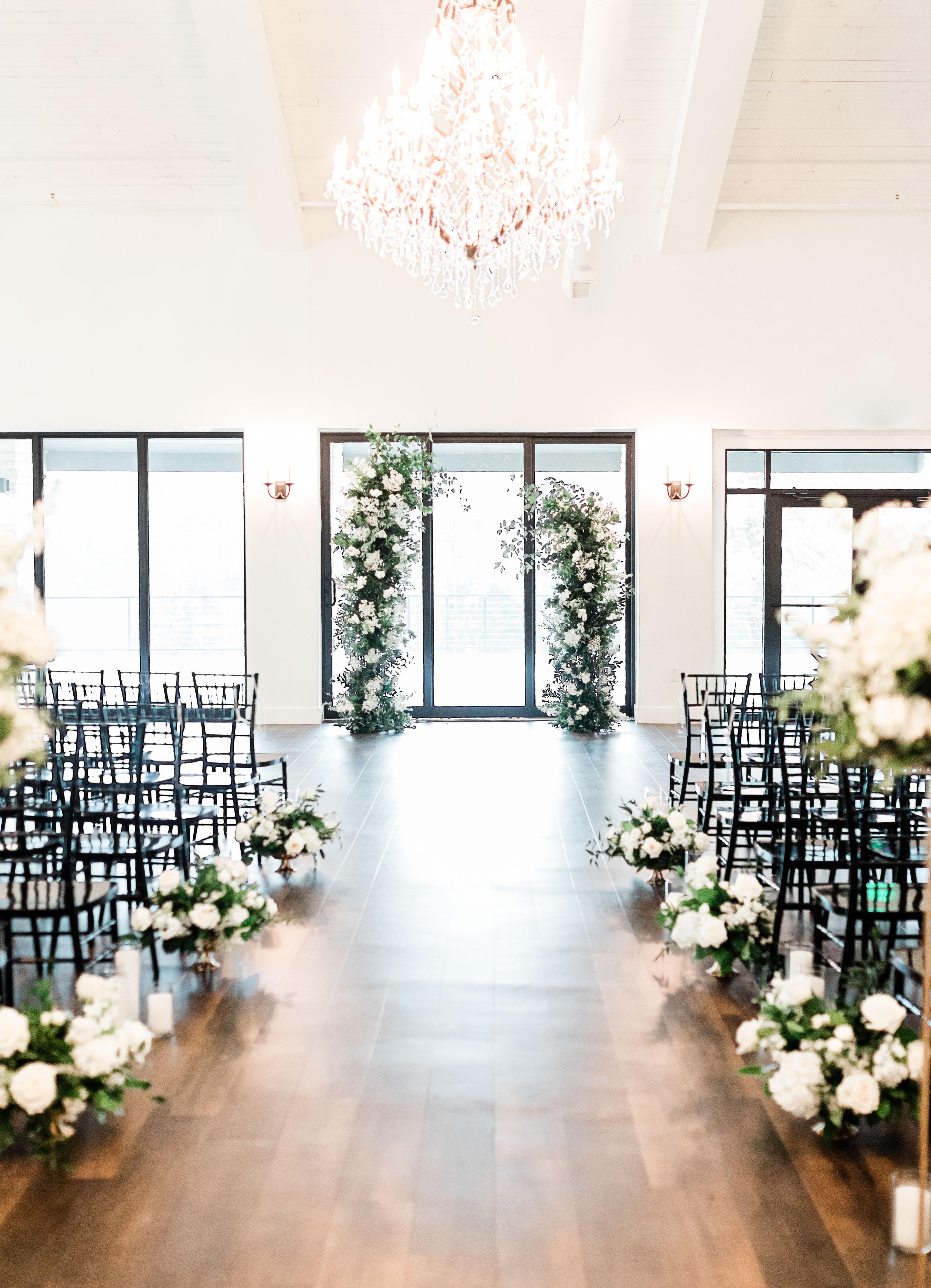 Our indoor chapel is the epitome of modern elegance. With large floor to ceiling windows that flood the room with natural light, and a large crystal chandelier at the center, this chapel is perfect for your wedding day. Make your grand entrance through the iconic, blue farmhouse doors, and all eyes are sure to be on you while you walk down the aisle.