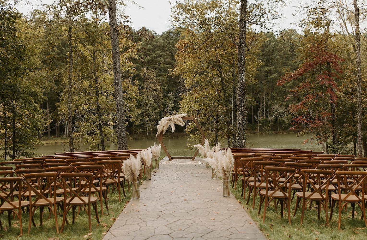 Our wedding and event barn can hold up to 200 guests and our six newly renovated cabins can sleep up to 44 guests. Outside features a serene lakefront ceremony site.