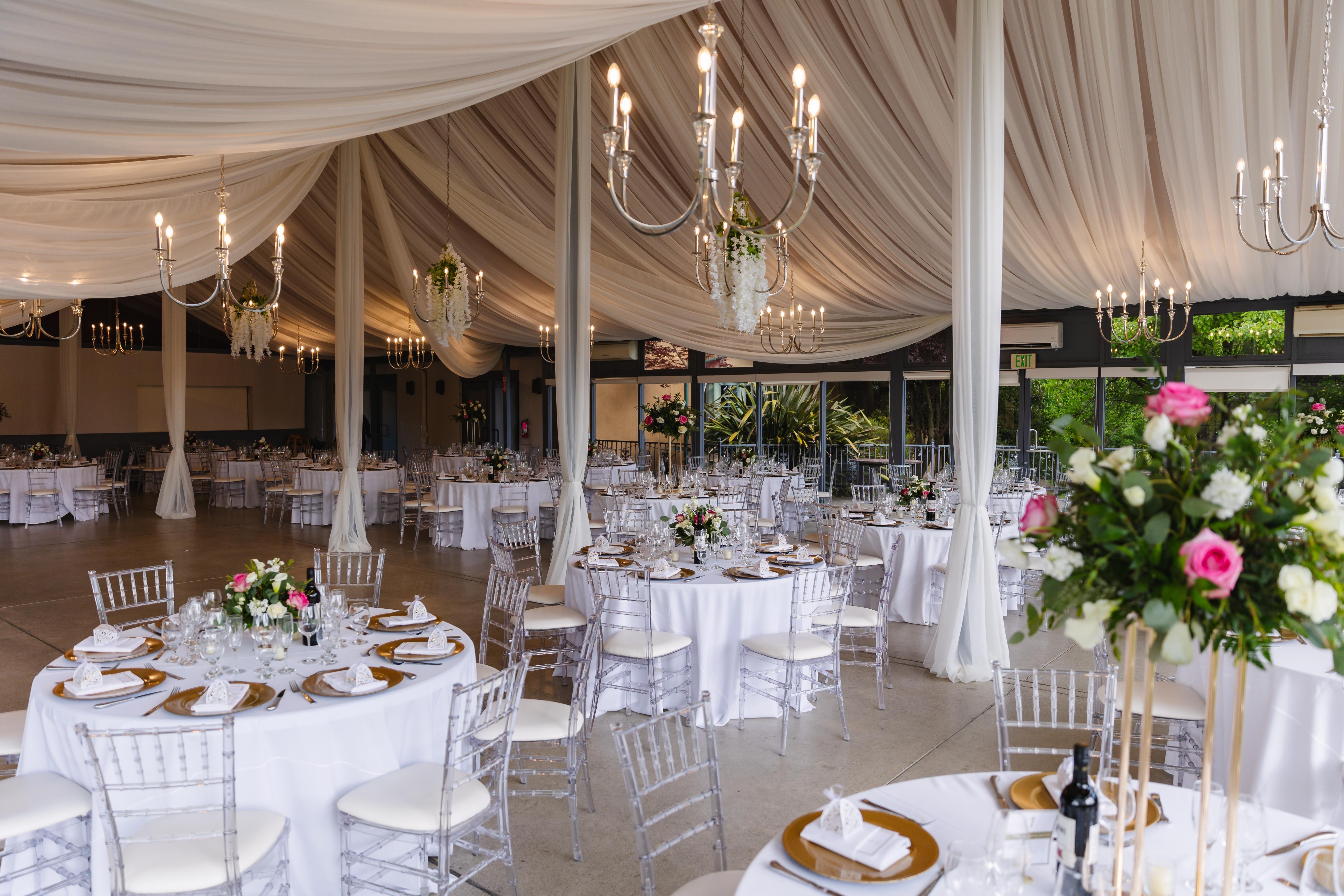 Experience our picturesque venue, where California's golden hills create a memorable backdrop for your celebration. Our property seamlessly blends natural beauty with sophisticated design, offering outdoor and indoor ceremony options to suit your vision. The outdoor ceremony space features white pillars with cascading greenery set against rolling hills and mature trees. Inside, our chapel-inspired hall boasts soaring ceilings with orbital chandeliers and panoramic windows that flood the space with natural light. Our grand reception pavilion, with draped fabric ceilings and crystal chandeliers, transforms effortlessly from elegant dining to vibrant celebrations. From intimate moments beneath weeping willows to sunset portraits with hillside views, every corner of our venue offers stunning photography opportunities. Let our experienced team handle the details while you focus on celebrating your love in our stunning setting.