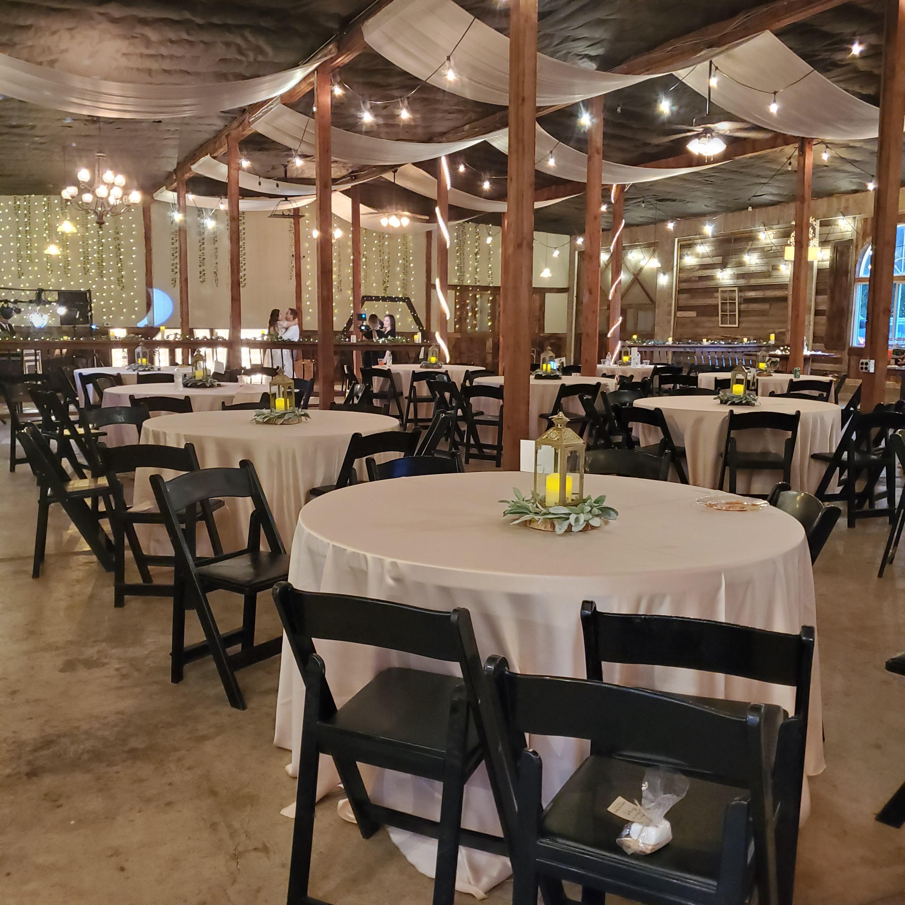 2 8ft farmtables 3 Large Wooden spools to use as cake table, gift table, guestbook table, etc. 120 black chairs Up to 16 round tables Dry bar/ Beverage Cart Cordless Microphone and Sound system SO much decor Brides& Grooms Rooms Prep Kitchen Area Outdoor Area Included