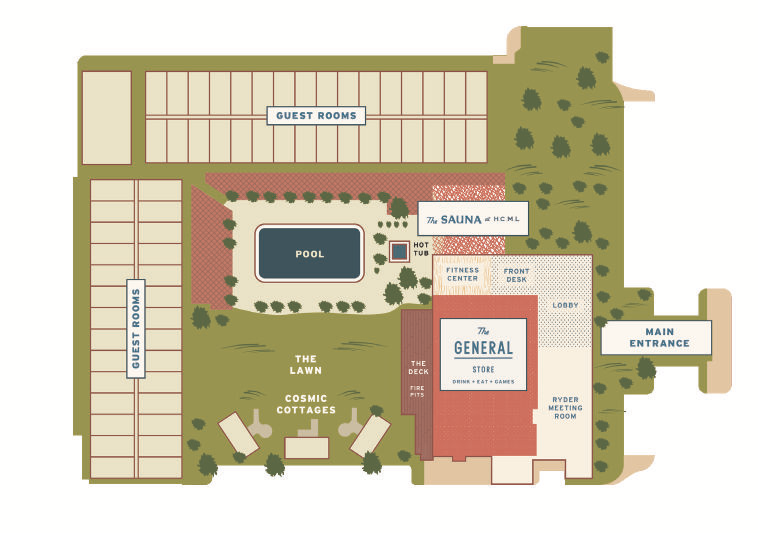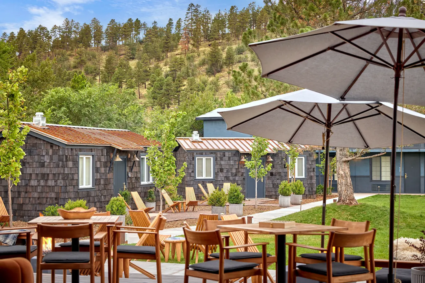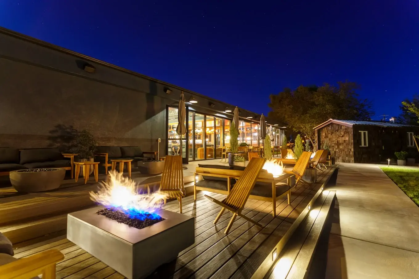 Adjacent to the Great Lawn, the Deck offers a chic and cozy outdoor space. This stylish area features comfortable seating, modern fire pits, and beautiful mountain views. As the sun sets, The Deck becomes an enchanting setting for guests to gather, complete with the warm glow of fire pits and panoramic celestial views.