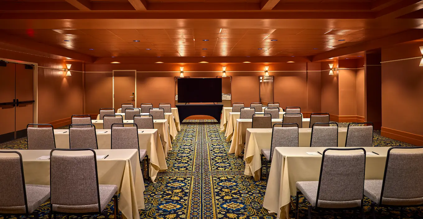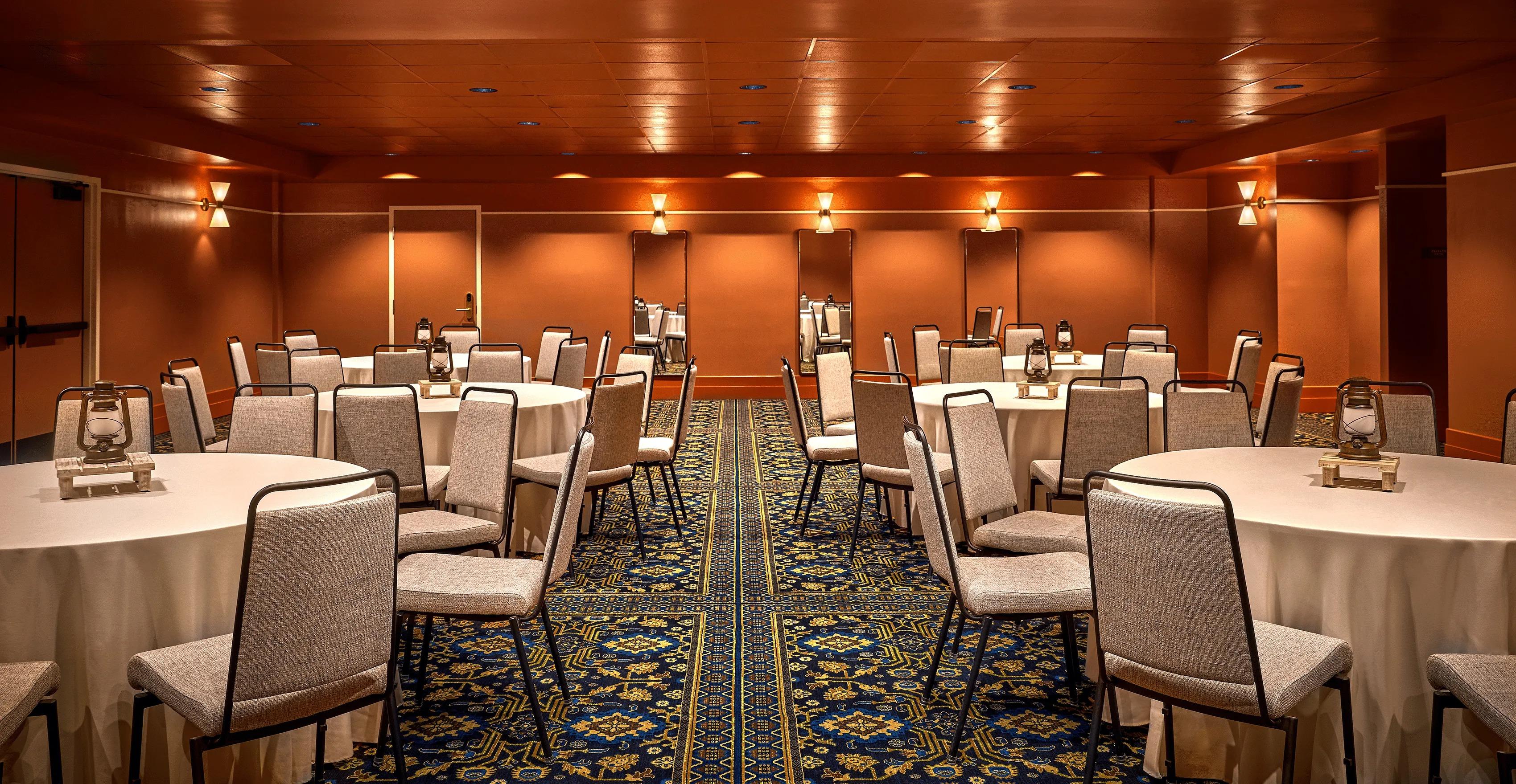 The Ryder Meeting Room is a dedicated private event space located just off the main lobby. This elegant indoor venue is defined by its warm, reddish-orange walls and a distinctive patterned carpet in shades of blue and gold. The room is configured with classic round tables and chairs, with a warm ambiance created by the soft glow of its wall sconces and overhead lighting. Its timeless design and intimate atmosphere make it a perfect complement to the lodge's outdoor spaces, providing a seamless and private experience for your celebration.