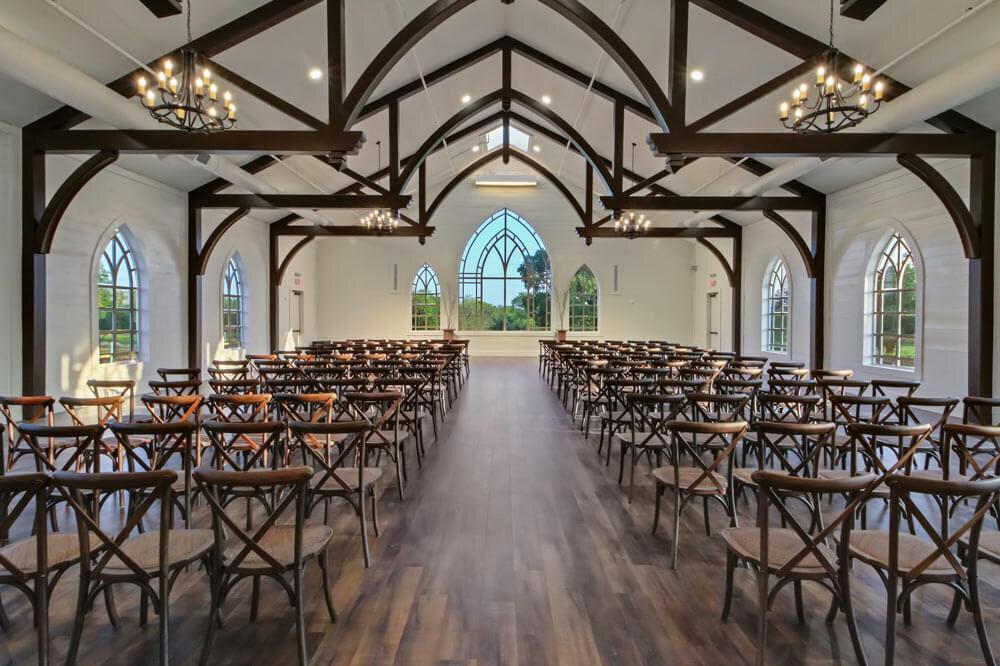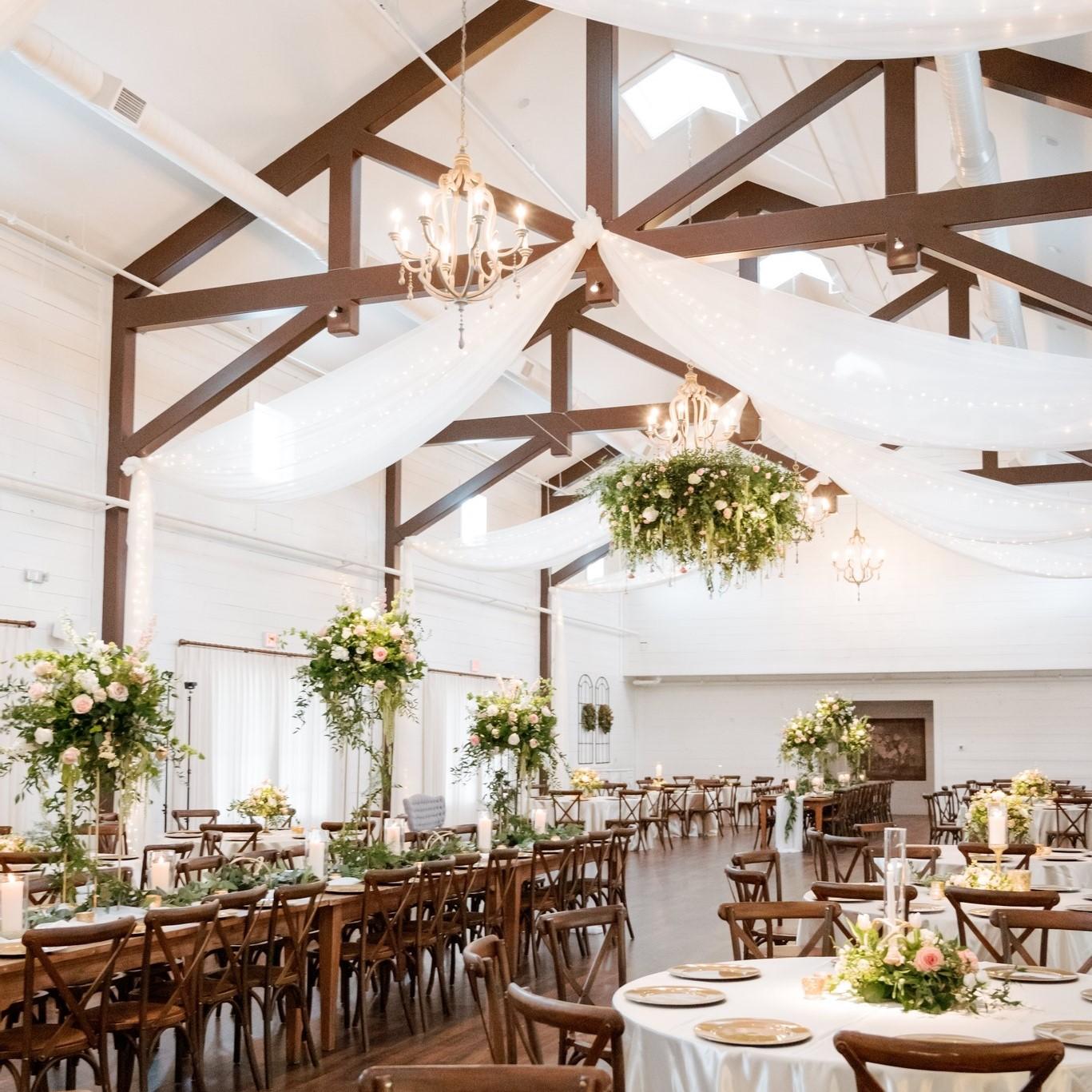 Evoking an old country church with an updated and modern vibe, our Chapel is a perfect indoor ceremony venue featuring shiplap walls with arched trusses and windows. The Gathering Room, with its 35-foot ceiling, is designed to offer you dramatic space and tremendous flexibility for the layout of your wedding reception or event. Both spaces accommodate up to 300 guests, and can be elegantly “dressed up” or maintain their casual farmhouse style.