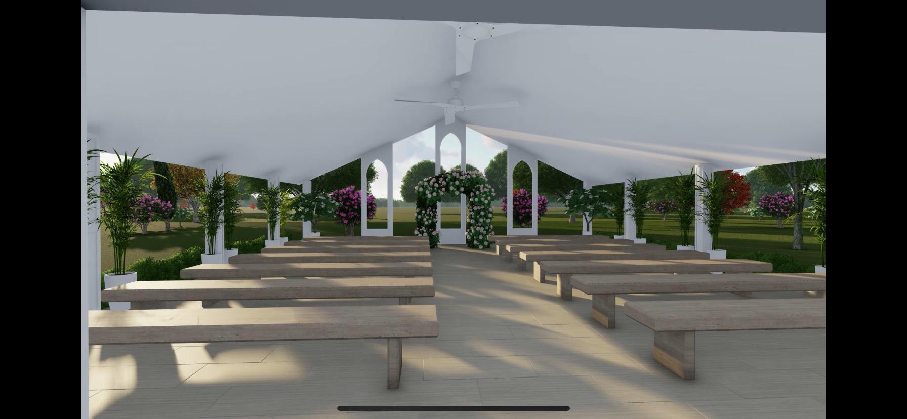 2 ceiling fans are mounted to help with air flow. Bench seating is provided for up to 300 guests.