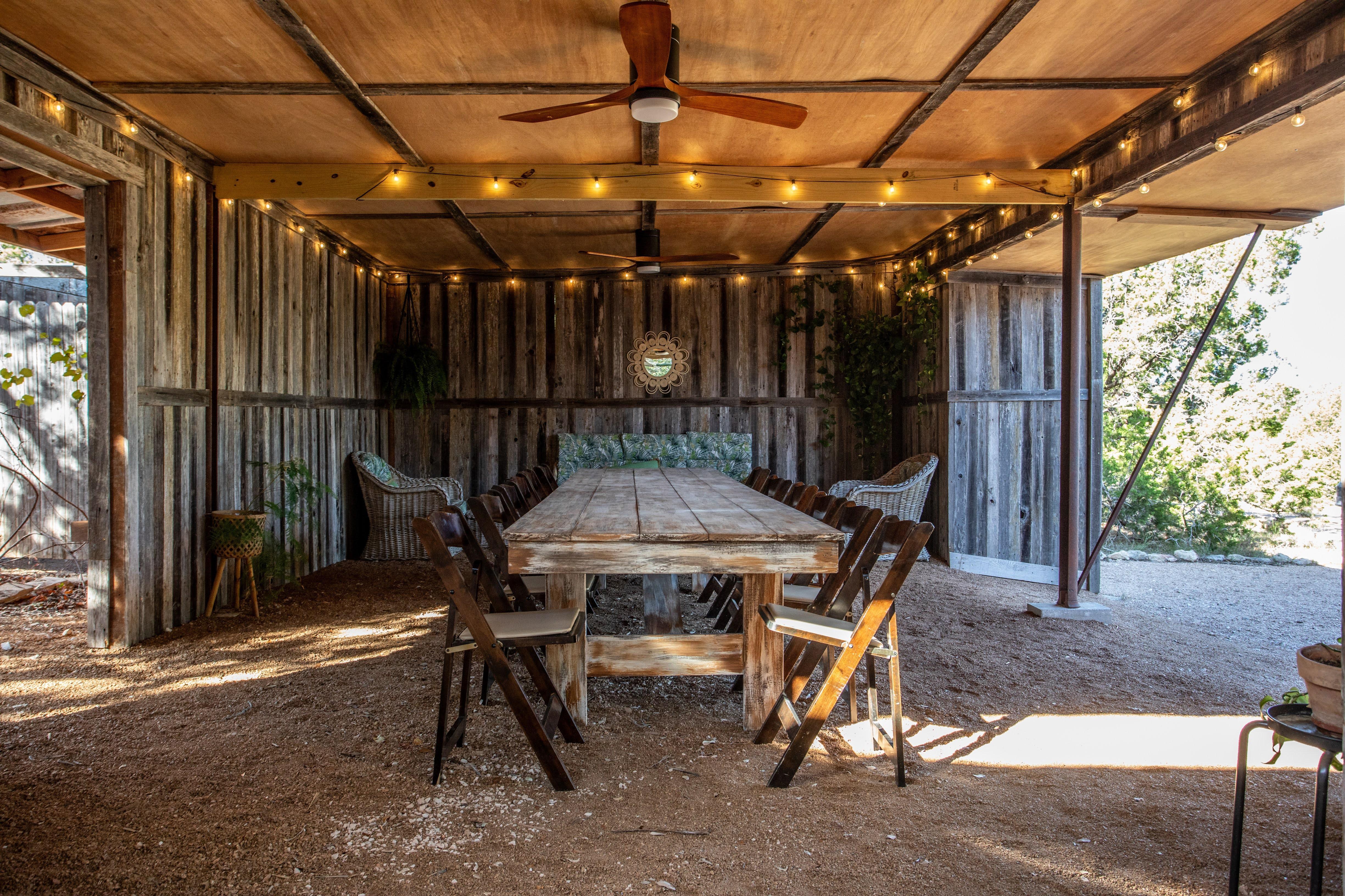 This open but covered space features 3 long farmhouse tables to seat a total of 36 or can be transformed into whatever your heart desires. There are cute lights at night and two fans for air movement.