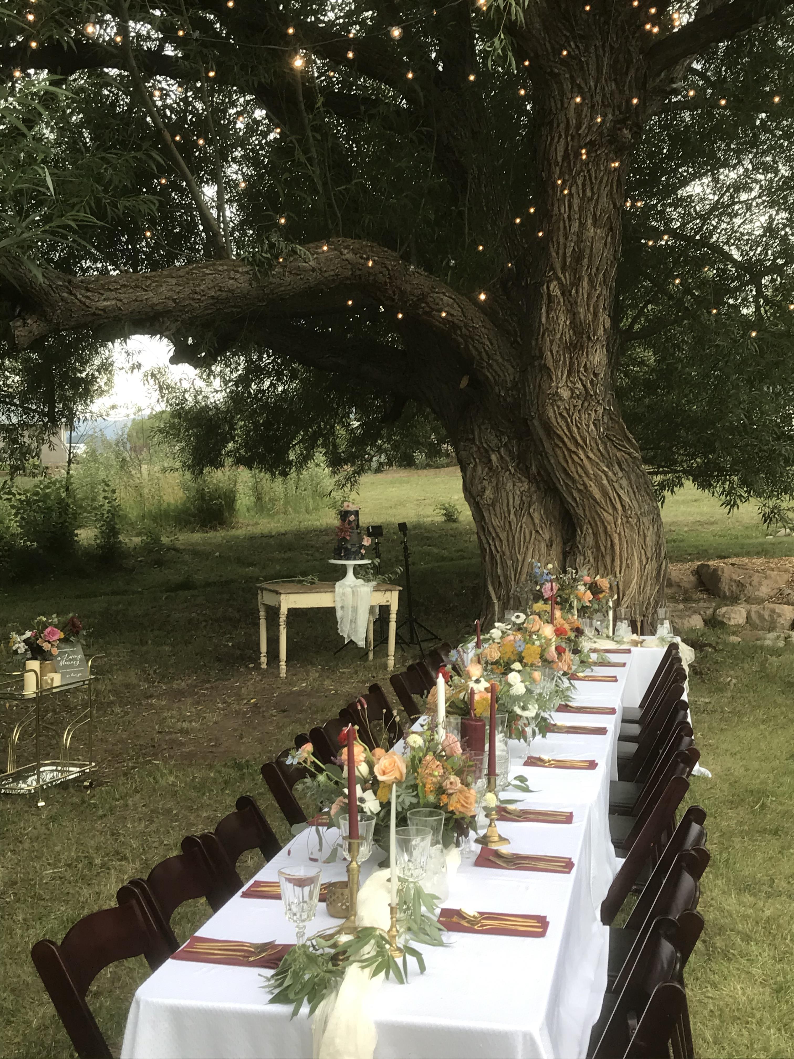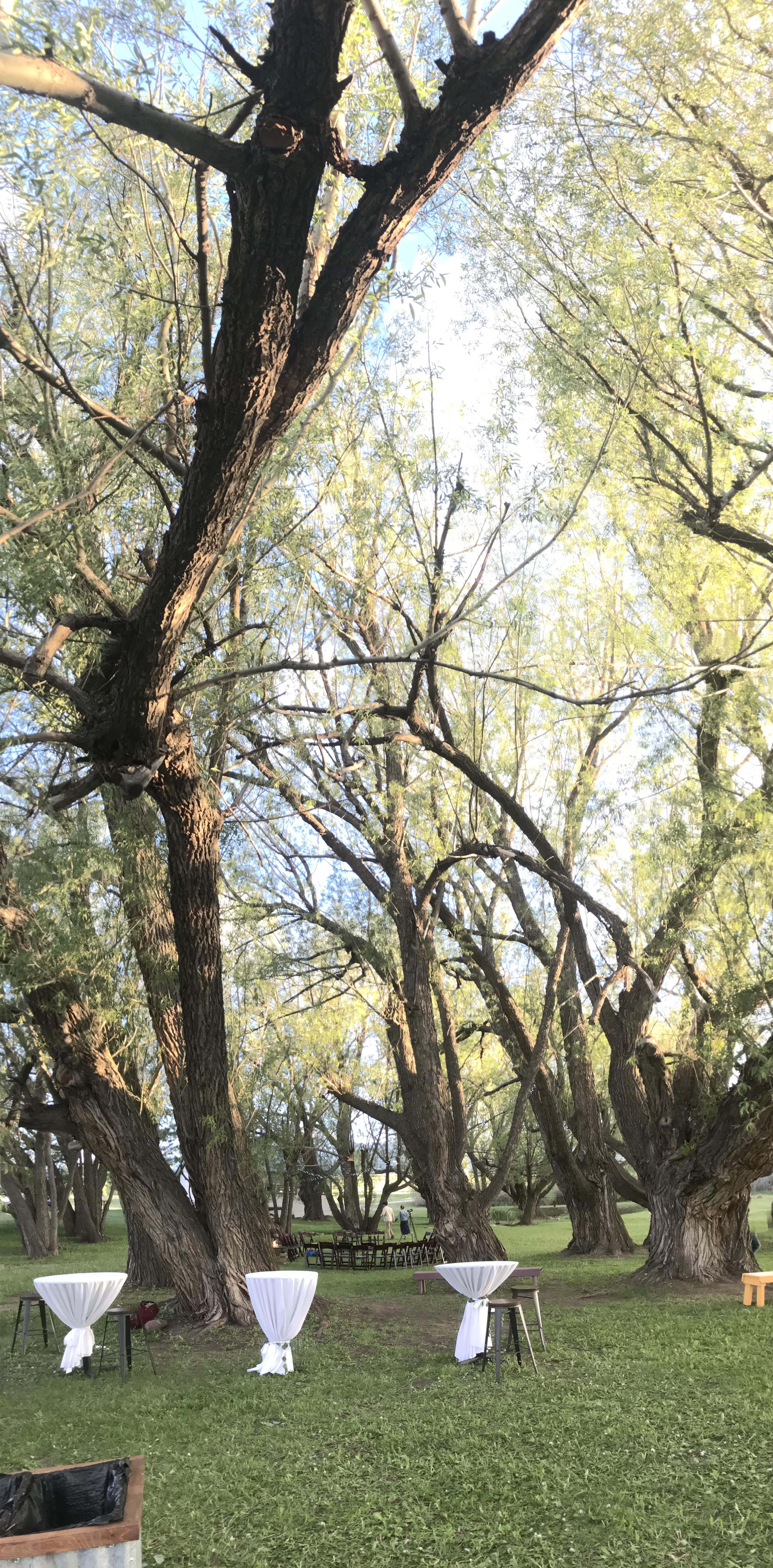 Set up for ceremony: chairs or benches. Set up for cocktails: high tops. Set up for a full dinner under the willow- extra charge