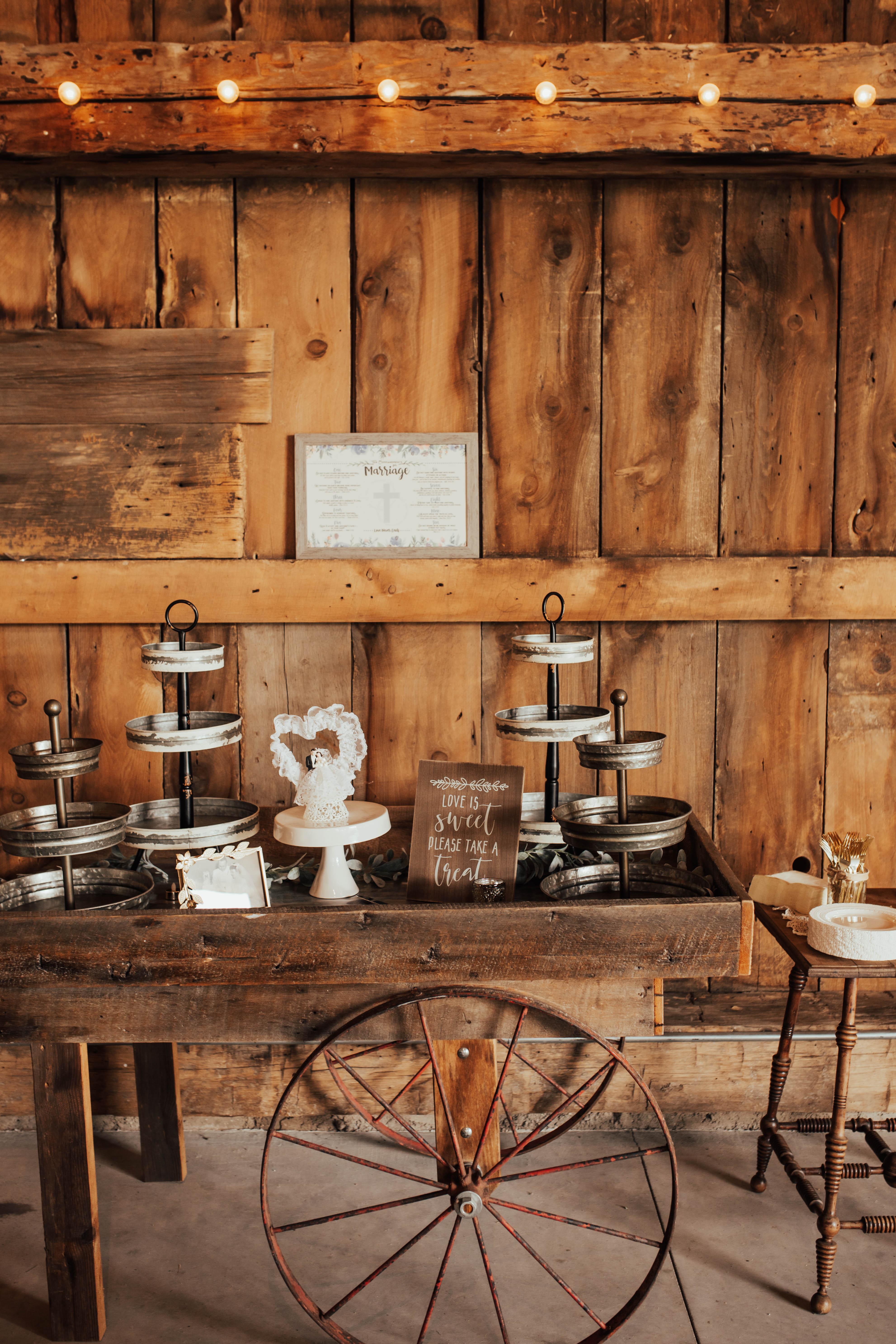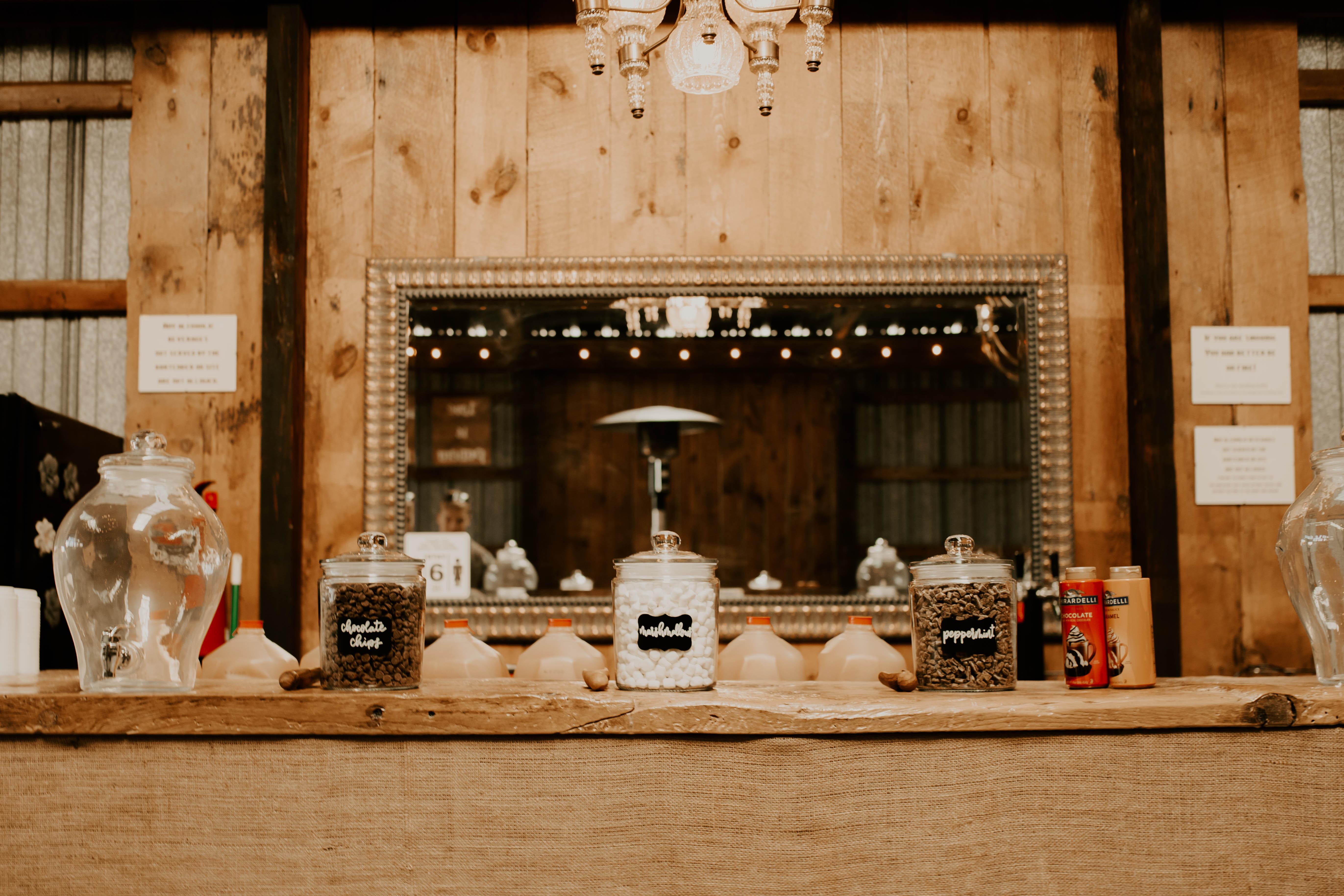 - wooden bar - 2 kegerator - fridge - freezer - 6 whiskey barrels - 2 round cocktail hour tables - appetizer bar - option to seat 50 guests at tables and chairs - option to bring dancing in the barn - option to host indoor ceremony