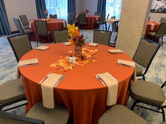 - Complimentary Wi-Fi - Drop down projector screen - Multiple light switches to control the brightness in the room - Tables - Chairs - Linens (variety of colors available to be selected from) - Silverware and plates