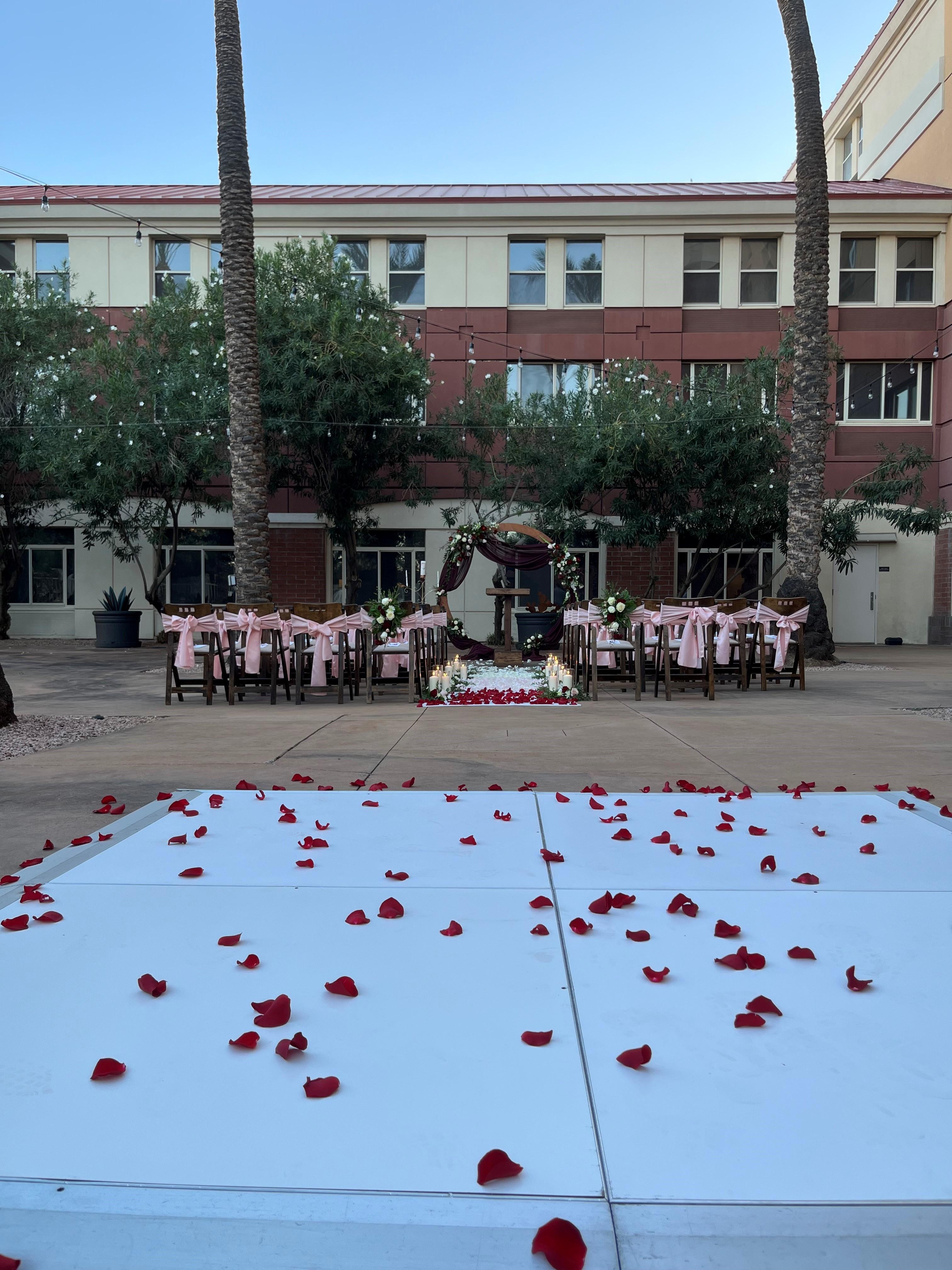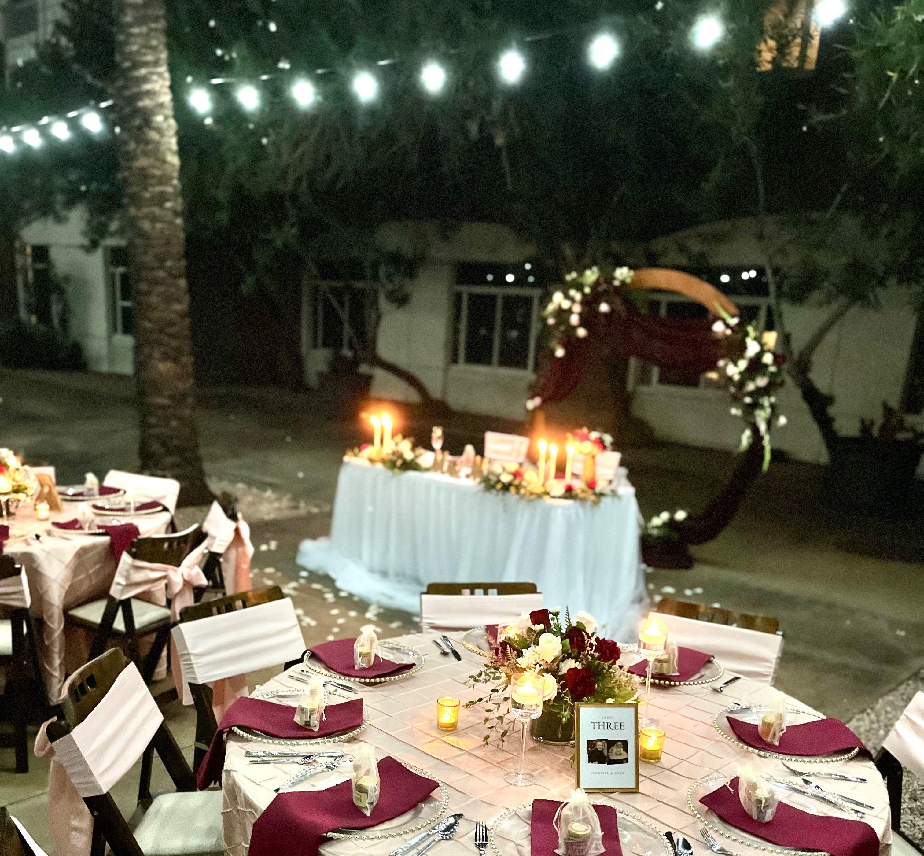 This space is just over 4000 sq ft. with beautiful Palm trees and string lights to give the perfect ambiance for an event.