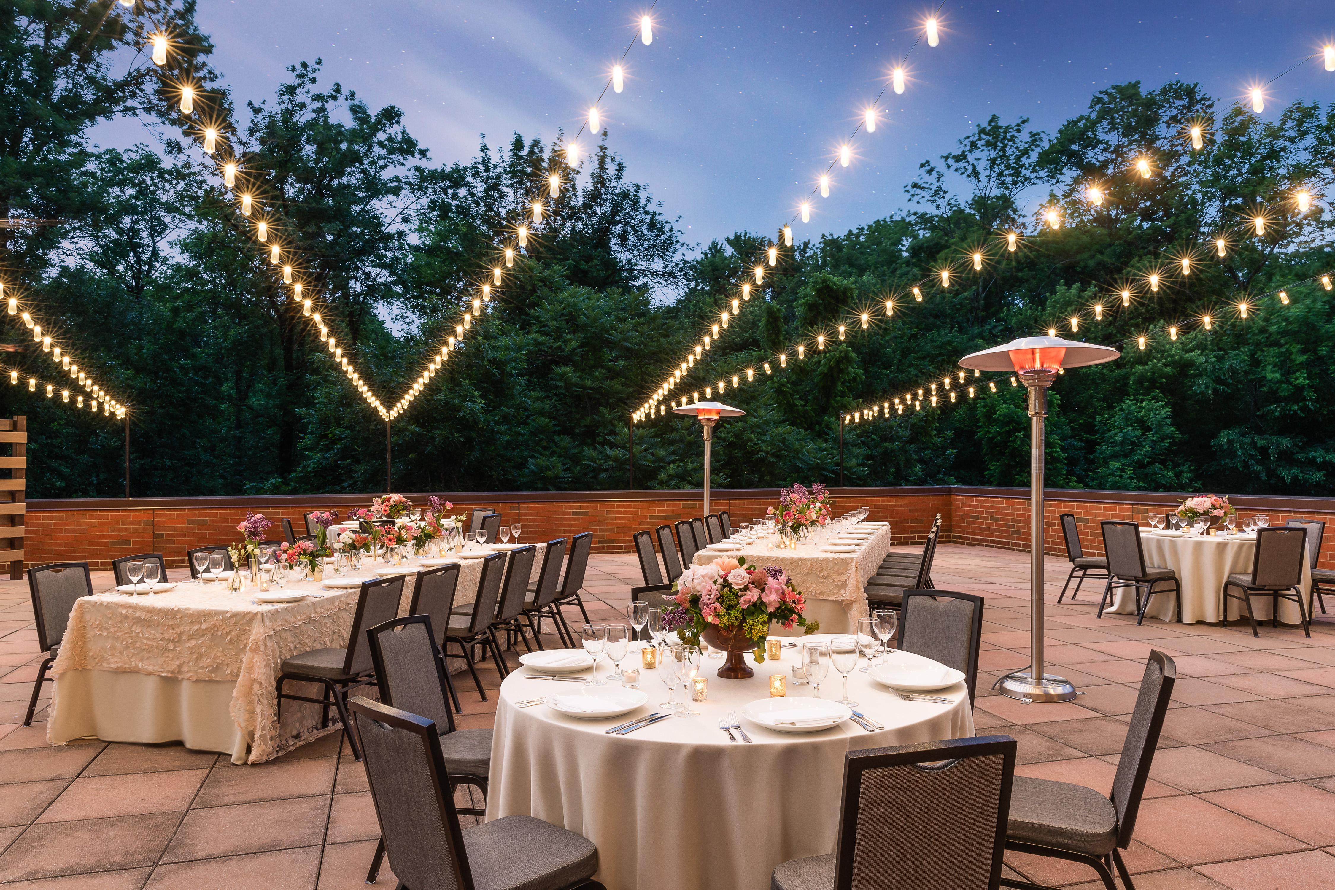 The Pavilion is a covered and temperature-controlled indoor/outdoor space. Its bright interior and contemporary overhead light fixtures provide a contrast to the drama of the Grand Ballroom.