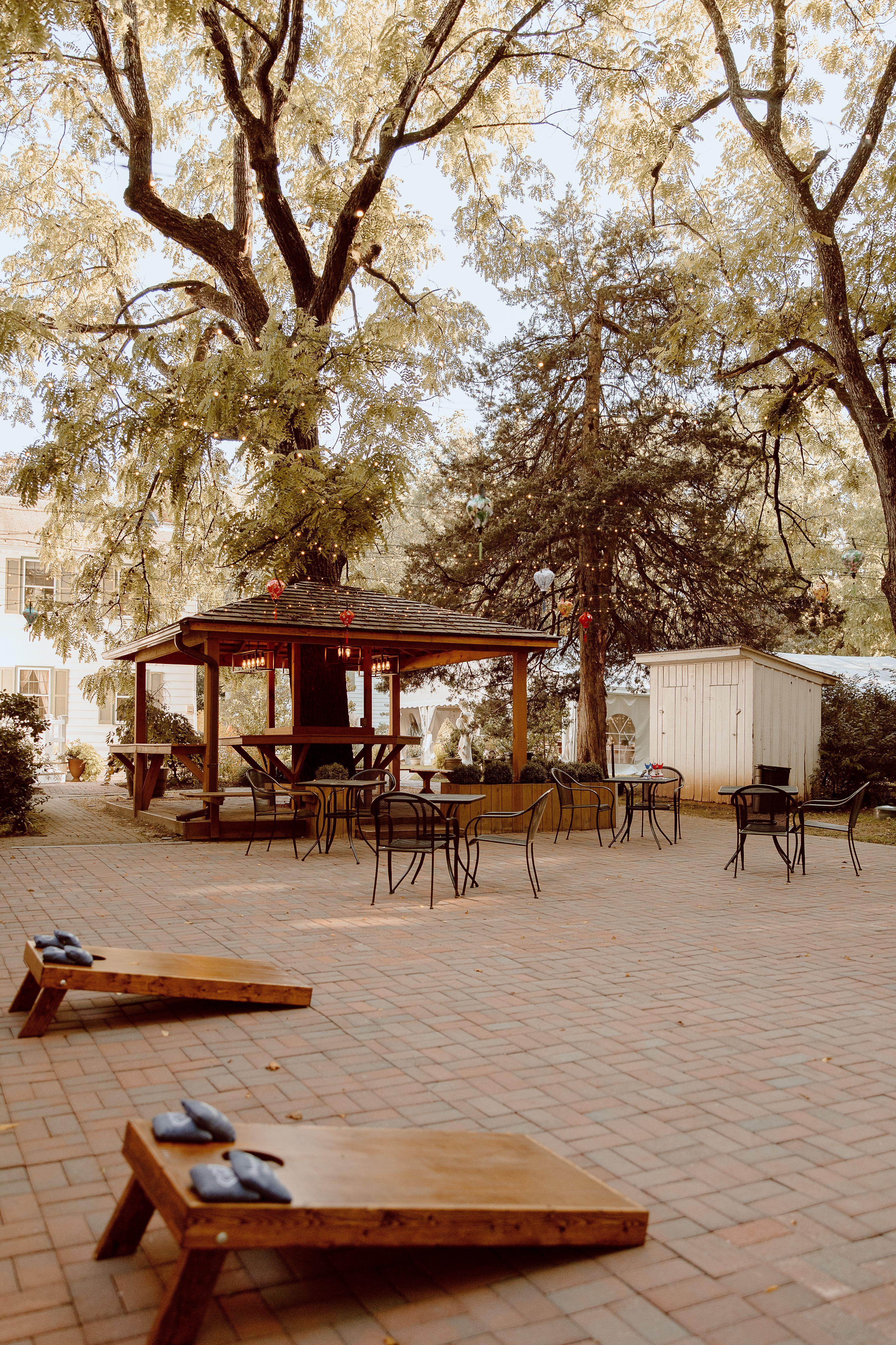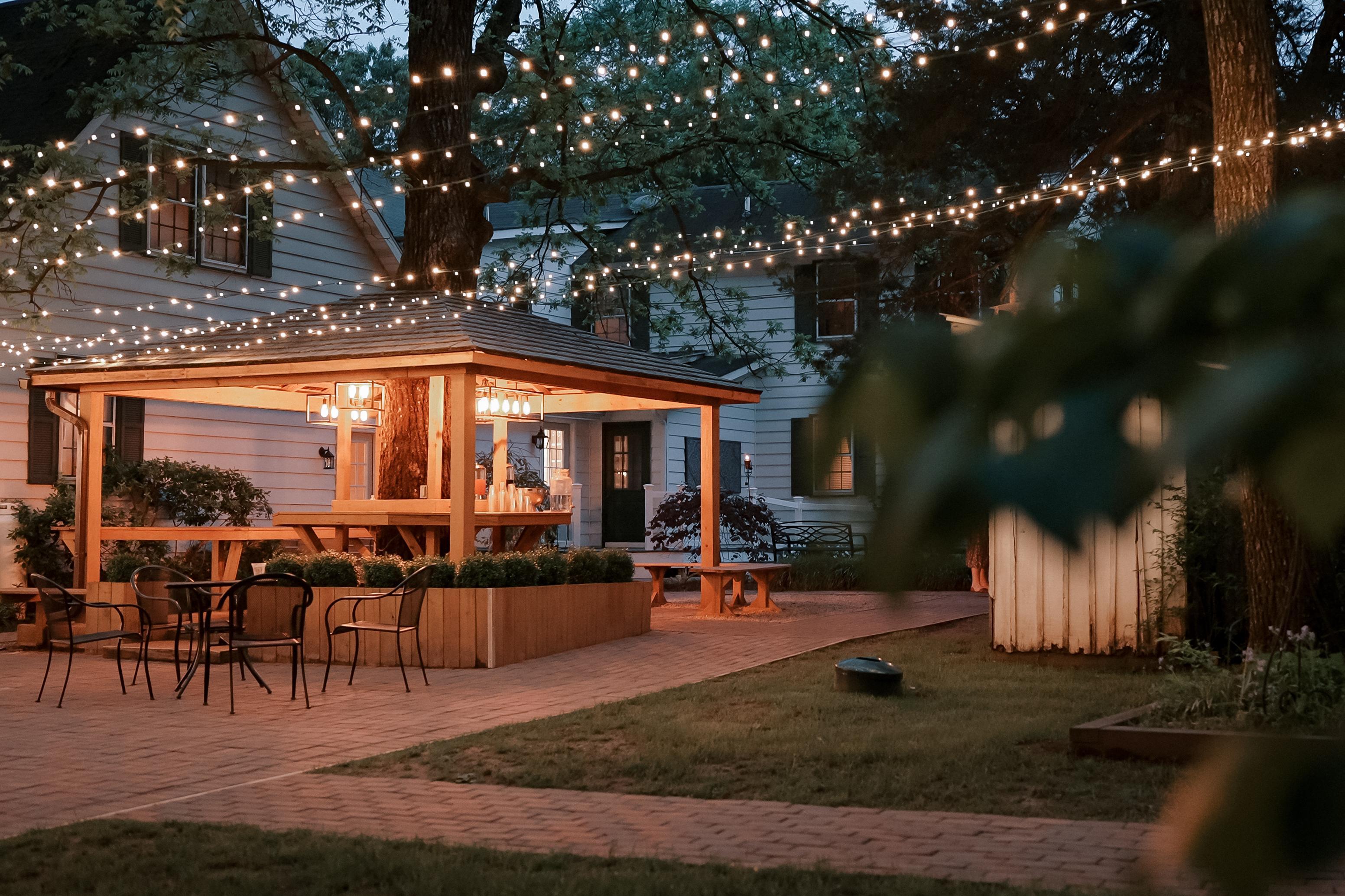 - Covered terrace with cathedral window sides - Walnut Tree Lounge - Hanging lights - Bistro Tables - Brick flooring - Drapery - Electrical outlets