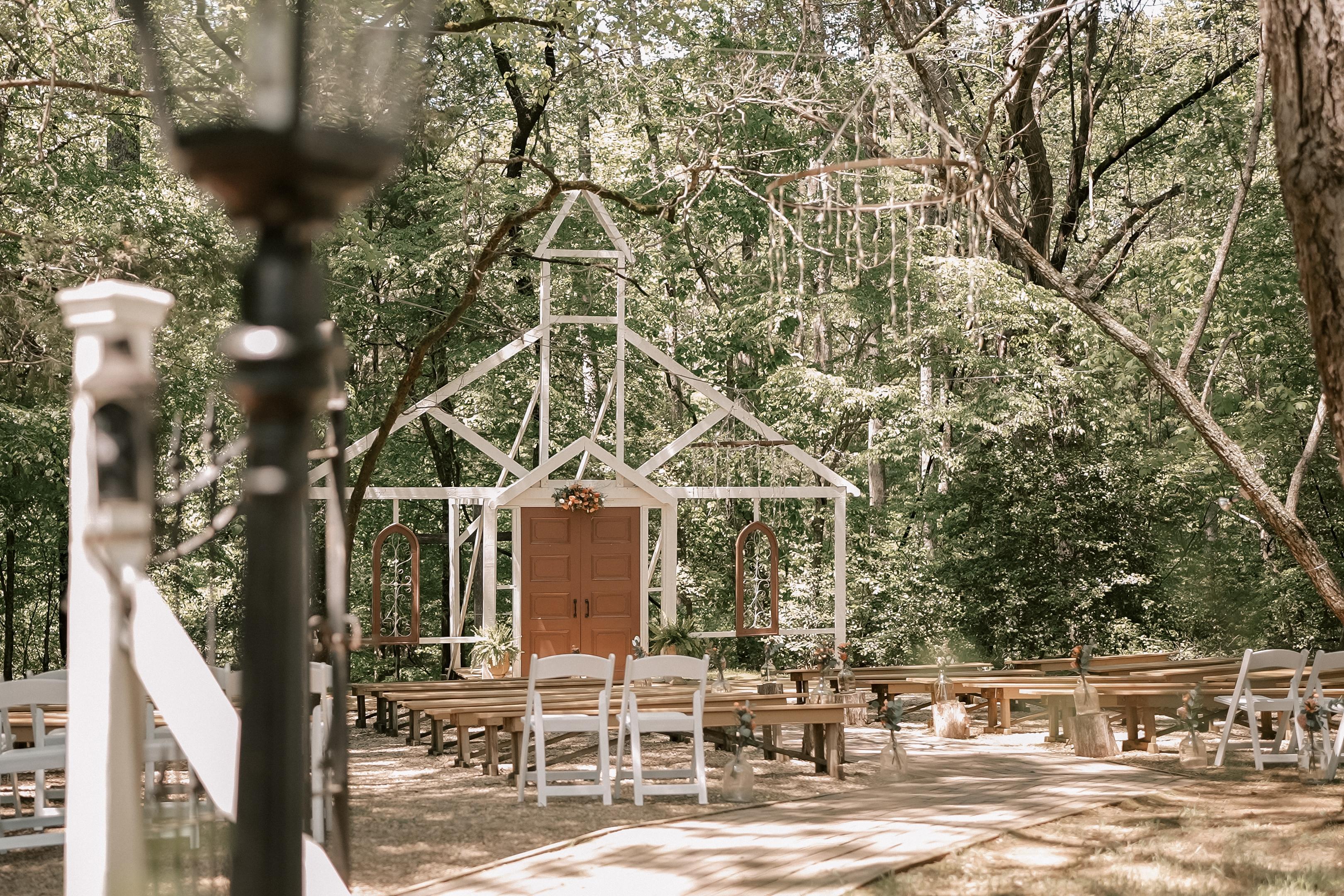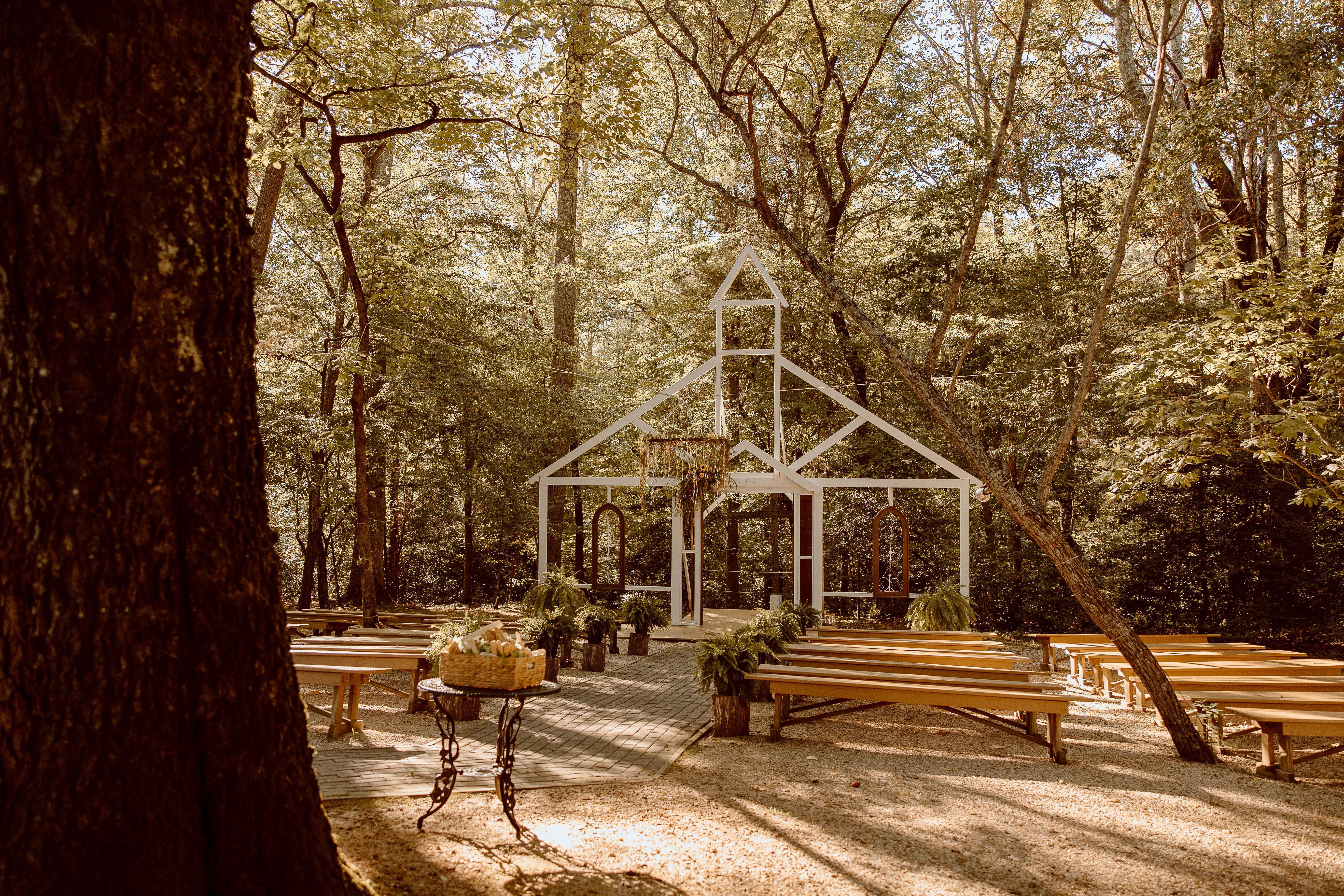 A wooded ceremony site that features a white chapel facade set amongst a forest canopy. The site also includes a brick walkway for the grand entrance and permanent benches for up to 150 guests. Additional seating can be added as needed based on guest count.