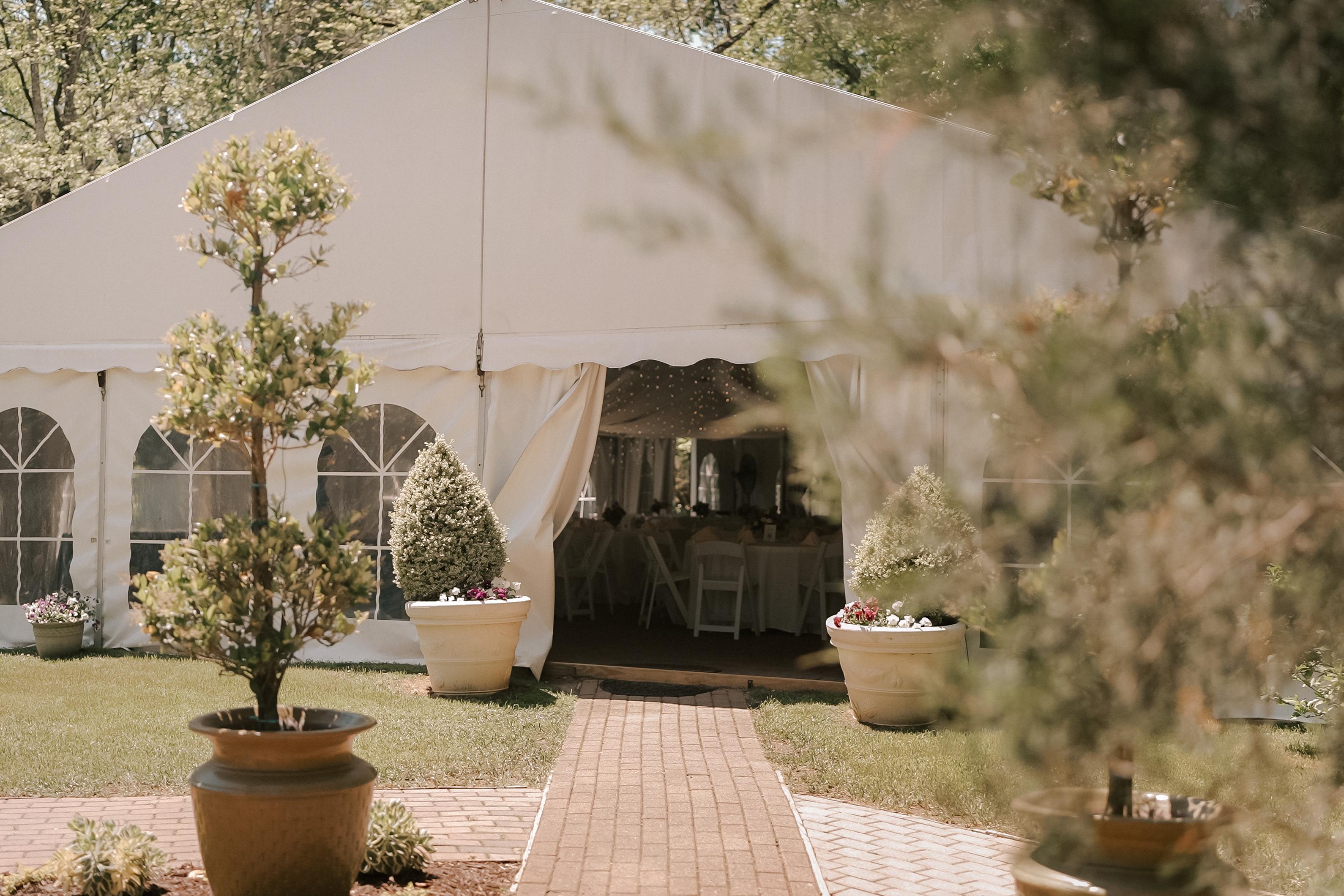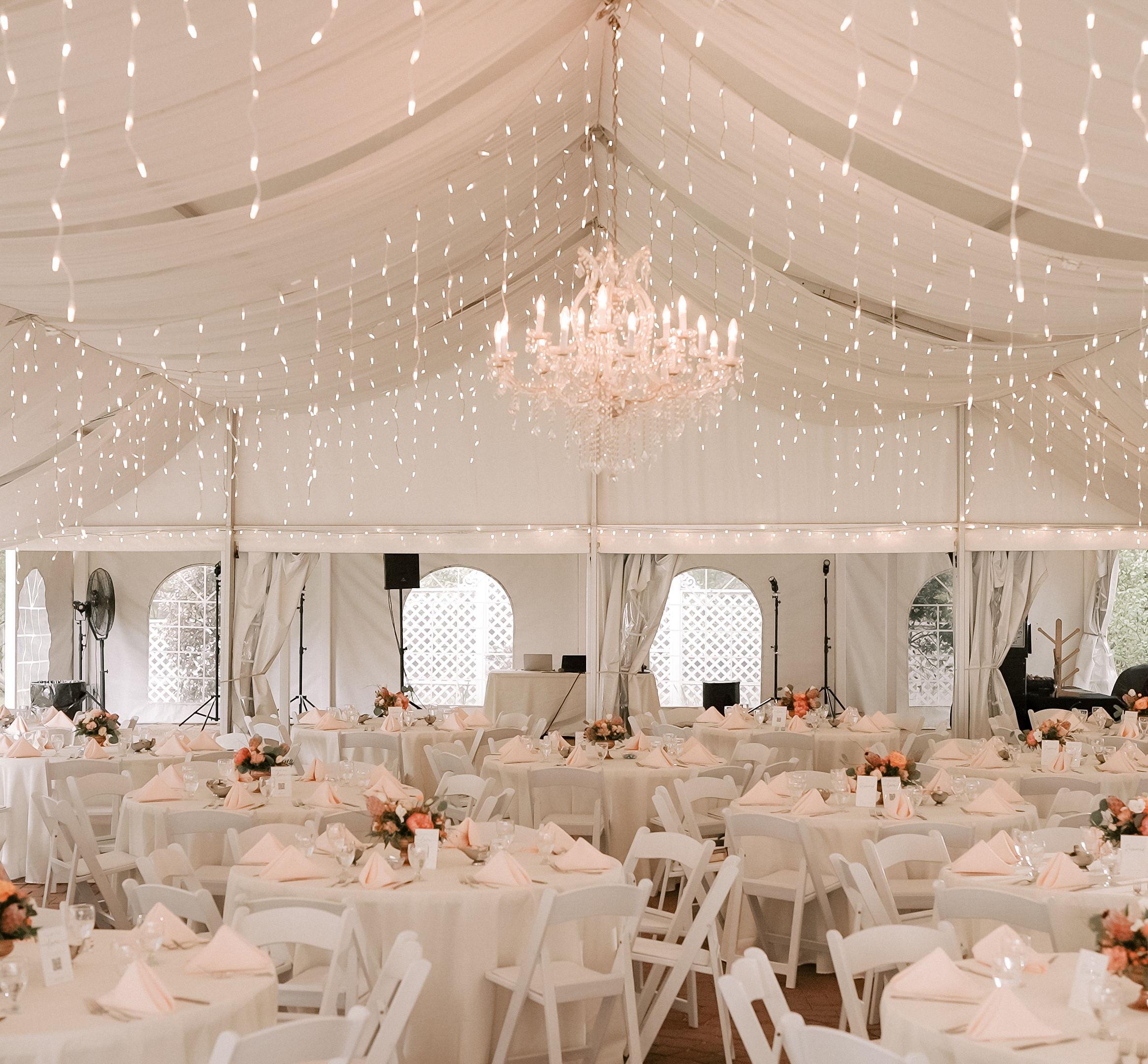 Our permanent marquee tent includes brick flooring, a crystal chandelier, hanging lights, and beautiful drapery. Also features an adjacent covered bar area and a covered pavilion for additional seating, catering, etc. In colder months, the tent can be heated.