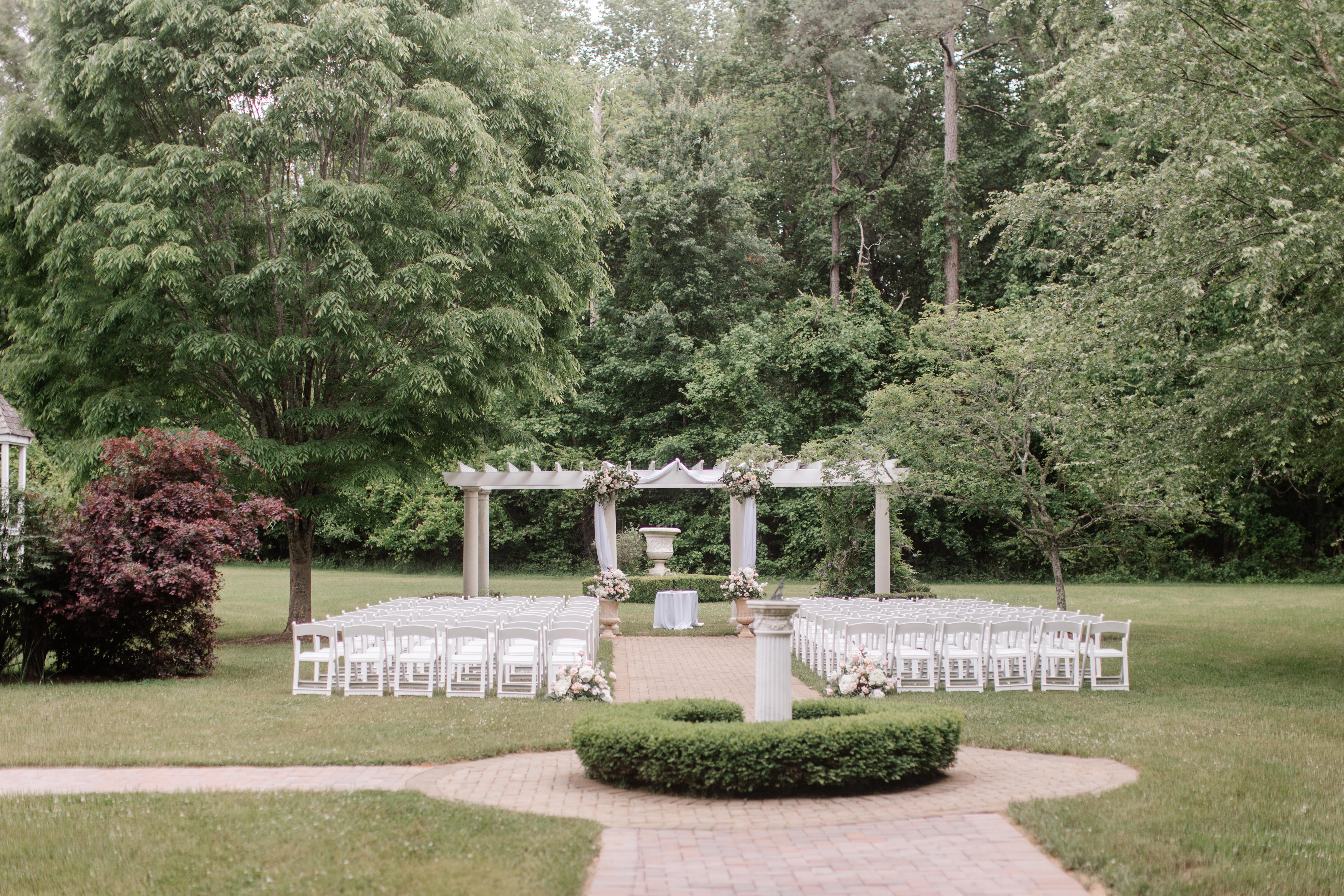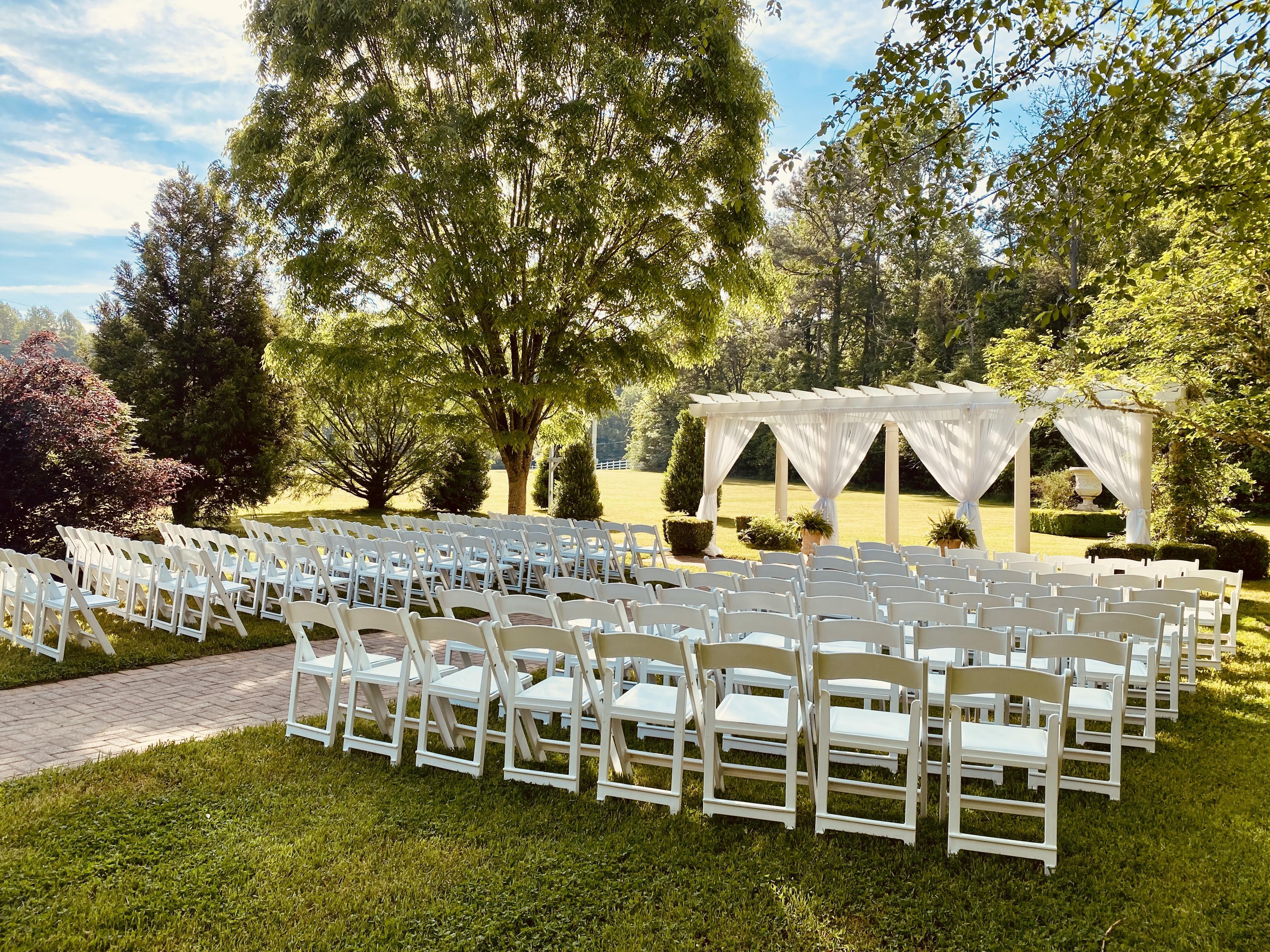 The garden pergola ceremony site is set against a lush green landscape of fields and trees. The 8-pillar pergola can be decorated with drapery, flowers, and more. This site features a pond area with a footbridge for the grand entrance as well as a brick pathways. Premium white padded chairs are included at the site.