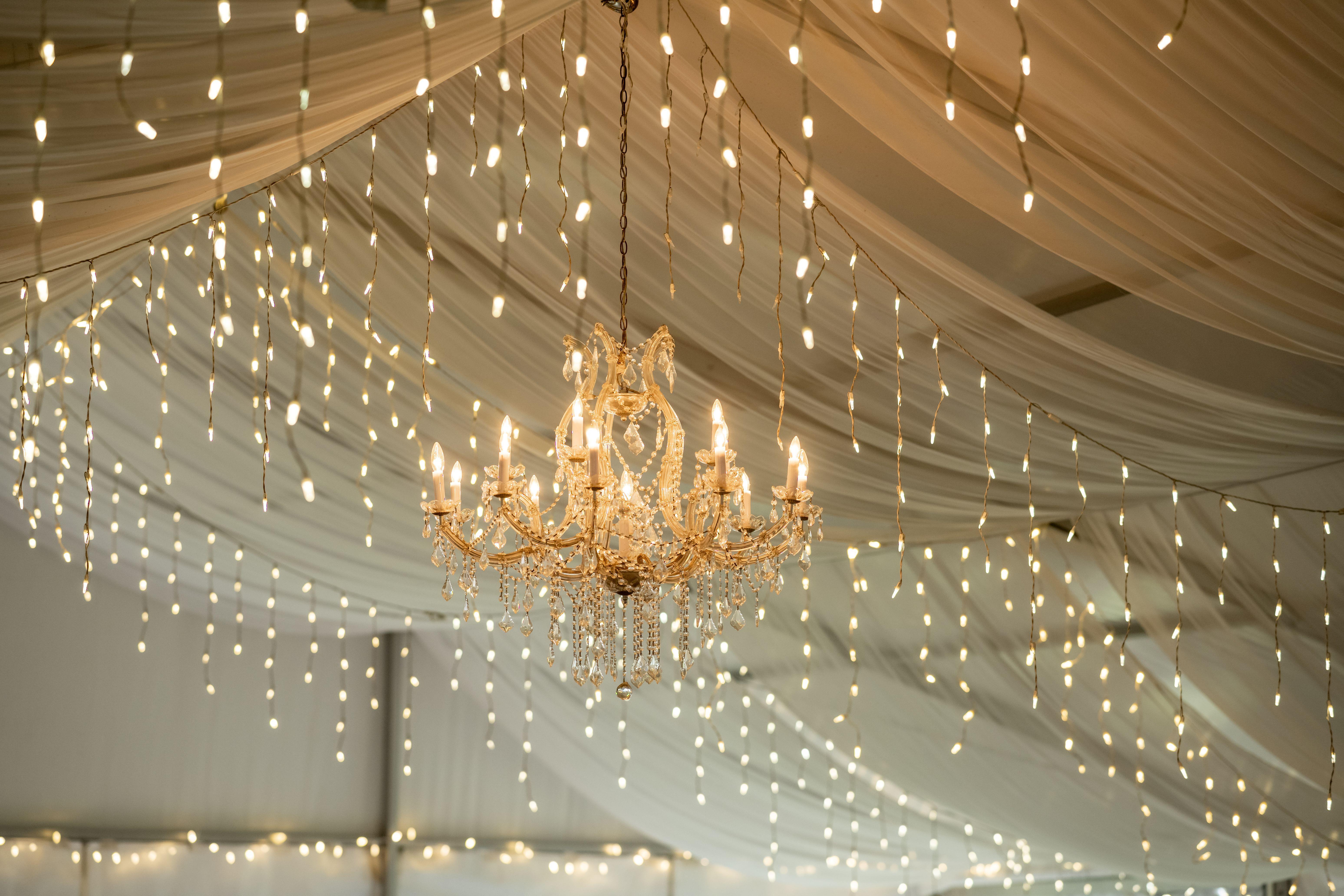 - Tent with cathedral window sides (40ft x 60ft) - Brick flooring - Chandeliers - Hanging lights - Ceiling drapery - Pub-inspired bar house - Pavilion (40ft x 24ft) attached to the tent for catering, additional seating, etc. - Electrical outlets