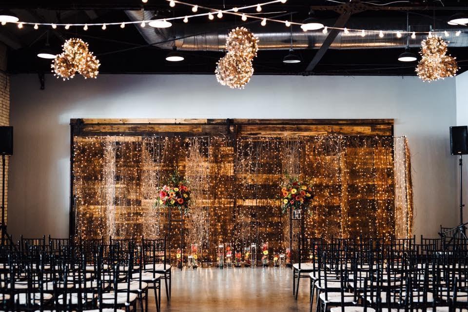 200 Black Chiavari Chairs, Market Lights, Reclaimed Wood Wall Ceremony Backdrop, White Foyer Draping and access to our VIP Getting Ready Suite.