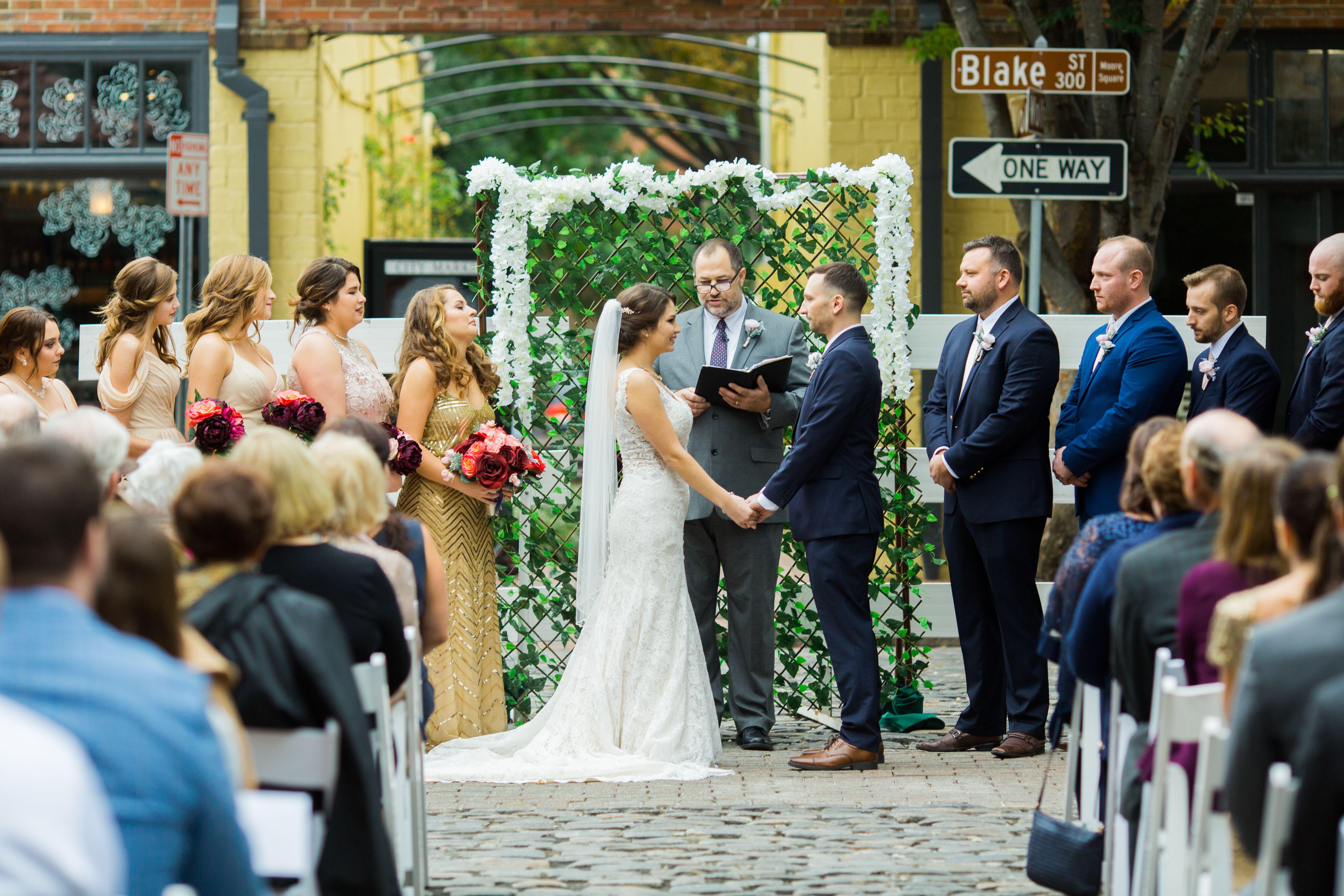 Hosting your ceremony or cocktail hour on our historic cobblestone streets provide a memorable experience for you and your guests and allows you to enjoy the views of City Market and Moore Square beneath the shining market lights!