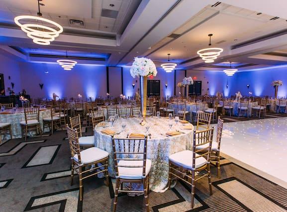 Our hotel houses 13 flexible function rooms, including a Grand Ballroom and our business center with printing services. We have free parking and an event planning team to guide you through catering options and A/V equipment rental. Work with our planners to create your dream wedding with personalized touches. Our event spaces can accommodate ceremonies and receptions of up to 400 guests, and we have plenty of unique photo opportunities, including the library, pool cabana areas, glass elevators, and outdoor gazebo.