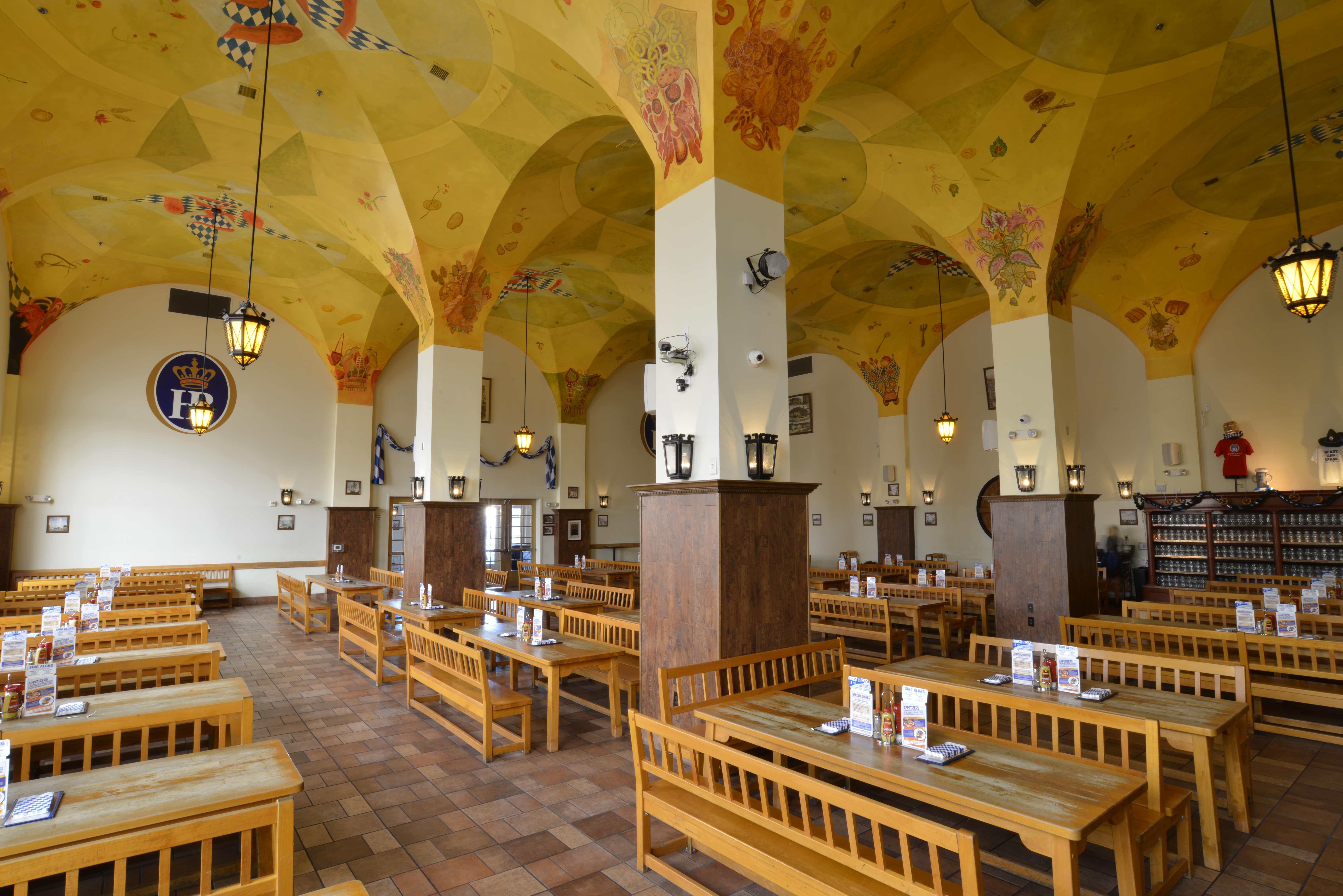 The Schwemme at Hofbrauhaus Las Vegas, a 1:1 copy of Hofbrauhaus in Munich, Germany seats approximately 380. The benches and tables are of sturdy European construction and are designed to withstand the weight and revelry of repeated guests, whether seated or standing high with steins aloft. The beer hall ceiling is an exact copy from the original and features the same images as its predecessor; no graphic is repeated--each is unique with no duplication.
