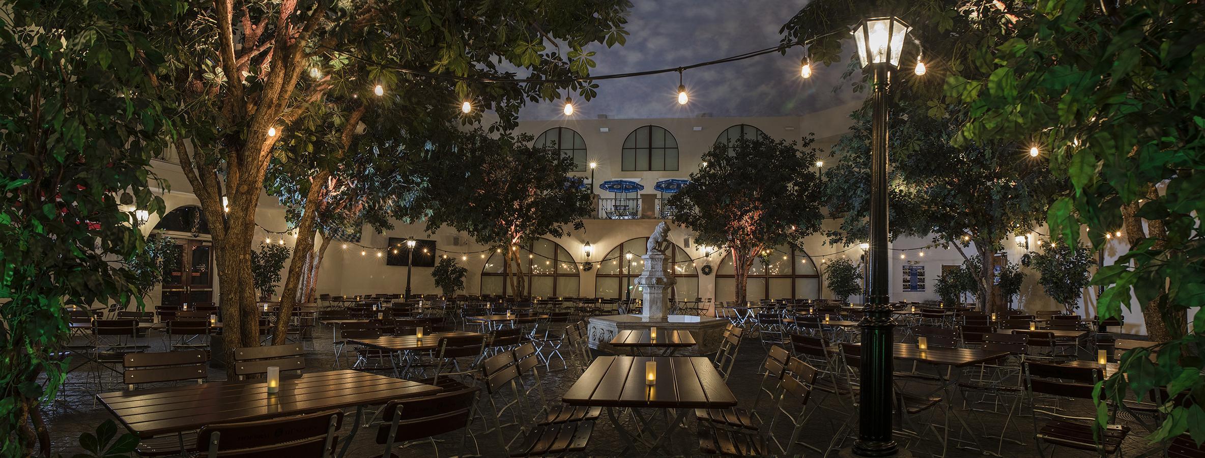 Our indoor Biergarten has authentic patio seating, twinkling lights, and a beautiful fountain that sets the mood & can be customized for any occasion!