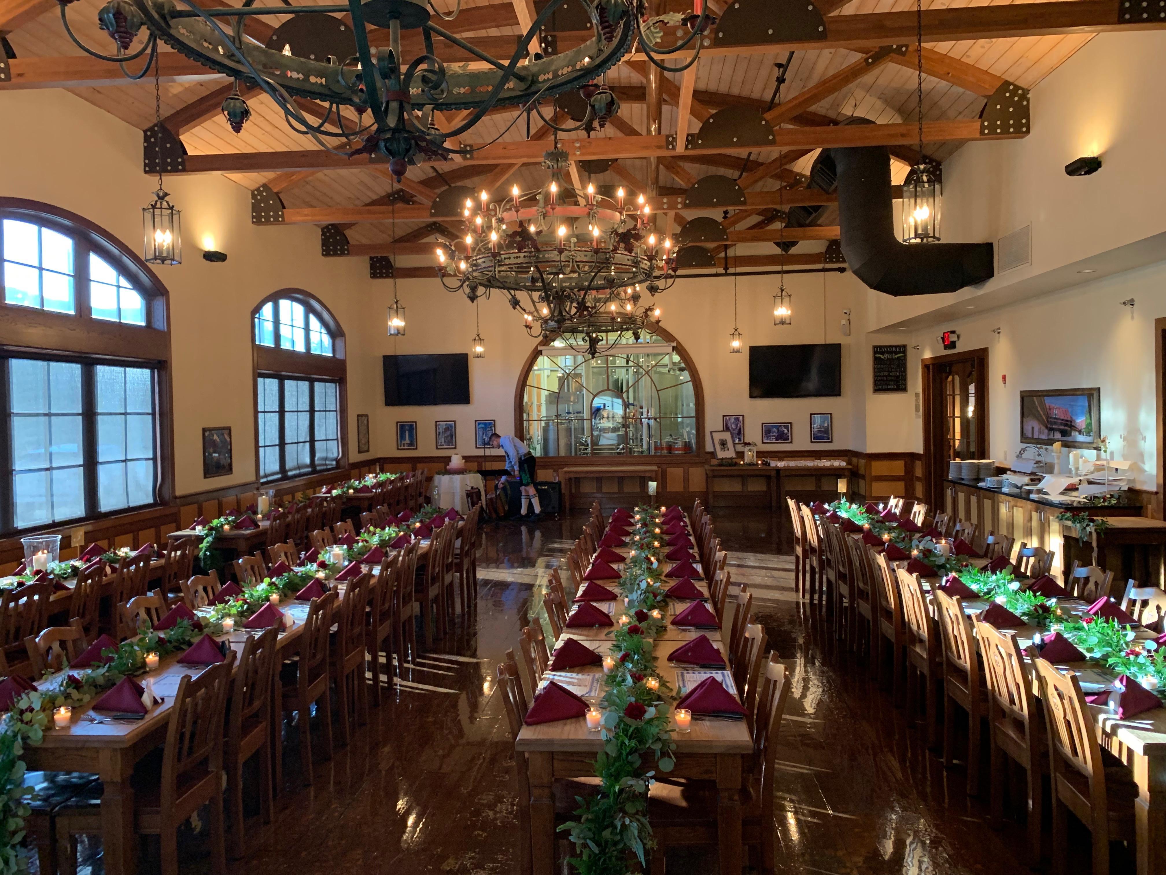 The Stube features a large paned window into our brewery with beautiful wooden accents and large chandeliers imported from Germany.