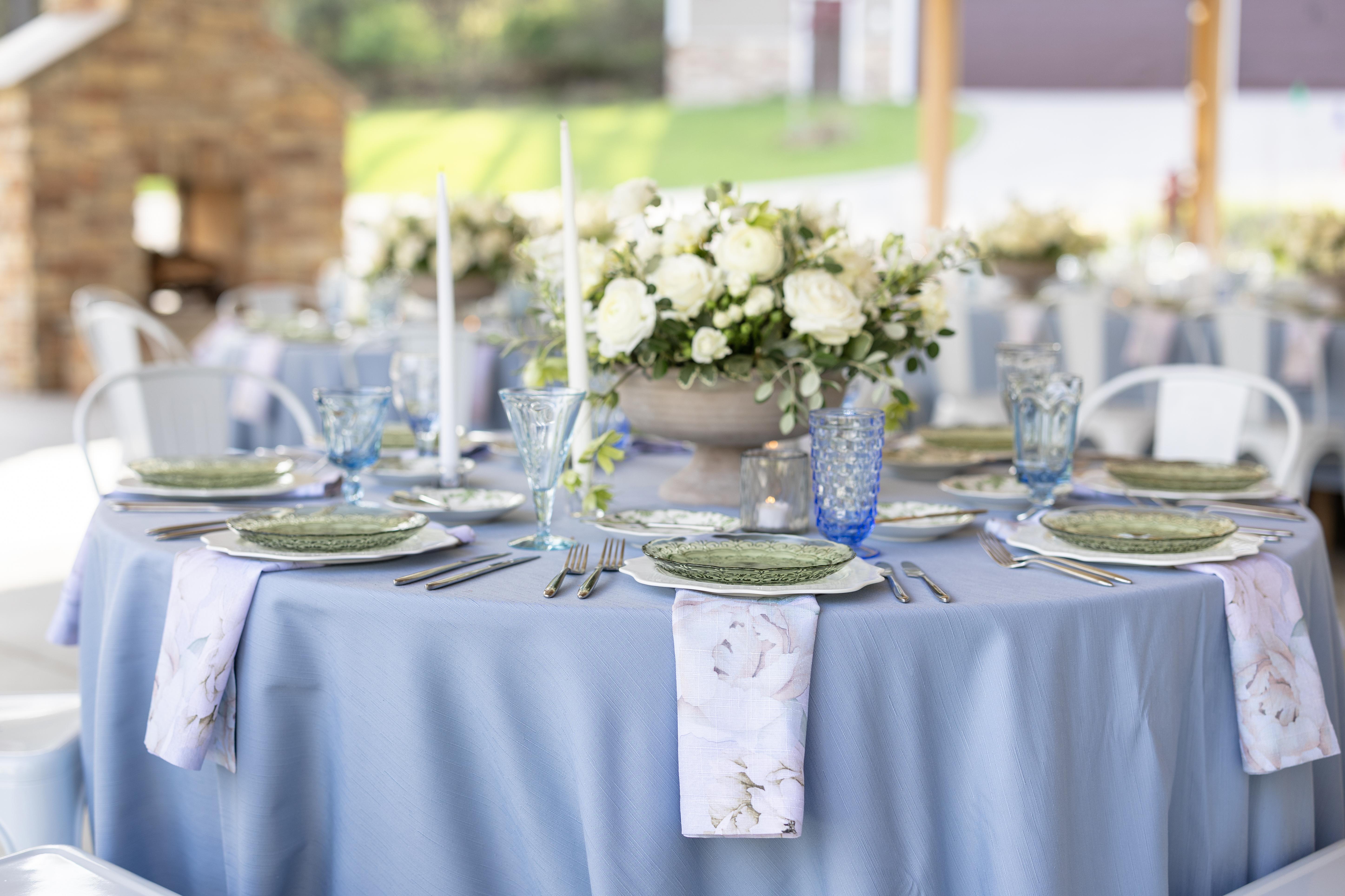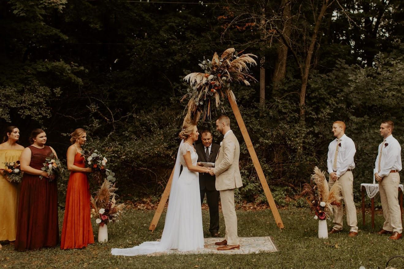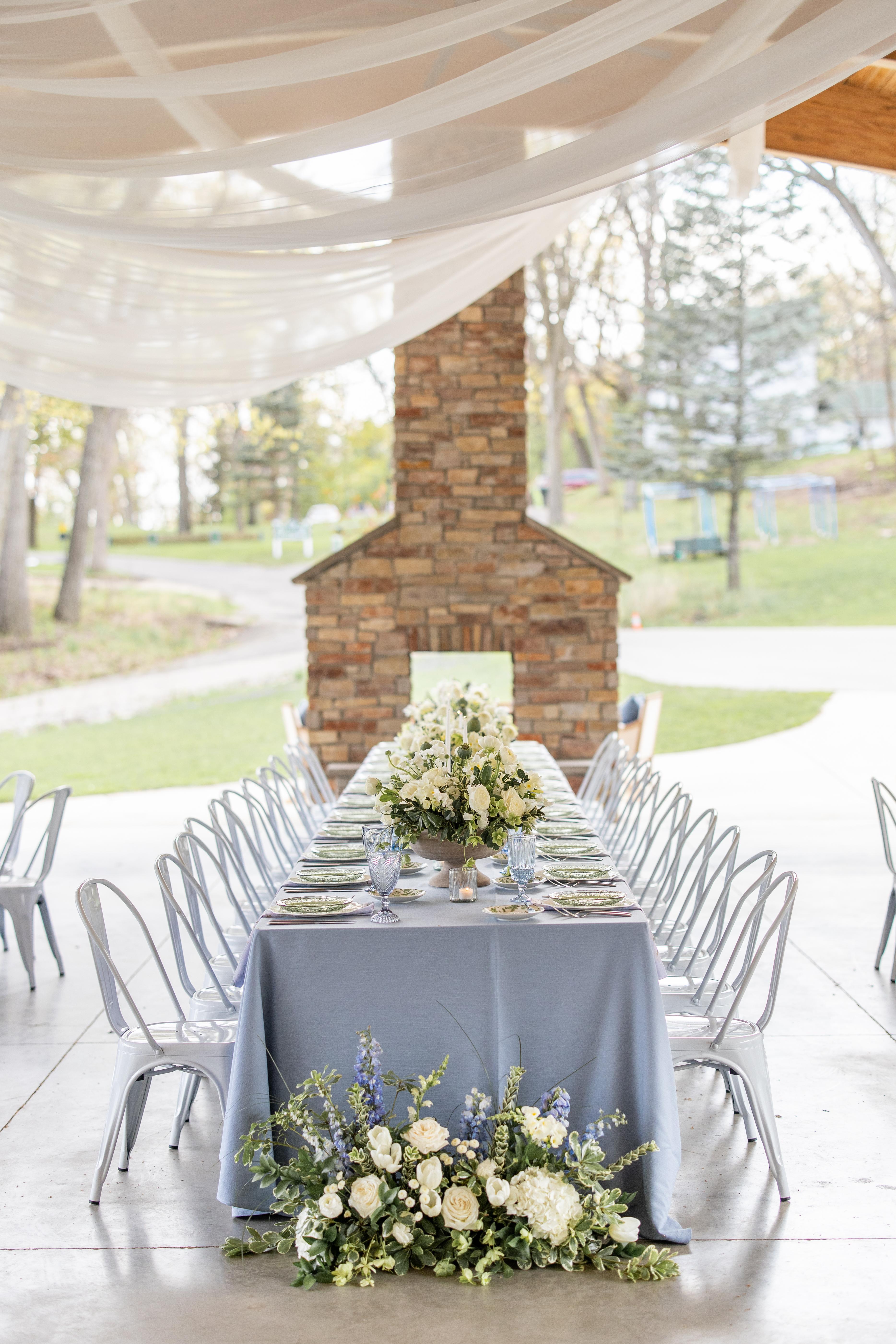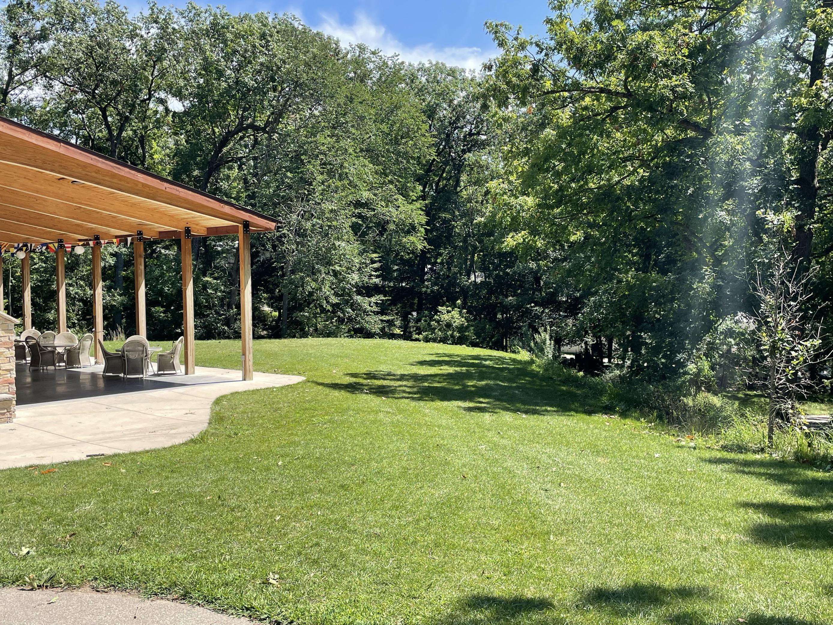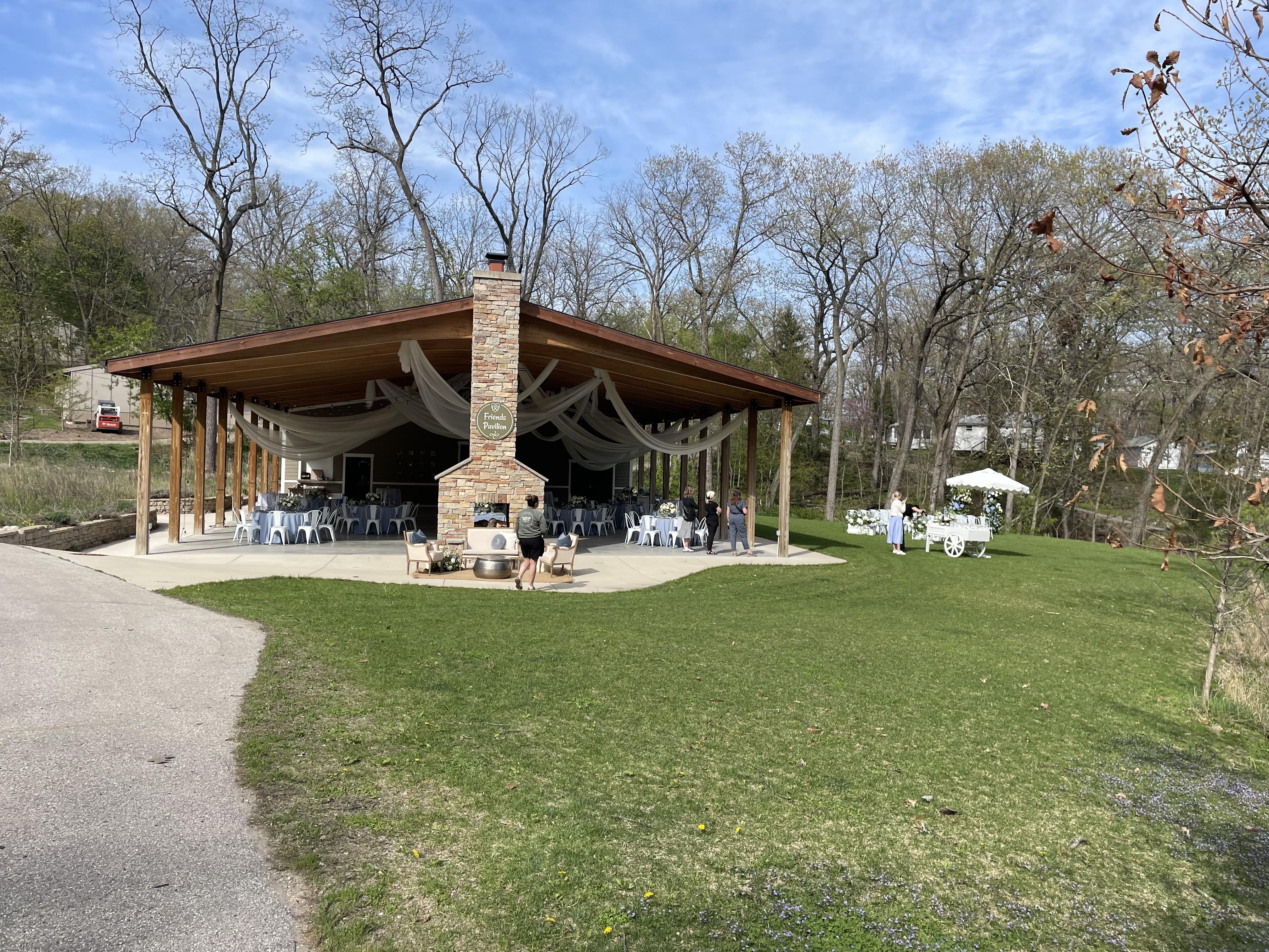 This space features an outdoor wedding space while still be covered under the pavilion. There is also a field next to the pavilion with ample space for a beautiful ceremony.