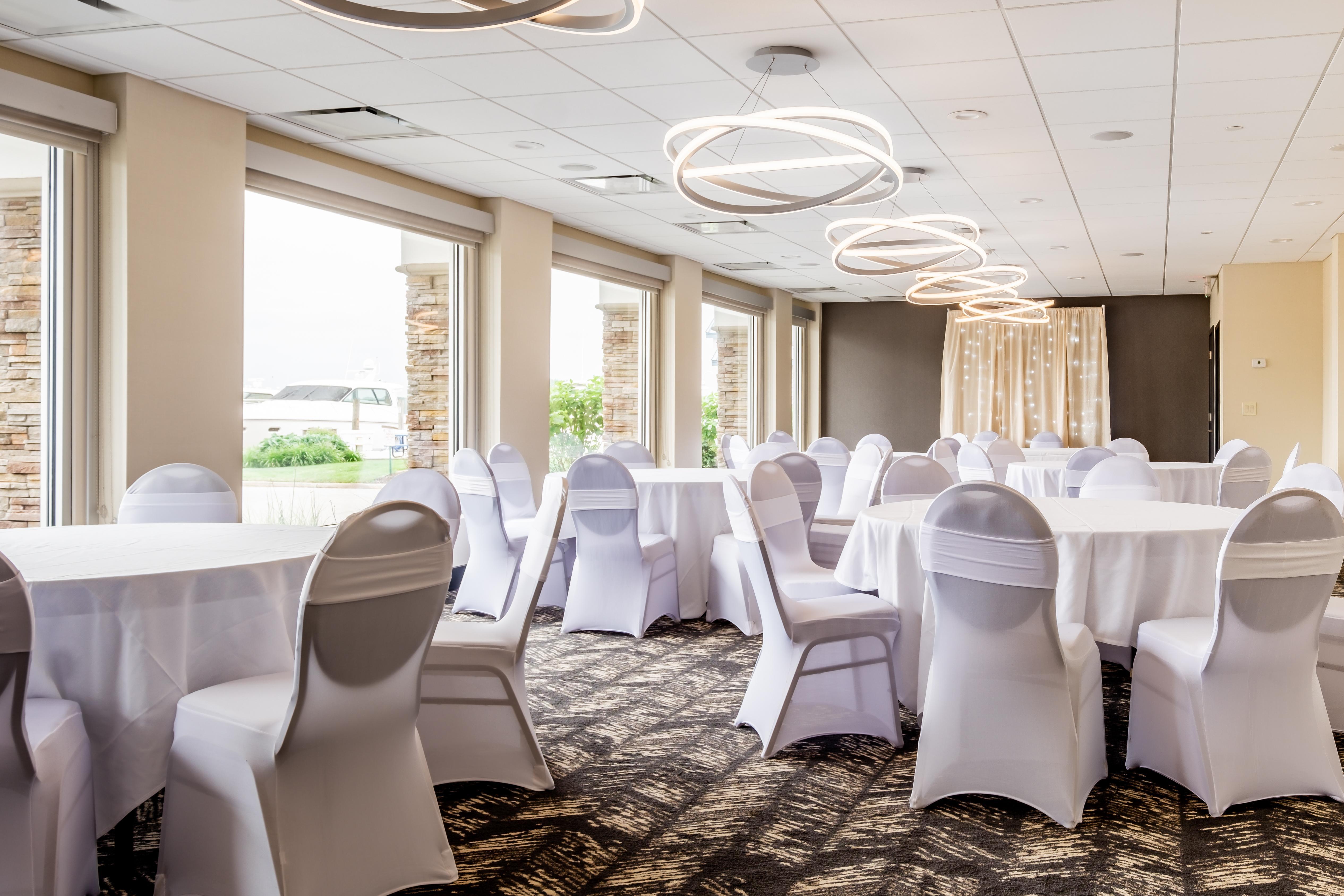 Overlooking the Grand River in Spring Lake, MI, the Holiday Inn Grand Haven/Spring Lake is the premiere full-service hotel and wedding venue in the area. The Waterfront Ballroom features panoramic views of the waterfront and 3,600 square feet of ambiance. Exclusive access to the adjoining 3,000 square foot deck allows for the ultimate indoor-outdoor experience. This one-of-a-kind space was designed for upscale events and to make dream weddings on the lakeshore a reality. We strive to simplify your wedding planning by offering inclusive yet customizable wedding packages. Our Waterfront Ballroom Package is designed to offer the reception essentials at a flat per person price. Planning a destination wedding or expecting a few out-of-town guests? With updated hotel accommodations, seasonal resort-style amenities, and a wedding venue with rehearsal dinner and post wedding brunch options, our goal is to provide the ultimate wedding-staycation experience for you, your friends and your family.