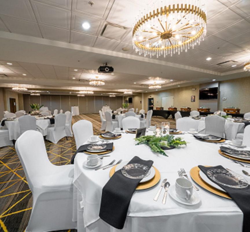 Host corporate and social events in our 4,500 sq. ft. grand ballroom and pre-function area. Our elegant venue divides into three spaces for smaller gatherings. With versatile layouts, catering, and personalized service, we ensure your event is a success! Providing 3,816 sq. ft. of meeting space for up to 300 guests, our spacious ballroom is perfect for weddings, banquets, and large corporate events. This space can be divided into three rooms for smaller gatherings.