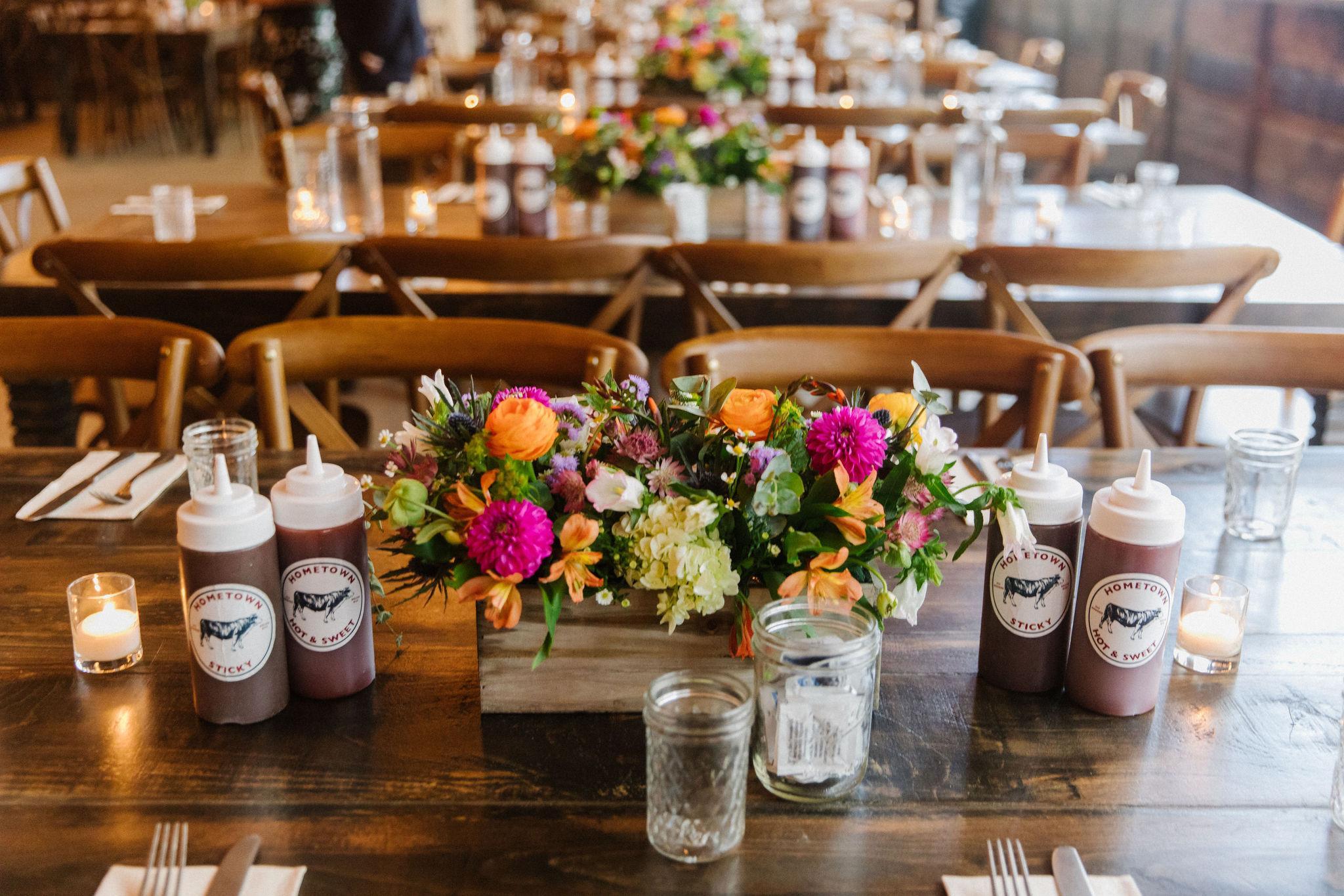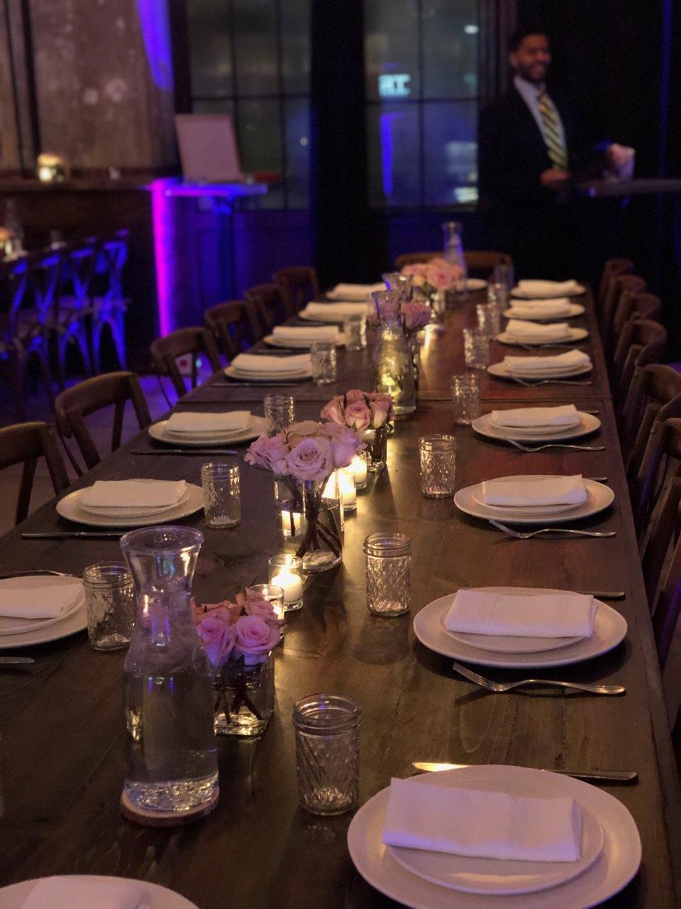 Dimmers for total lighting customizable 25-foot bar large wooden dining tables with chairs Votives and candles China plates, silverware, and serving ware Water carafes and glassware