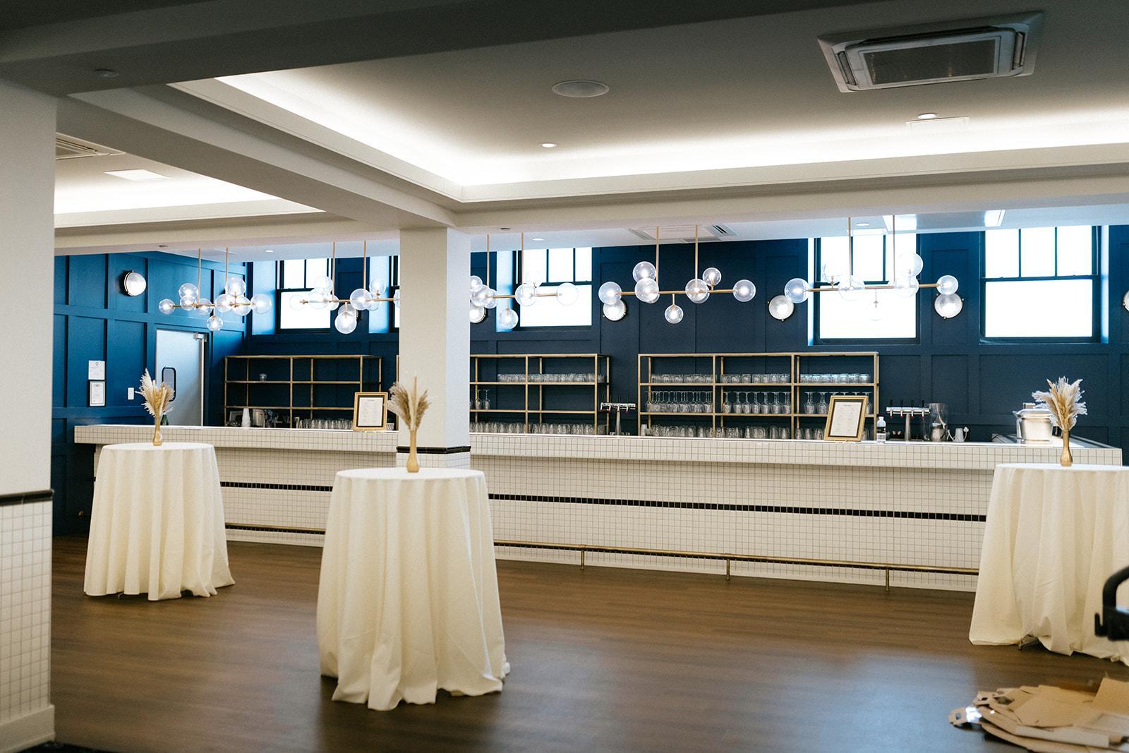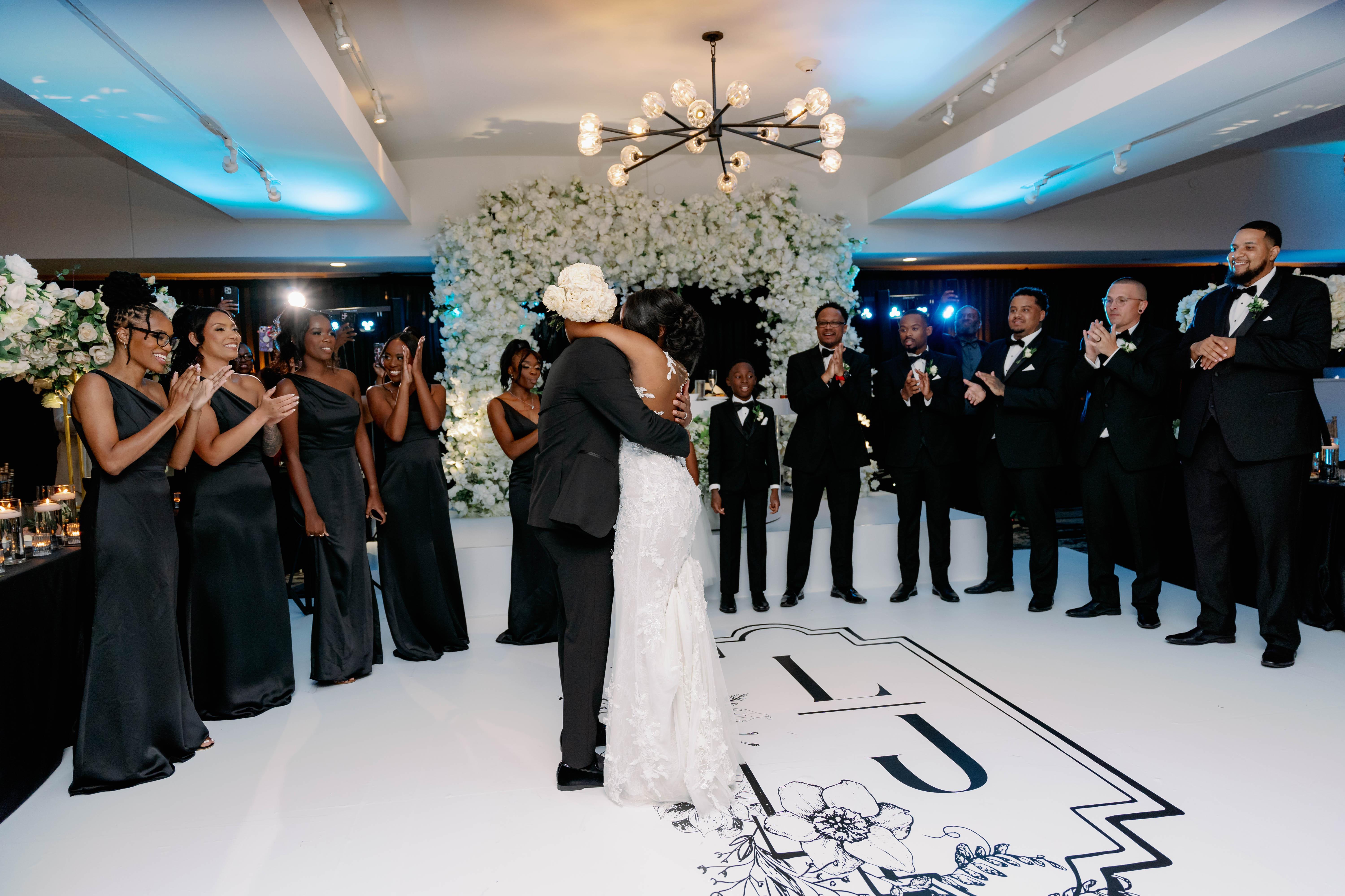 Private Entrance & Lobby Space Lighted Art-Display above dancefloor Built-in Bar + Large Dancefloor Champagne Chiavari Chairs