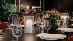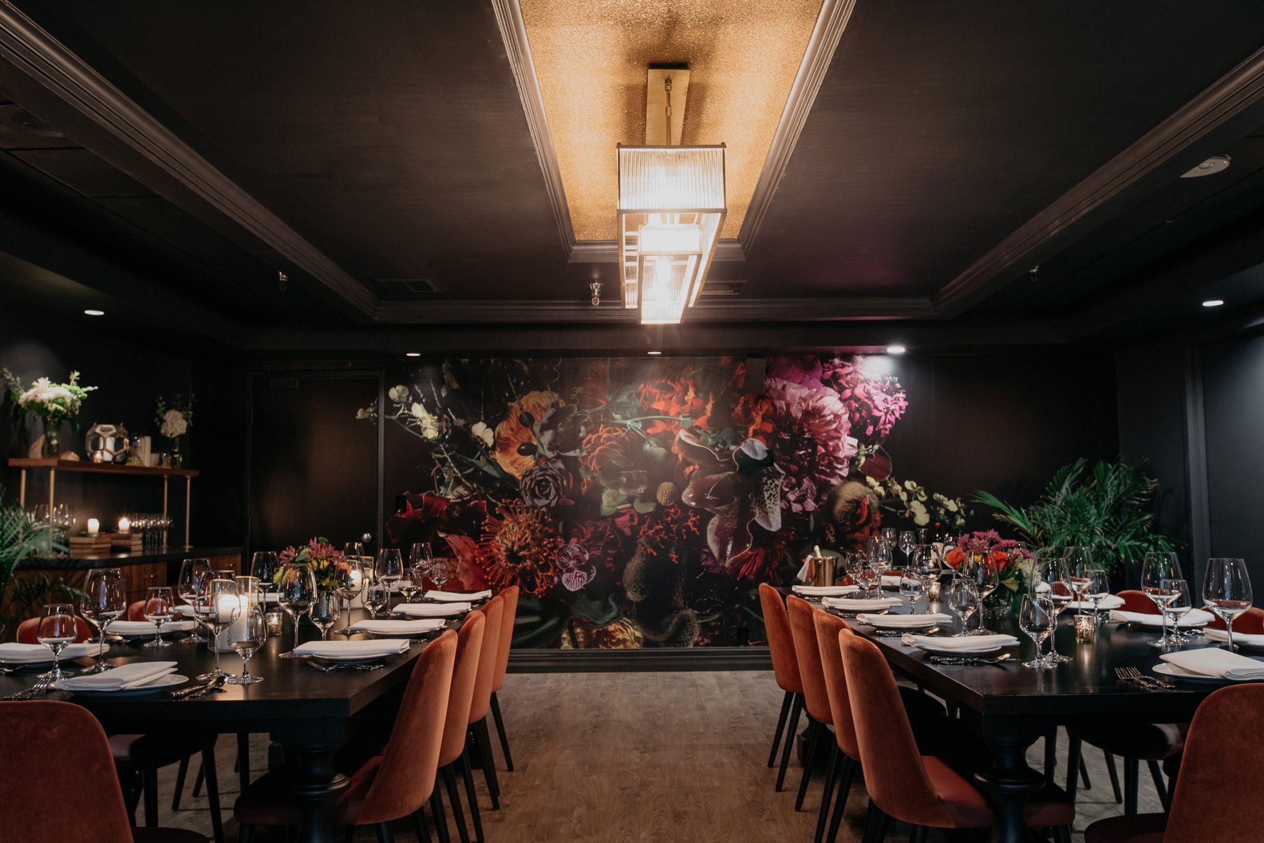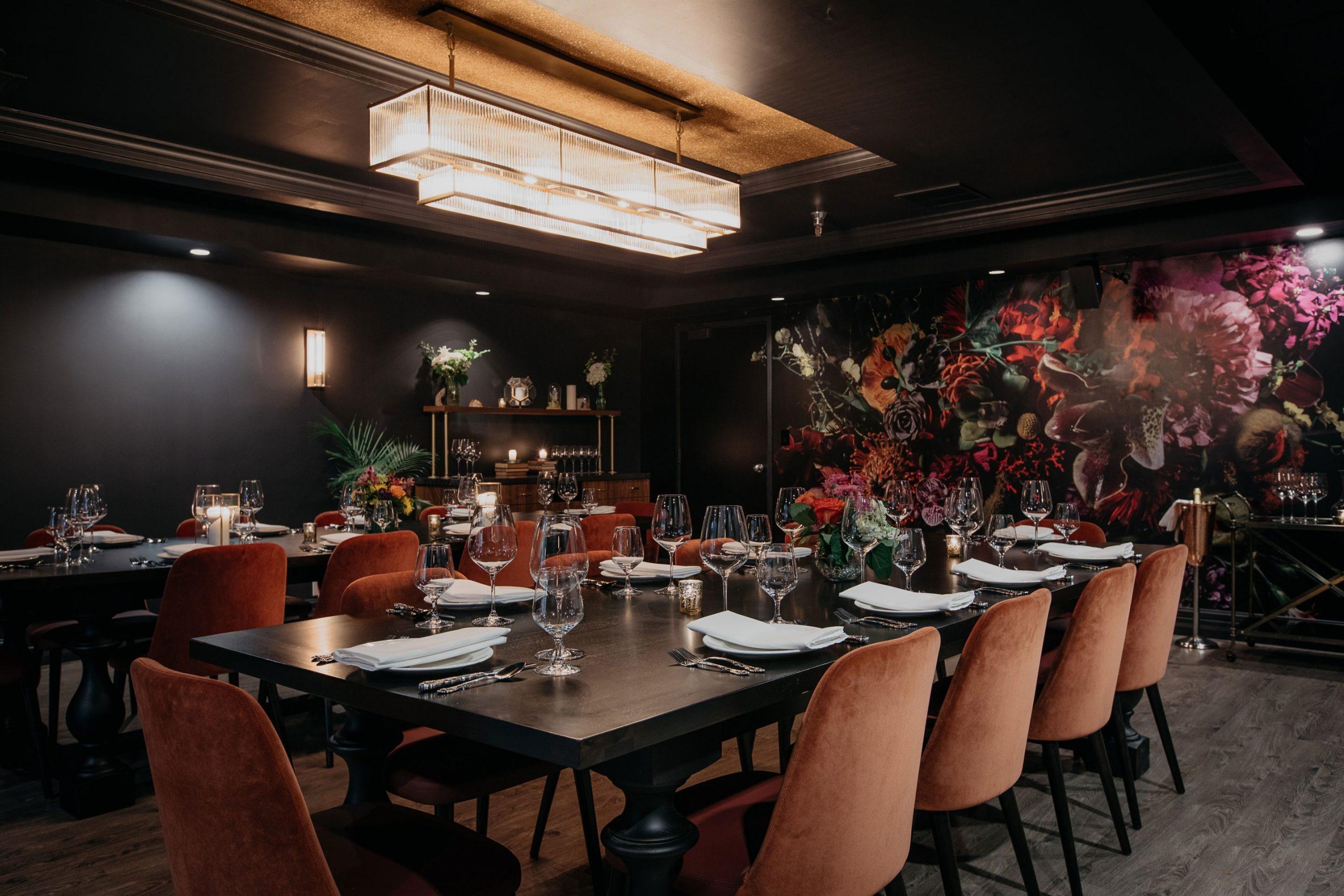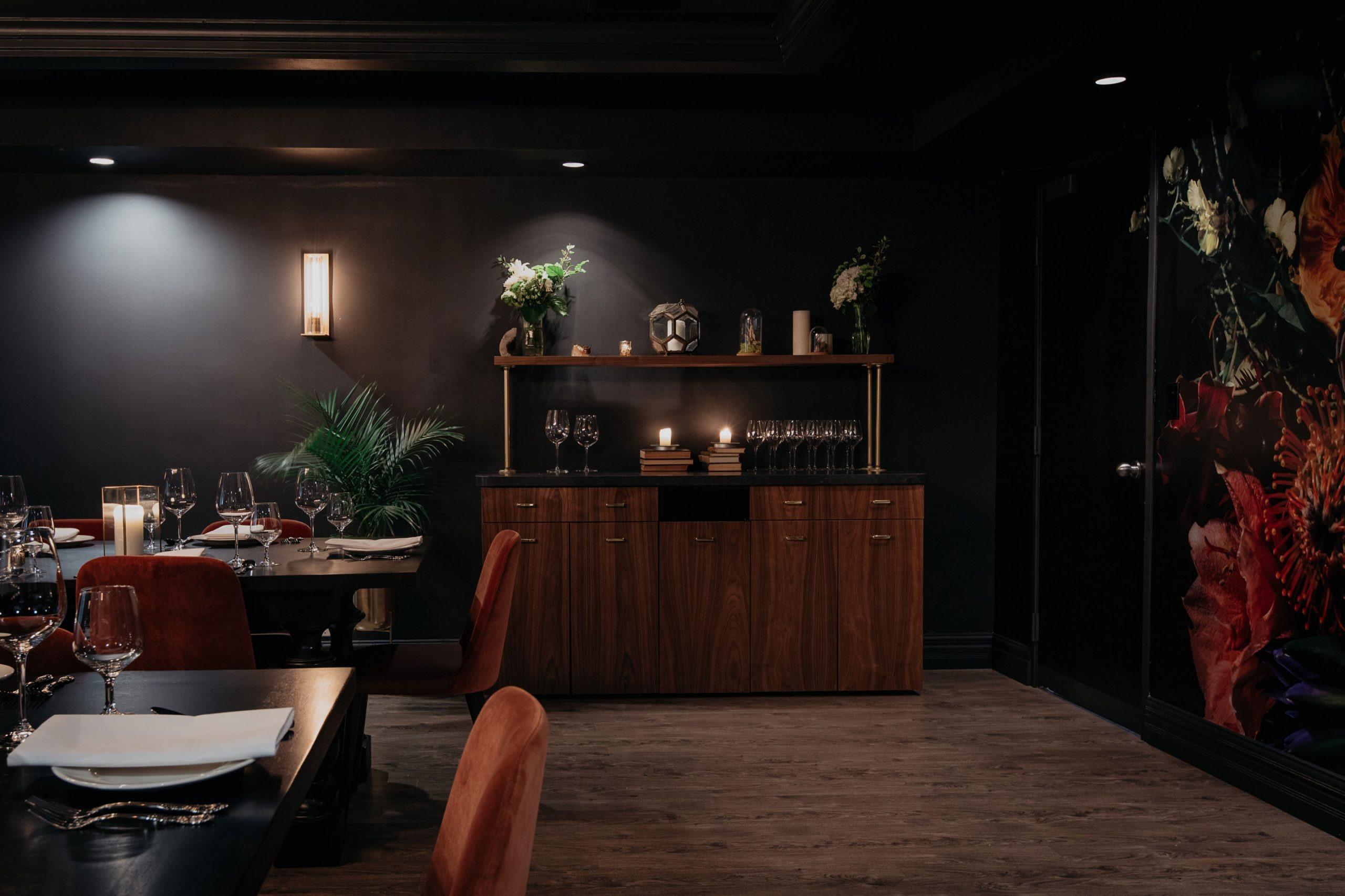 The vivid and lush designs of Monarch Restaurant & Bar are prominent throughout this space with its floral mural and glimmering chandelier. A handsome dark wood table sets the stage for your private dinner, business meeting, or small conference.