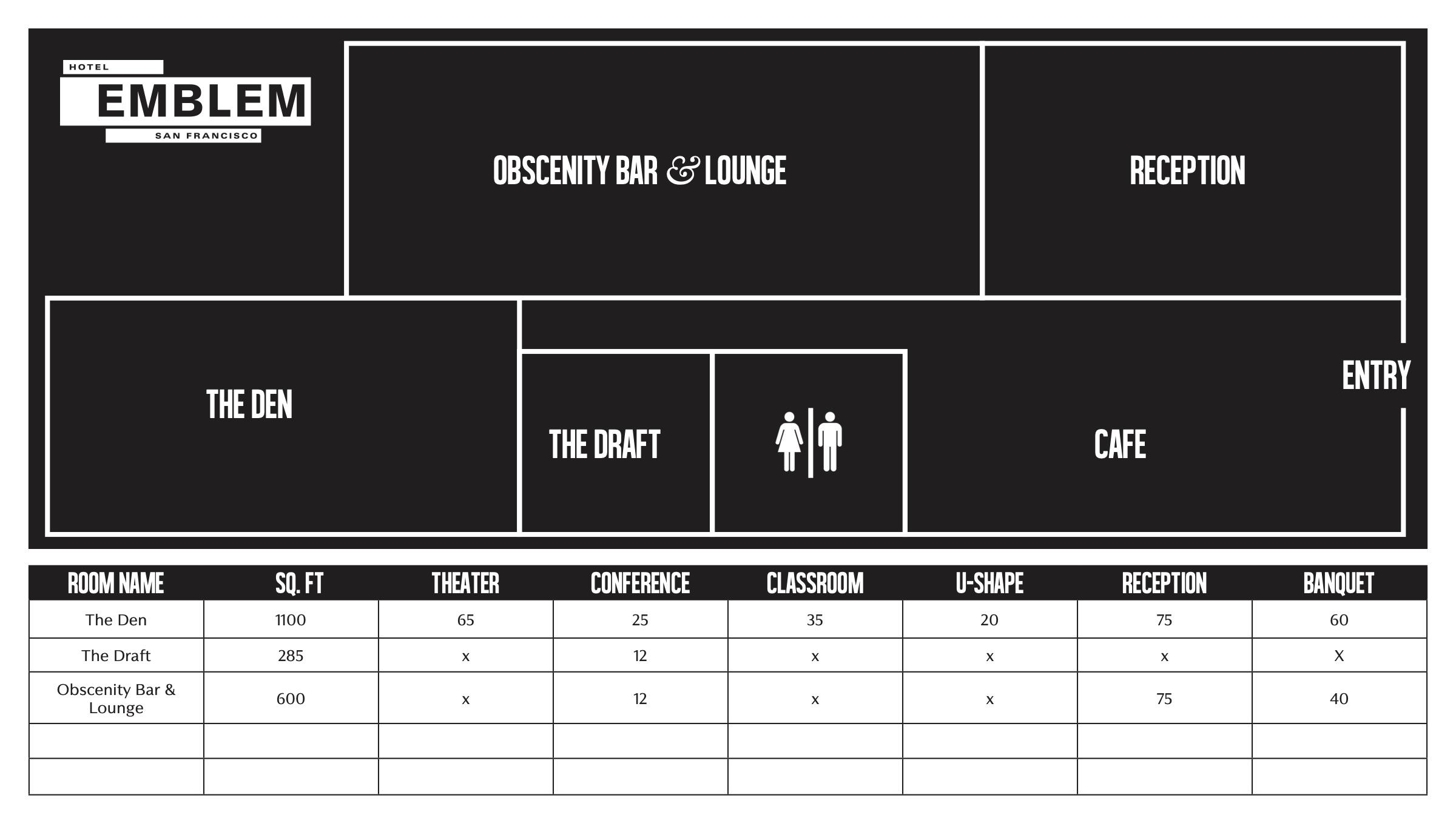Located adjacent to Hotel Emblem's meeting space, Obscenity Lounge offers approximately 600 square feet of space making it ideal for breakfast, informal break-out sessions or custom-crafted cocktails for your event.